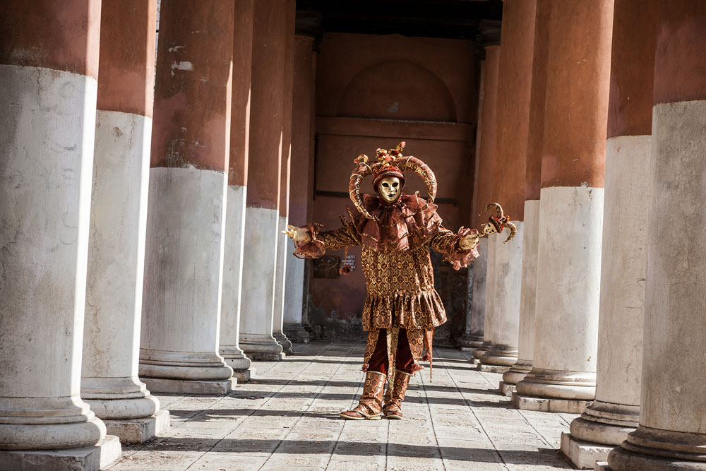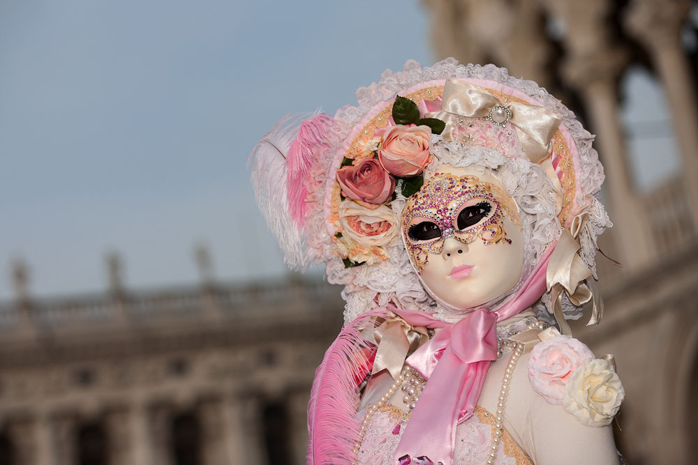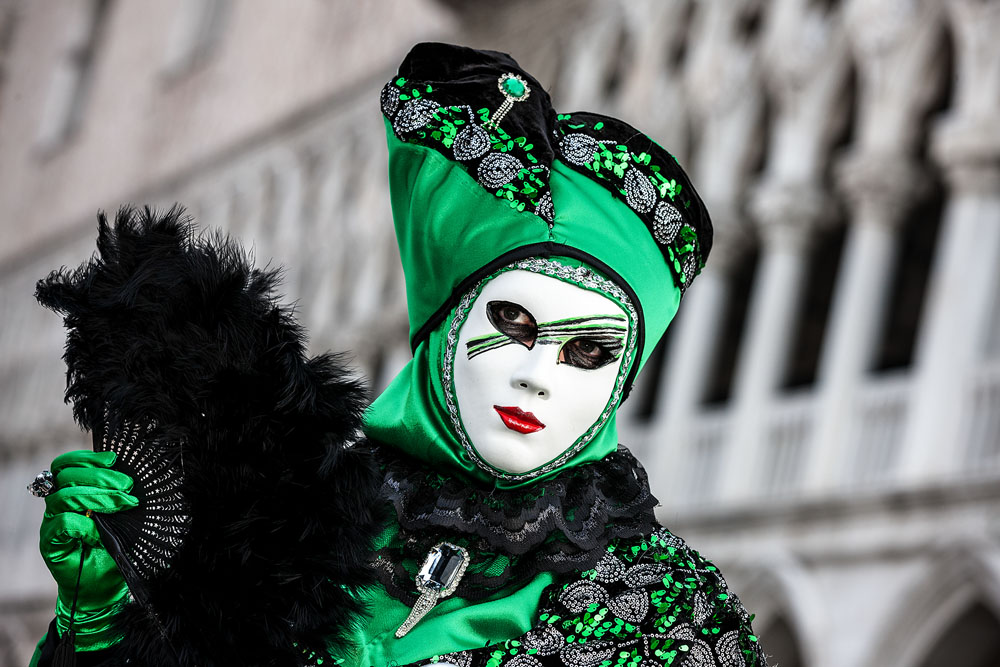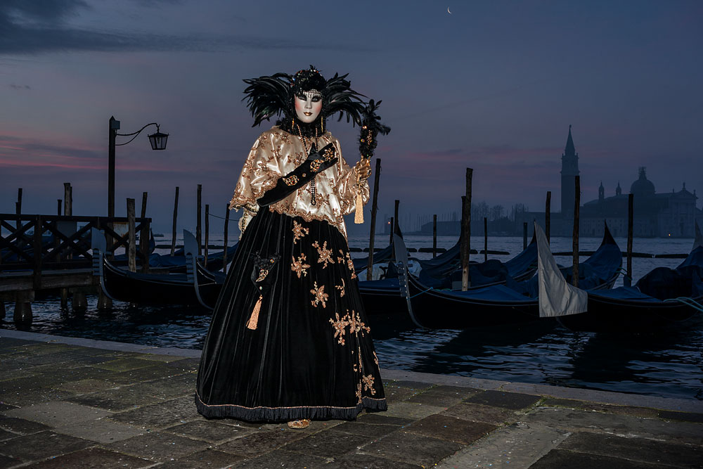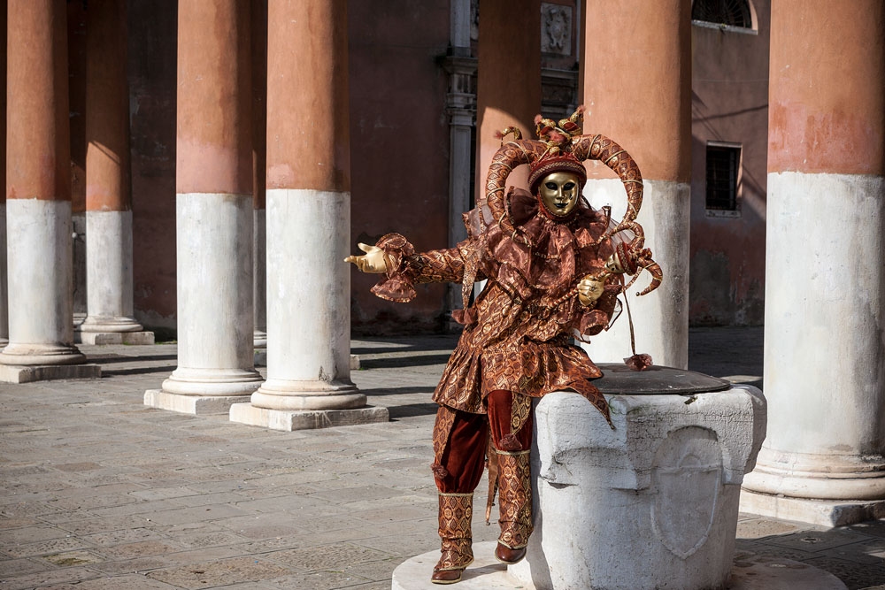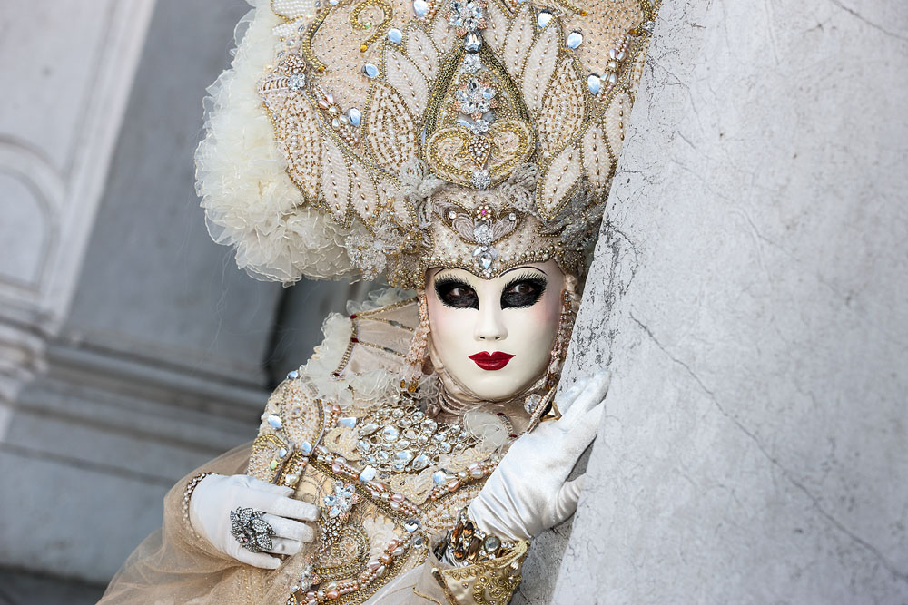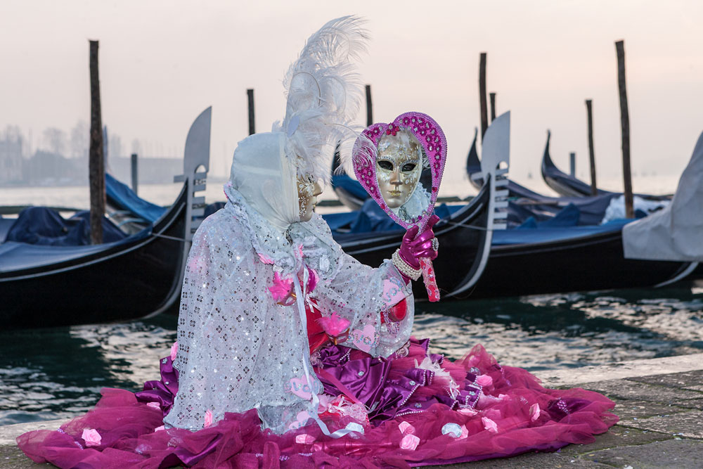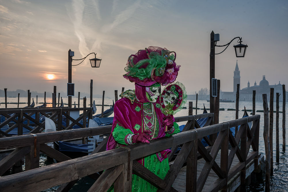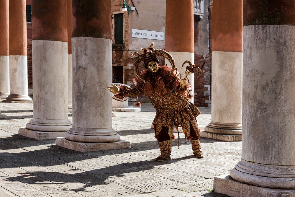 Morgens, wenn einem die Luft kühl und feucht umhüllt und es ganz still ist, nur das Geräusch des Besens eines Straßenkehrers über das Pflaster des Markusplatzes streicht, stehe ich gerne am Ufer der Riva degli Schiavoni und schaue hinüber nach San Giorgio di Maggiore oder Santa Maria della Salute. Zu dieser frühen Stunde beginnt der Zauber von Venedig, wird es zur Kulisse wie in einem Film Fellinis oder zum „Schönsten Ballsaal der Welt“, wie Napoleon gesagt haben soll. Auf dieser Bühne wird alljährlich an den „12 tollen Tagen“, einer Oper von Goldoni gleich, der Carnevale di Venezia gegeben.