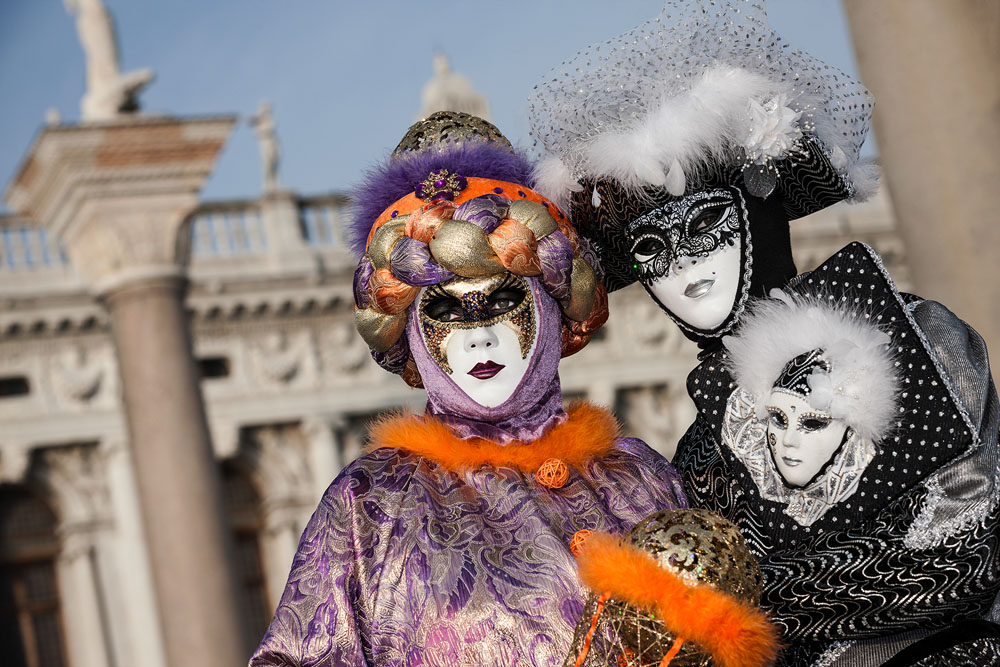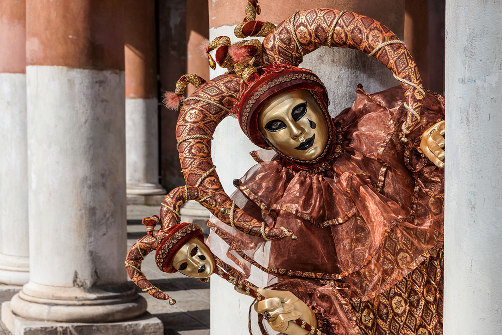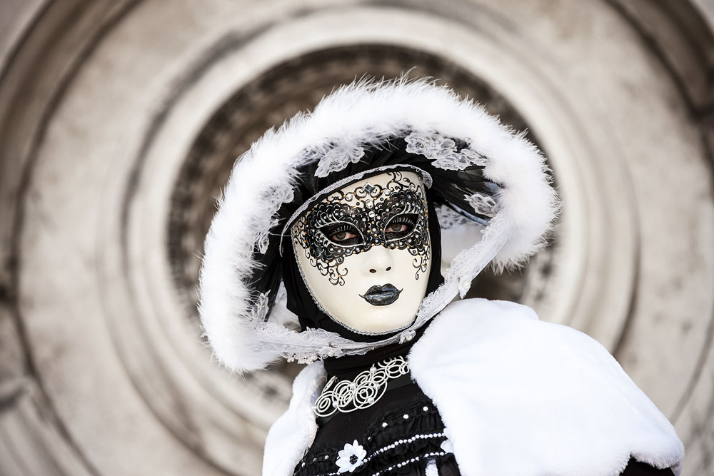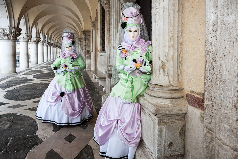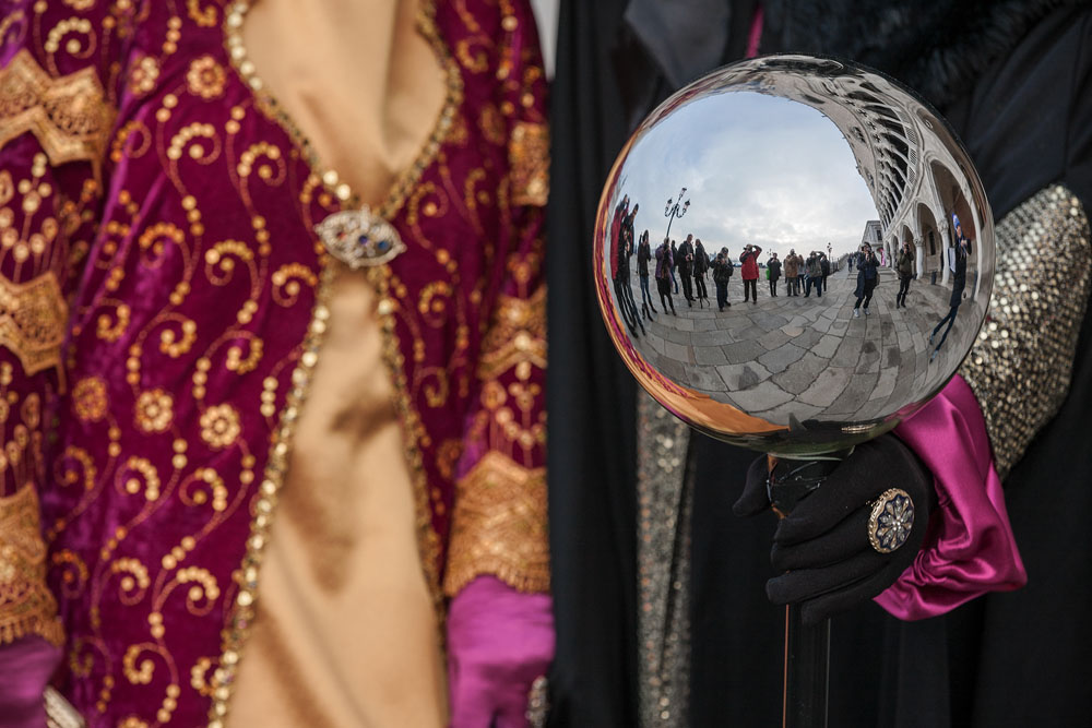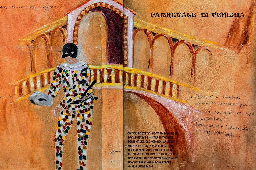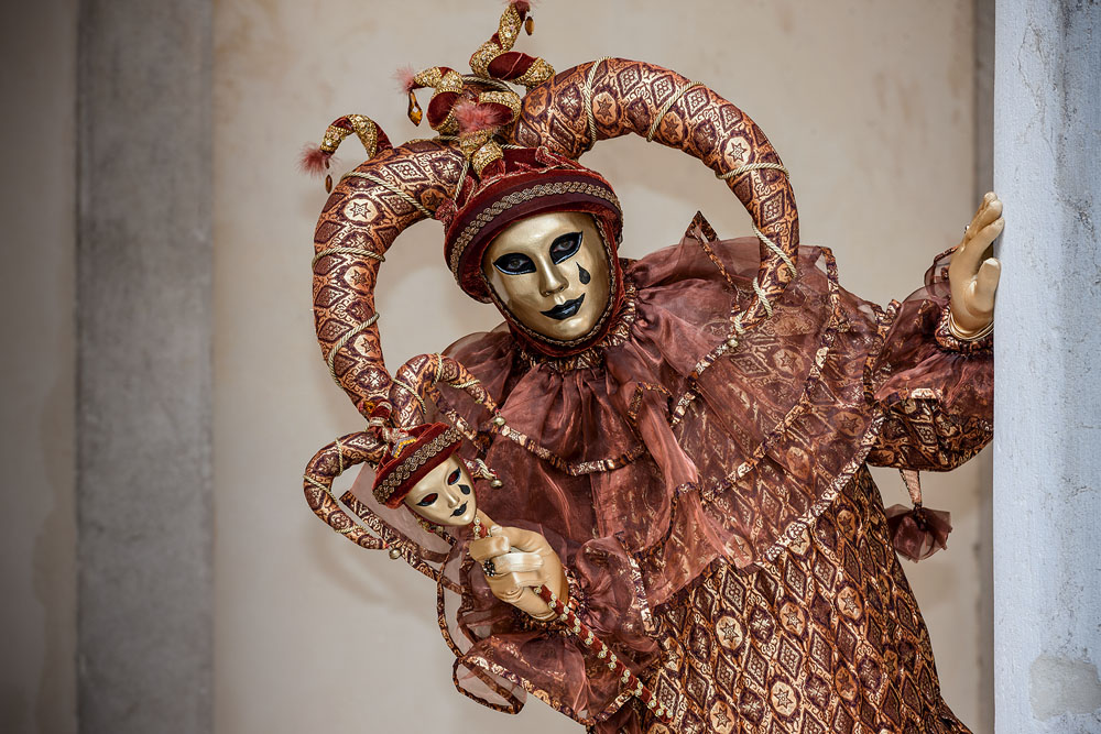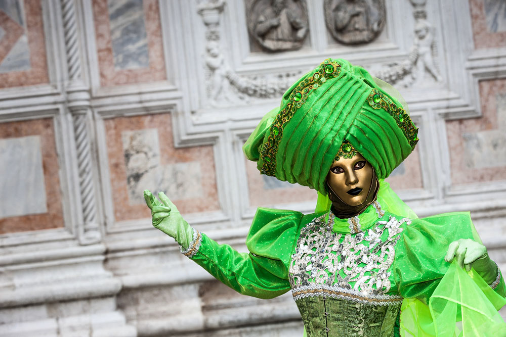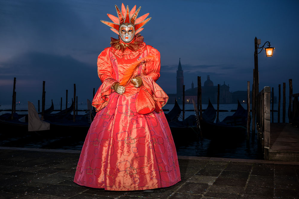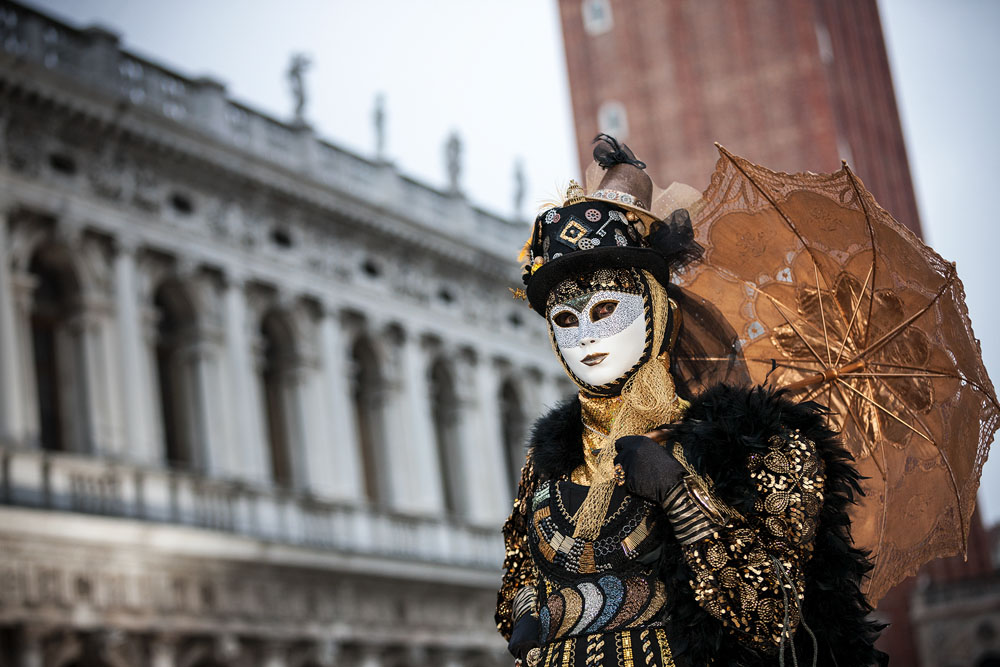 Morgens, wenn einem die Luft kühl und feucht umhüllt und es ganz still ist, nur das Geräusch des Besens eines Straßenkehrers über das Pflaster des Markusplatzes streicht, stehe ich gerne am Ufer der Riva degli Schiavoni und schaue hinüber nach San Giorgio di Maggiore oder Santa Maria della Salute. Zu dieser frühen Stunde beginnt der Zauber von Venedig, wird es zur Kulisse wie in einem Film Fellinis oder zum „Schönsten Ballsaal der Welt“, wie Napoleon gesagt haben soll. Auf dieser Bühne wird alljährlich an den „12 tollen Tagen“, einer Oper von Goldoni gleich, der Carnevale di Venezia gegeben.