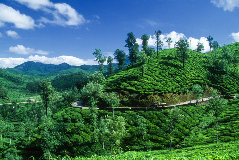 Am kommenden Tag brechen ich auf in die Western Ghats. Dass es im indischen Süden Berge gibt, die über 2.500 m aufragen, wusste ich nicht. Die Straßenverhältnisse verschlechtern sich zunehmend, als gegen Mittag heftiger Regen einsetzt. Hier gibt es noch echten „Regenwald“. Auch wenn auf kleinen Plantagen Kaffee kultiviert wird; sind die Western Ghats weitgehend Tee-Land. Schon bald lichtet sich der Urwald und die „green carpets“ der Teeplantagen breiten sich aus bis zum Horizont. Leider hängen die schweren Regenwolken noch tief und der Eindruck ist eher dunkel und mysthisch.