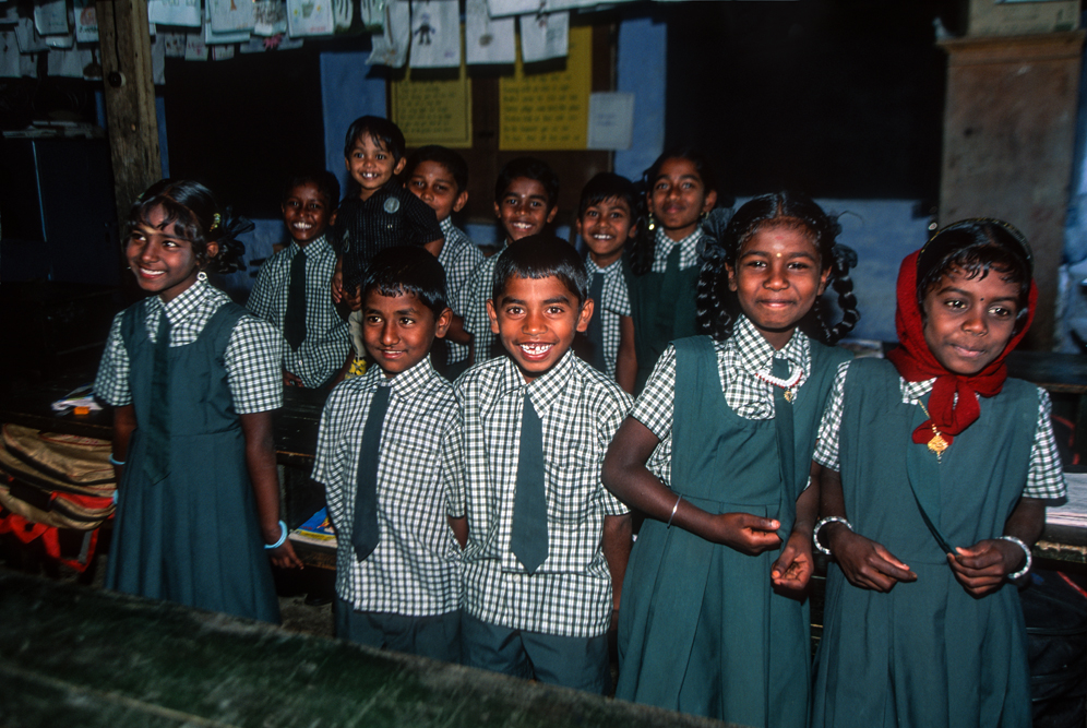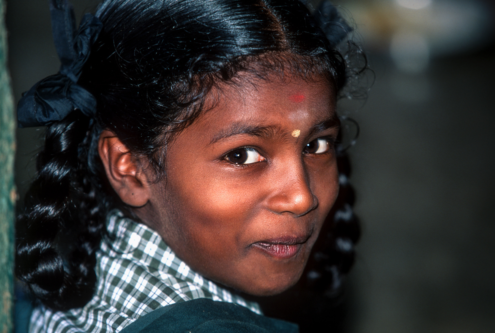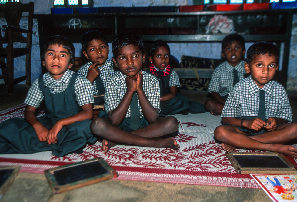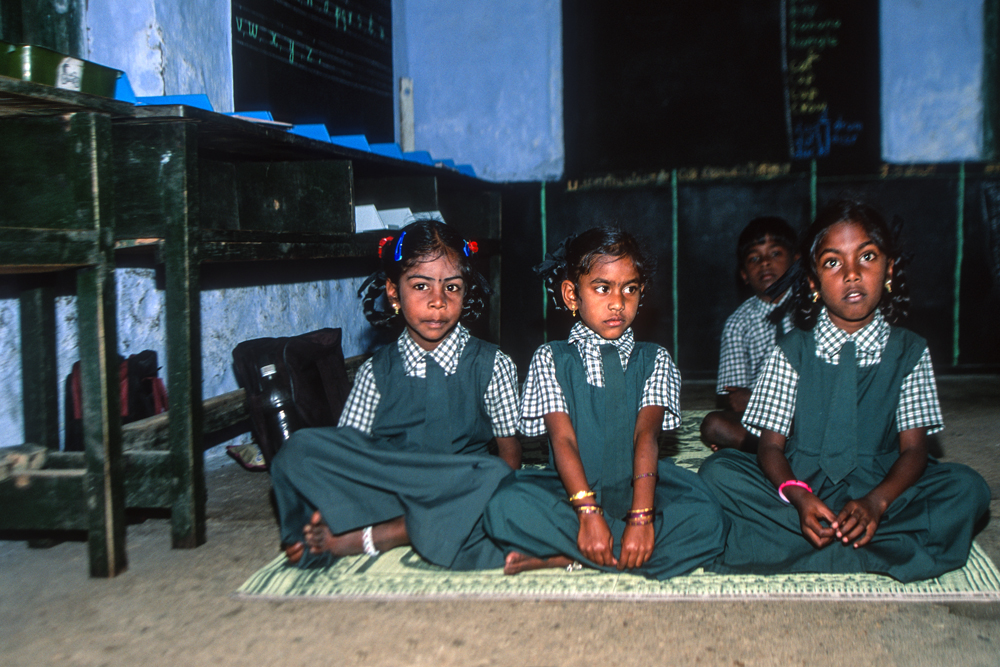 An diesem Morgen durch die Plantagen zu wandern gehört zu den schönsten Erfahrungen meines Fotografenlebens, denn immer wieder ergeben sich traumhafte Aus- und Einblicke auf Landschaft und Arbeiterinnen. Doch sehr schnell werde ich abgelenkt. Ich höre helle Kinderstimmen, Lachen, eine Schulglocke und die mahnende Stimme der Lehrerin. Auf freundliche Nachfrage darf ich eintreten. Die Kleinen tuscheln und kichern…was will dieser Fremde wohl hier ? Hier lernt die Zukunft Indiens ! Diese Kinder werden nicht mehr wie Ihre Eltern für das Existenzminimum auf den Teefeldern stehen. Bald ist die Konzentration wieder eingekehrt und auch das Klicken der Kamera stört nicht mehr.