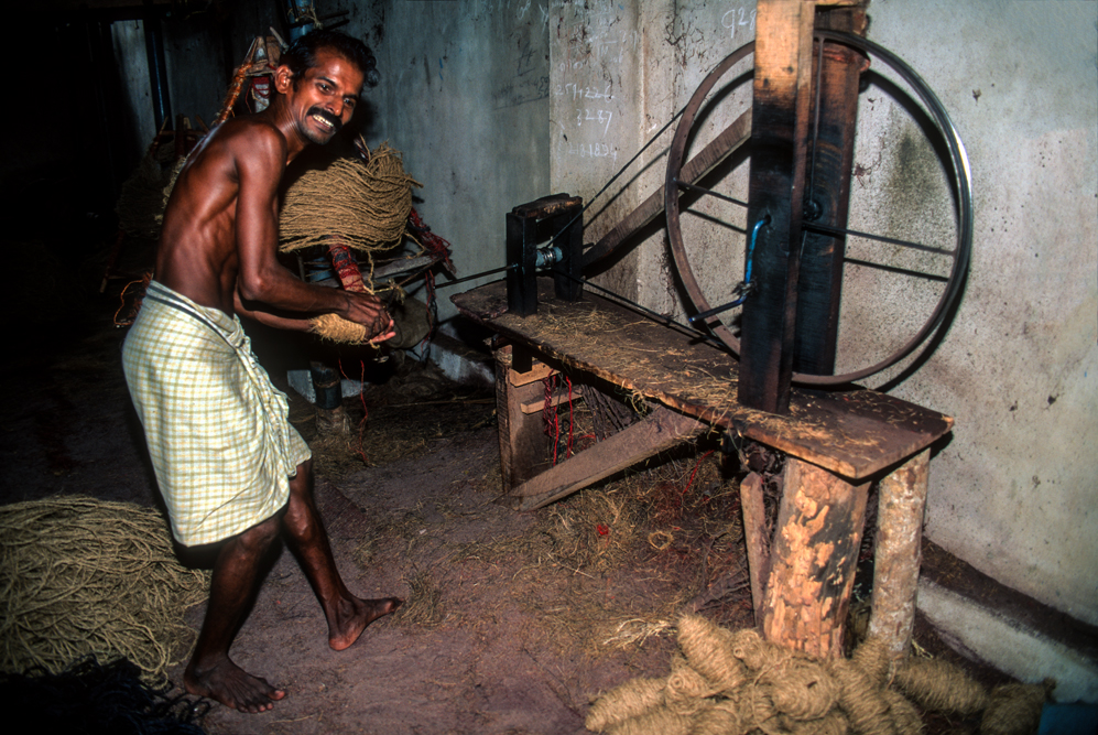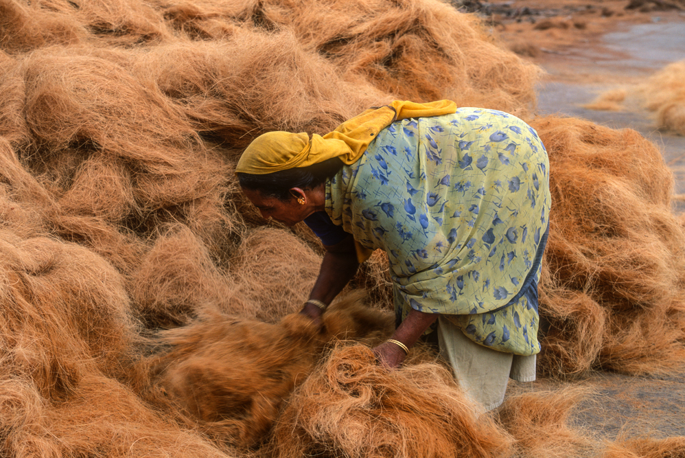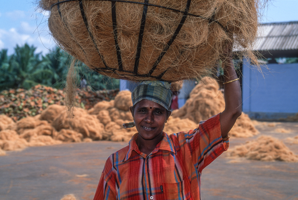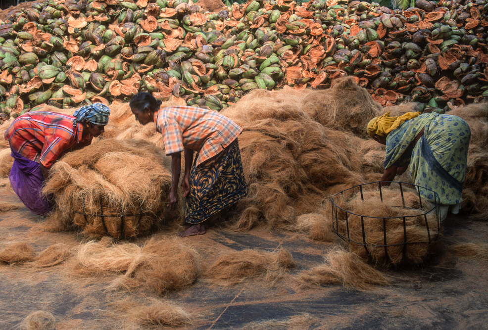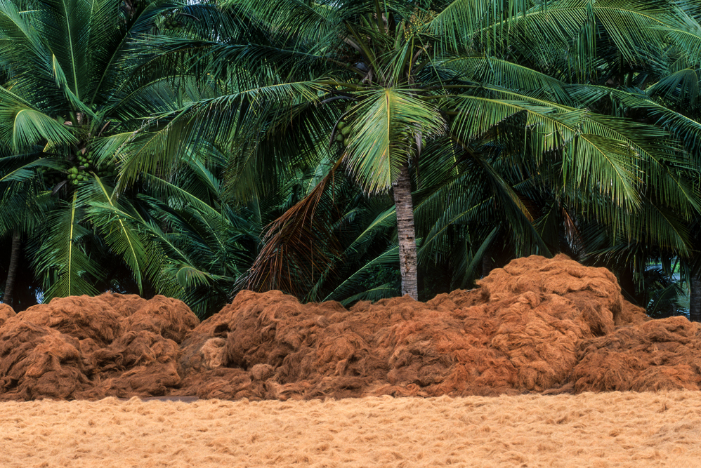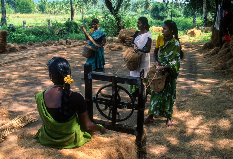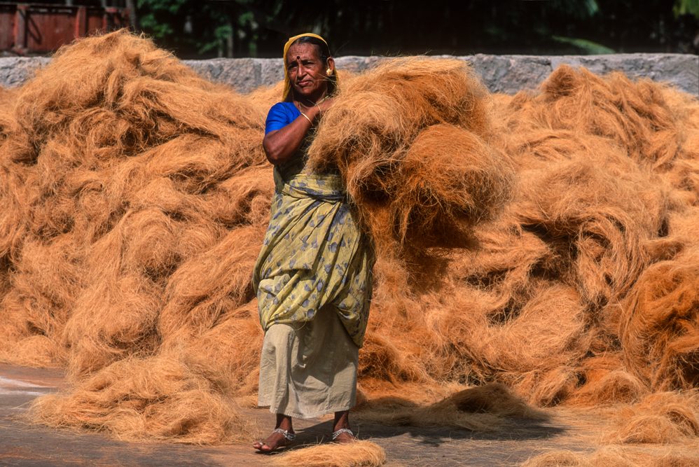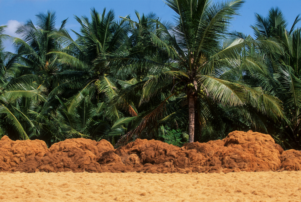 Kokosmilch verfeinert viele Speisen und auf meiner Reise durch den Indiens Süden stoße ich immer wieder auf Manufakturen, die Kokosfasern verarbeiten, sei es die kleine Seilerei an der Strasse oder einen Betrieb, der auf archaischen Webstühlen Kokosmatten herstellt, die zuhause als Fußabtreter vor unseren Haustüren liegen. Auf großen Arealen werden Kokosnußschalen aufgetrennt und die Fasern zum Trocknen ausgelegt. Der blaue Himmel, die grünen Kronen der Palmen, und die je nach Trocknungsgrad braunen und ockerfarbigen Flächen der ausgelegten Kokosfasern, bilden einen traumhaften Kontrast. Das Sortieren und Bündeln der Fasern, die einen hervorragenden natürlicheren Dämmstoff darstellen, ist in Indien, wie fast alle Schwerarbeit, Frauensache.