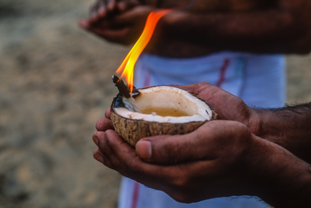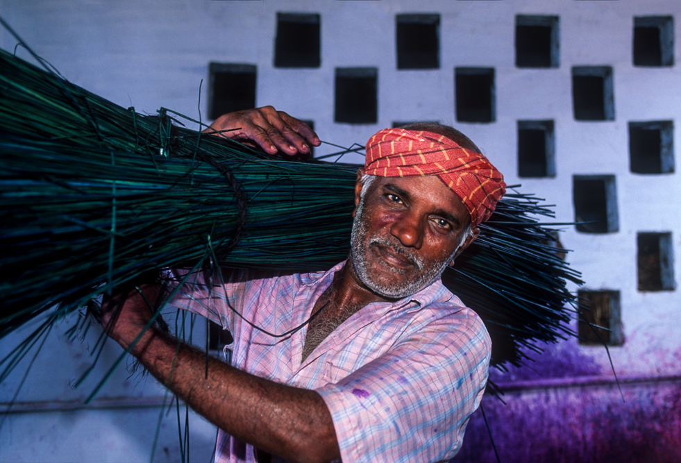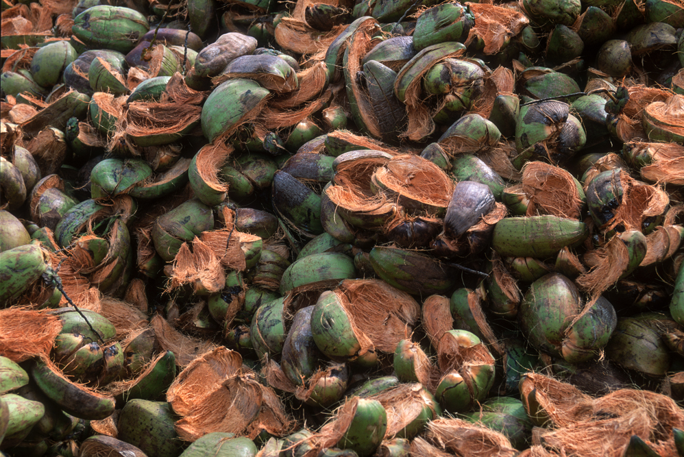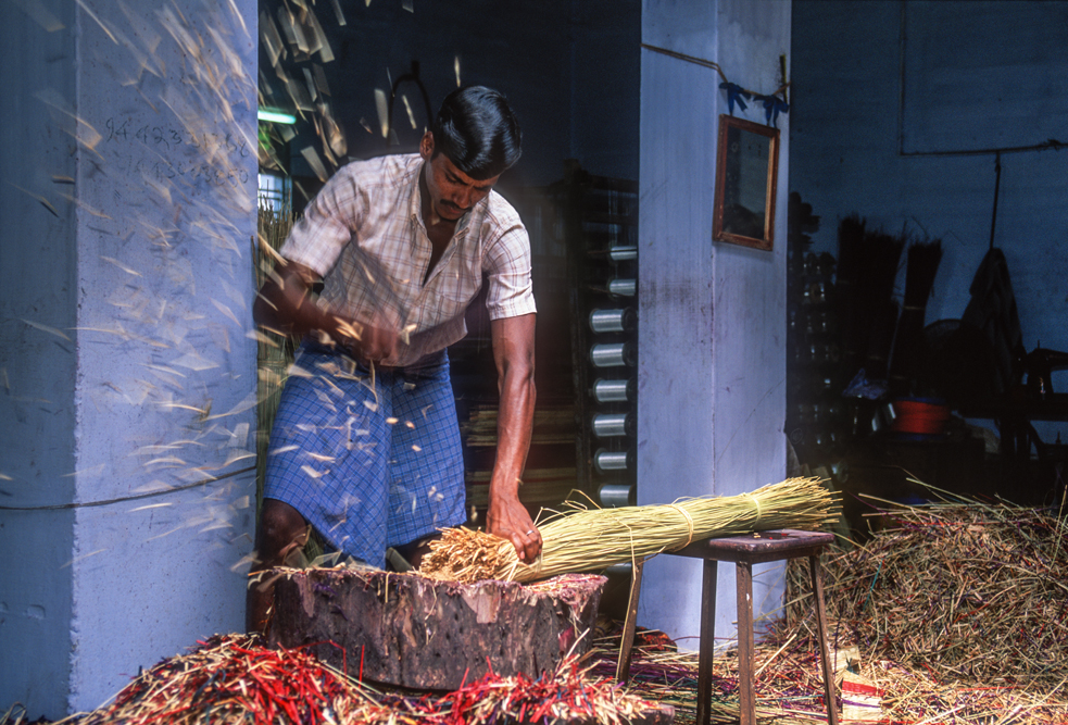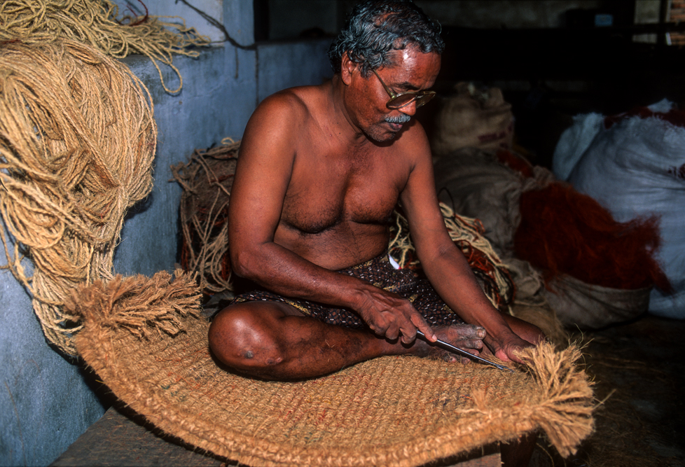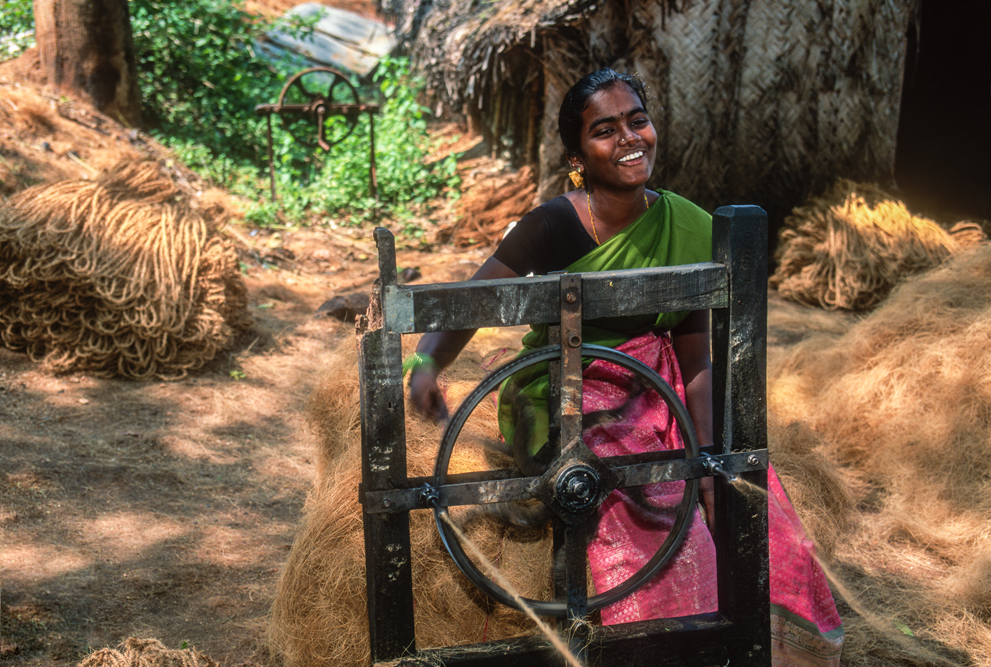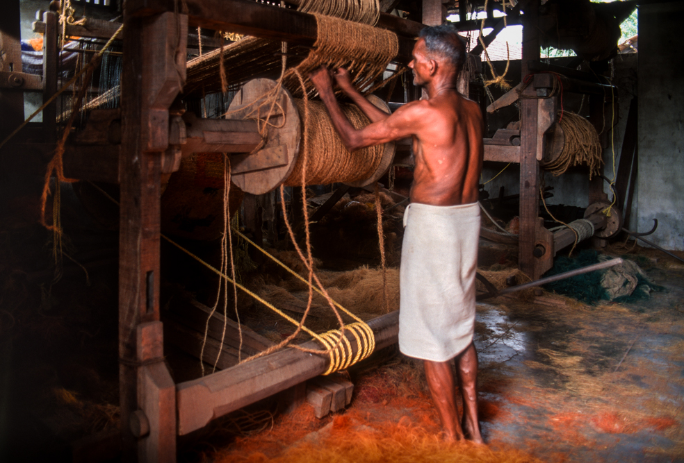 Kokosmilch verfeinert viele Speisen und auf meiner Reise durch den Indiens Süden stoße ich immer wieder auf Manufakturen, die Kokosfasern verarbeiten, sei es die kleine Seilerei an der Strasse oder einen Betrieb, der auf archaischen Webstühlen Kokosmatten herstellt, die zuhause als Fußabtreter vor unseren Haustüren liegen. Auf großen Arealen werden Kokosnußschalen aufgetrennt und die Fasern zum Trocknen ausgelegt. Der blaue Himmel, die grünen Kronen der Palmen, und die je nach Trocknungsgrad braunen und ockerfarbigen Flächen der ausgelegten Kokosfasern, bilden einen traumhaften Kontrast. Das Sortieren und Bündeln der Fasern, die einen hervorragenden natürlicheren Dämmstoff darstellen, ist in Indien, wie fast alle Schwerarbeit, Frauensache.