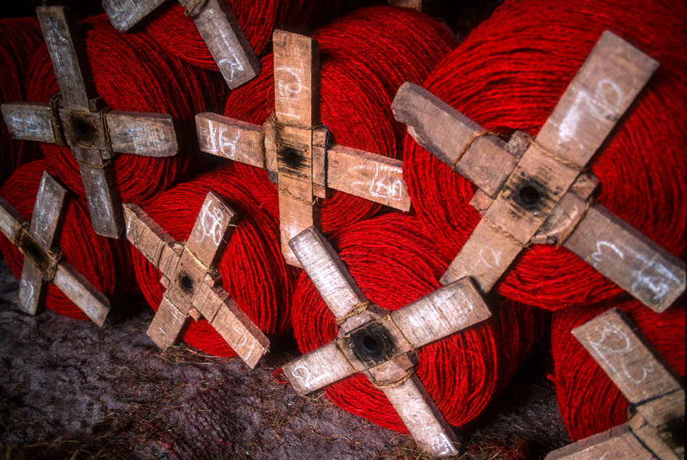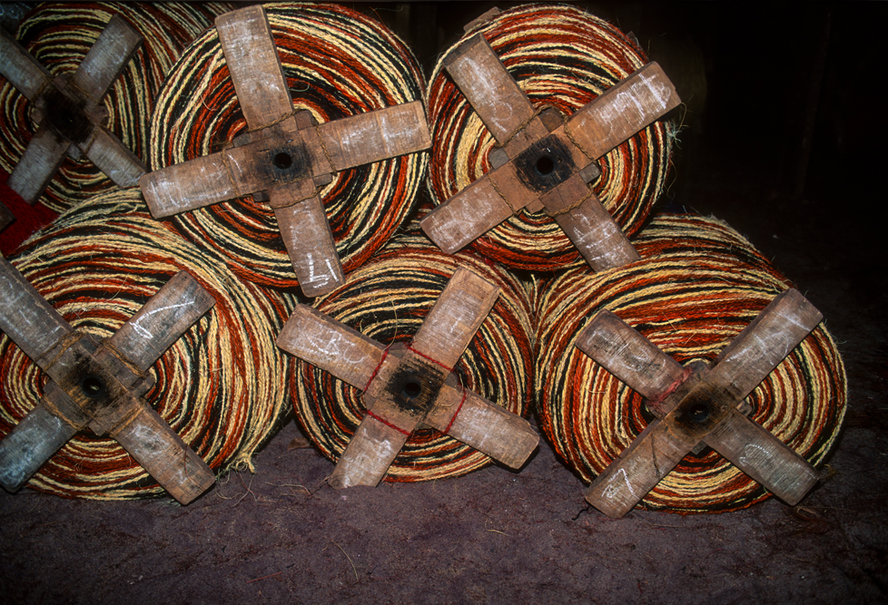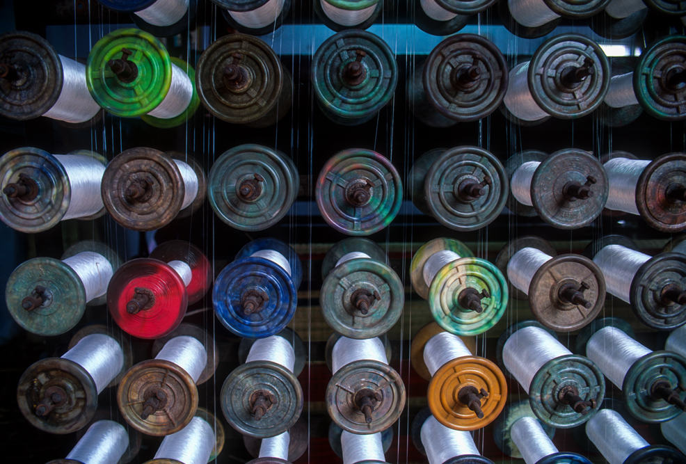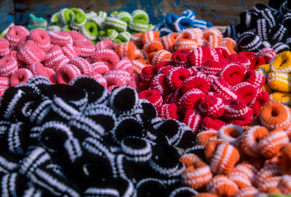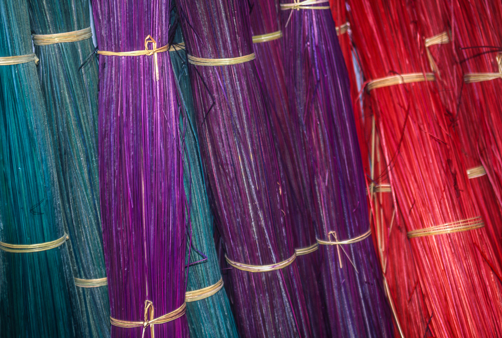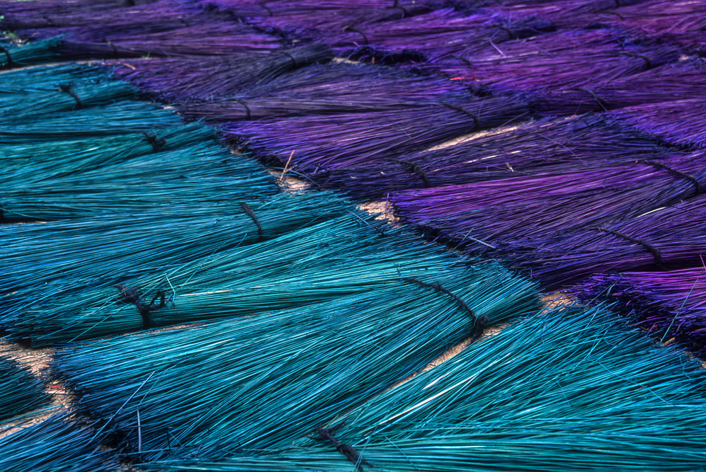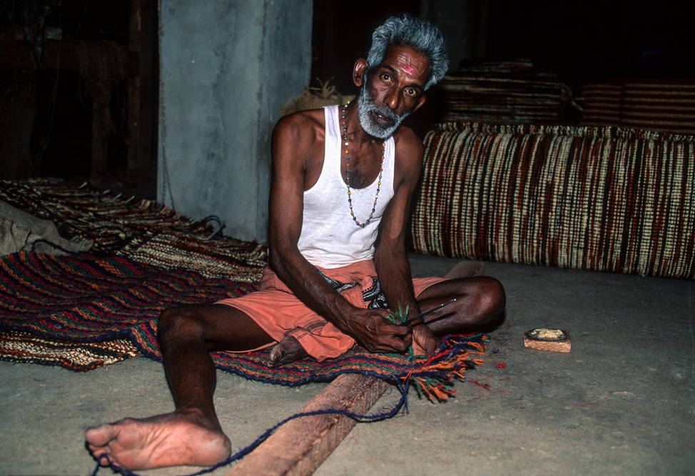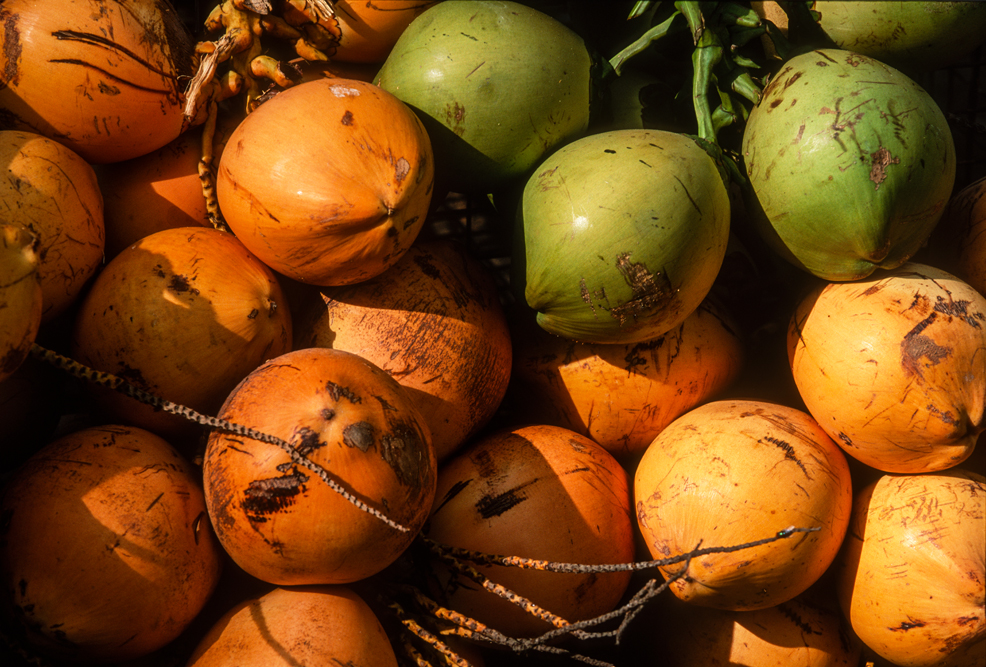 Kokosmilch verfeinert viele Speisen und auf meiner Reise durch den Indiens Süden stoße ich immer wieder auf Manufakturen, die Kokosfasern verarbeiten, sei es die kleine Seilerei an der Strasse oder einen Betrieb, der auf archaischen Webstühlen Kokosmatten herstellt, die zuhause als Fußabtreter vor unseren Haustüren liegen. Auf großen Arealen werden Kokosnußschalen aufgetrennt und die Fasern zum Trocknen ausgelegt. Der blaue Himmel, die grünen Kronen der Palmen, und die je nach Trocknungsgrad braunen und ockerfarbigen Flächen der ausgelegten Kokosfasern, bilden einen traumhaften Kontrast. Das Sortieren und Bündeln der Fasern, die einen hervorragenden natürlicheren Dämmstoff darstellen, ist in Indien, wie fast alle Schwerarbeit, Frauensache.
