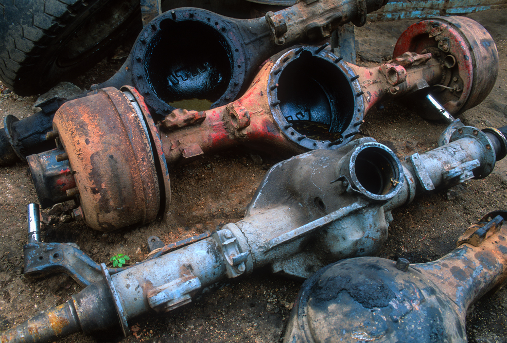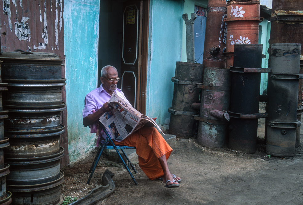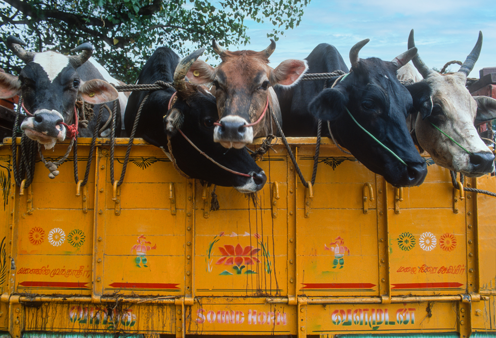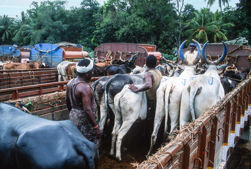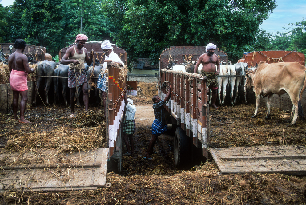 Gegen Mittag erreiche ich den Marktflecken Pollachi. Hier gibt es einen Viehmarkt. An der Grenze zwischen dem hinduistischen Tamil Nadu, wo die Kühe einen Heiligenschein haben, und Kerala mit seinem hohen moslemischen und christlichen Bevölkerungsanteil, verscherbeln die hinduistischen Händler Ihre Rindviecher ohne Skrupel. Das diese einige Tage später bereits in den Töpfen jenseits der Grenze landen; – egal ! Nur einen Steinwurf vom Viehmarkt entfernt gibt es einen großen Schrottmarkt. Hier hauchen Tata’s und Tuc-Tuc’s ihr Leben aus. Mit Schweißbrennenr, Hämmern und Brechstangen rücken die Abwracker alten Bussen und LKW’s zu Leibe. Hier wird der Recycling-Gedanke voll ausgelebt, von dem unsere Politiker und Nachhaltigkeits-gläubigen davon sicher eine andere Vorstellung haben.