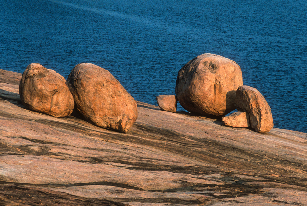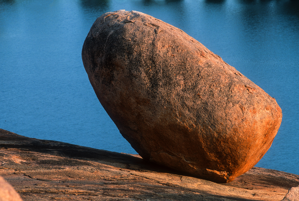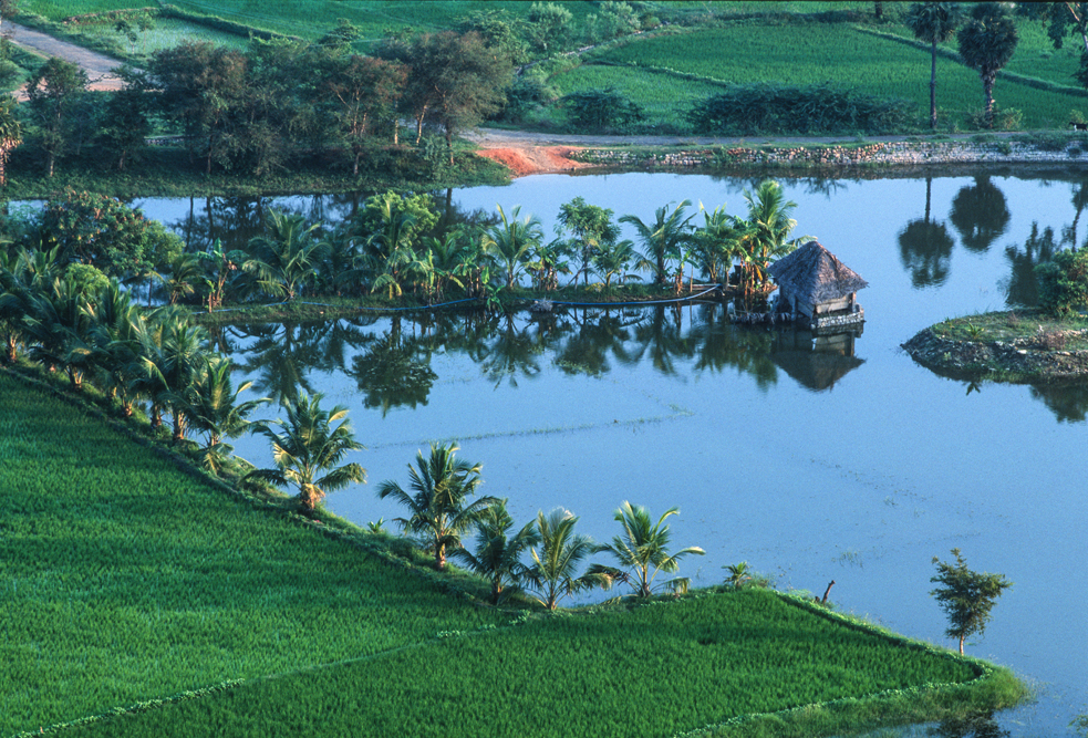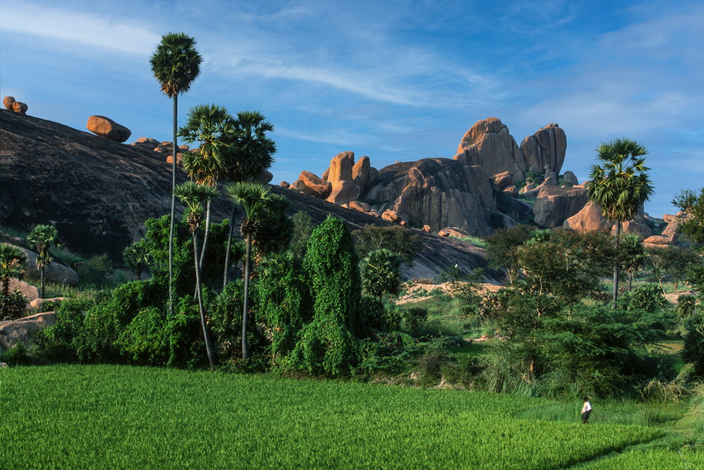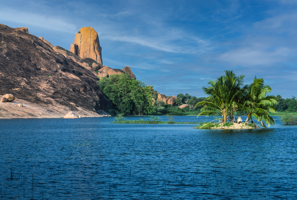 Eine Autostunde vor Madurai kommt man auf kleinen Nebenstraßen zu einem landschaftliches Highlight, das auf keiner Touristenkarte verzeichnet ist. Eine namenlose Granitfelsformation hinter einem tiefblauen See mit einer kleinen Palminsel liegt in zartem Rosa des warmen Abendlichtes vor uns. Irgendwie zieht mich dieser „Kleine Zuckerhut“ magisch an und beim Blick von oben sieht man, wie sich die Palmen am Ufersaum in der glatten Oberfläche des tiefblauen Wassers spiegeln.