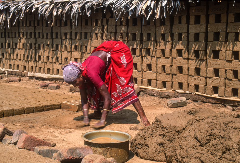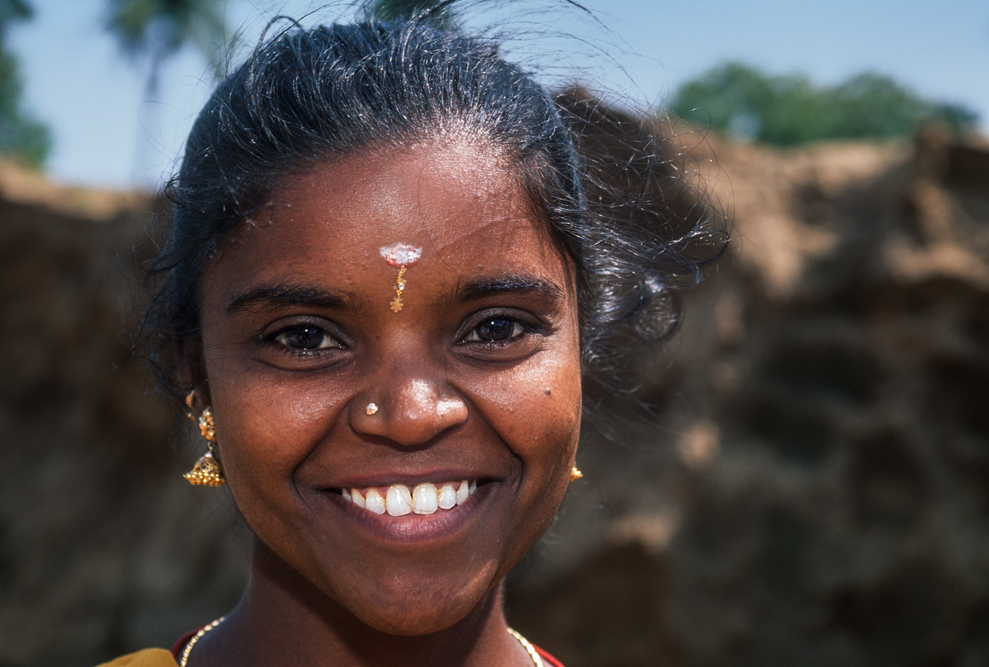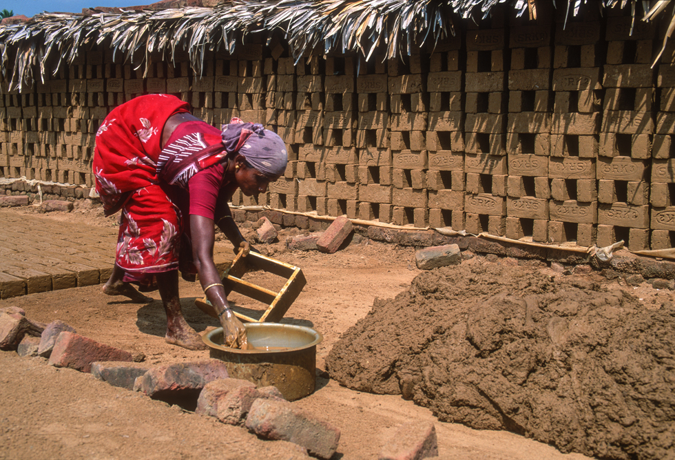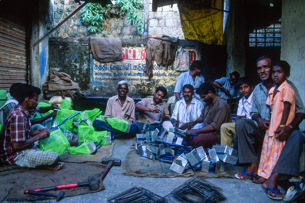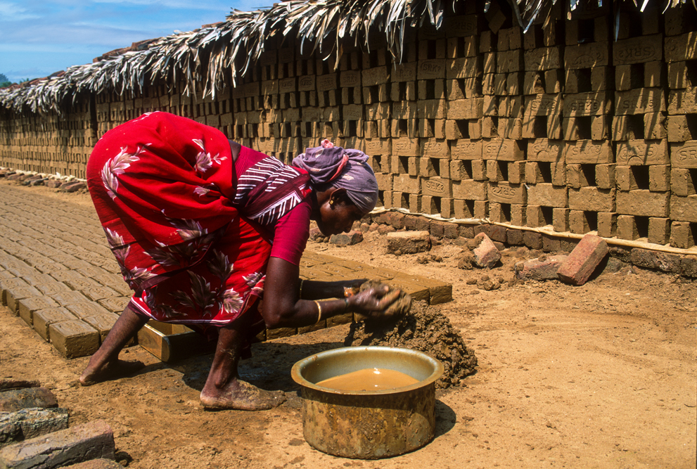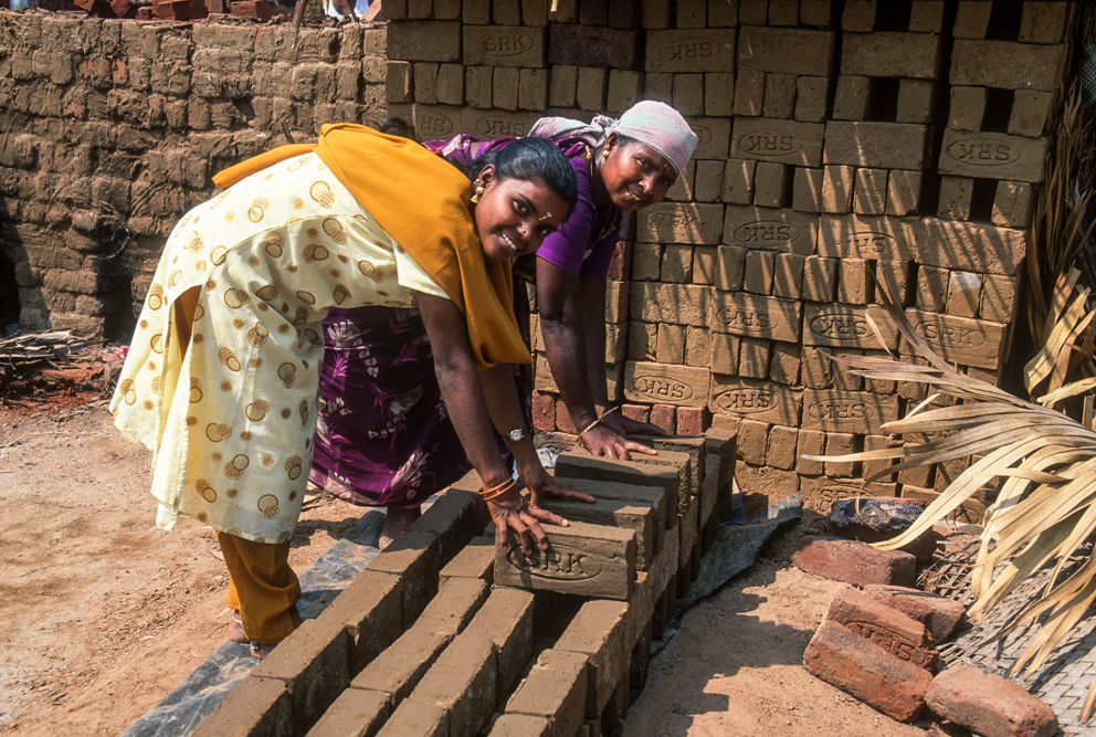 Kurz hinter Madurai, nur wenige Kilometer außerhalb der Stadt liegt am Wegesrand eine kleine Backsteinfabrik. Harte Arbeit unter sengender Sonne – also Frauensache ! Schon von weitem kündet der schwarze Qualm von den ungesunden Arbeitsbedingungen. Die Frauen formen mit einfachen, rechteckigen Holzmodeln die Ziegel und drücken für die spätere Entlohnung noch ihren Stempel auf. Danach bleiben die Rohlinge zum Trocknen in der Sonne, bevor sie in den Brennofen wandern. Ich bin mit der Kamera mittendrin und habe das Gefühl im Vorhof der Hölle zu sein, so heiß ist es. Die Frauen strahlen jedoch trotz der Mühsal in die Kamera. Auch wenn es sarkastisch klingt, kommt mir der Ausspruch des japanischen Oberst aus die Brücke am Kwai in den Sinn „…habt Freude an der Arbeit !“