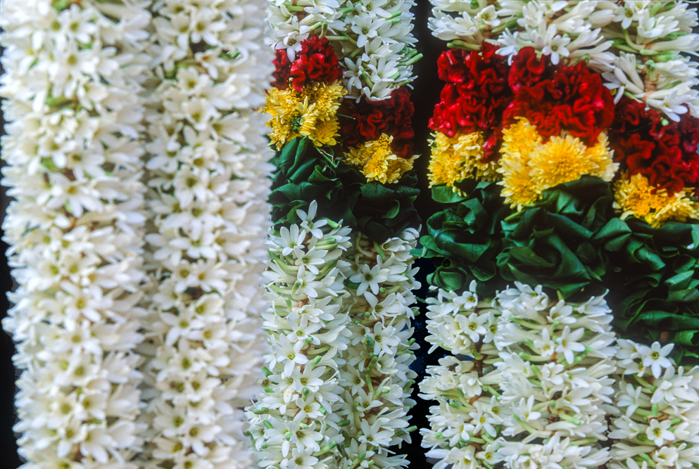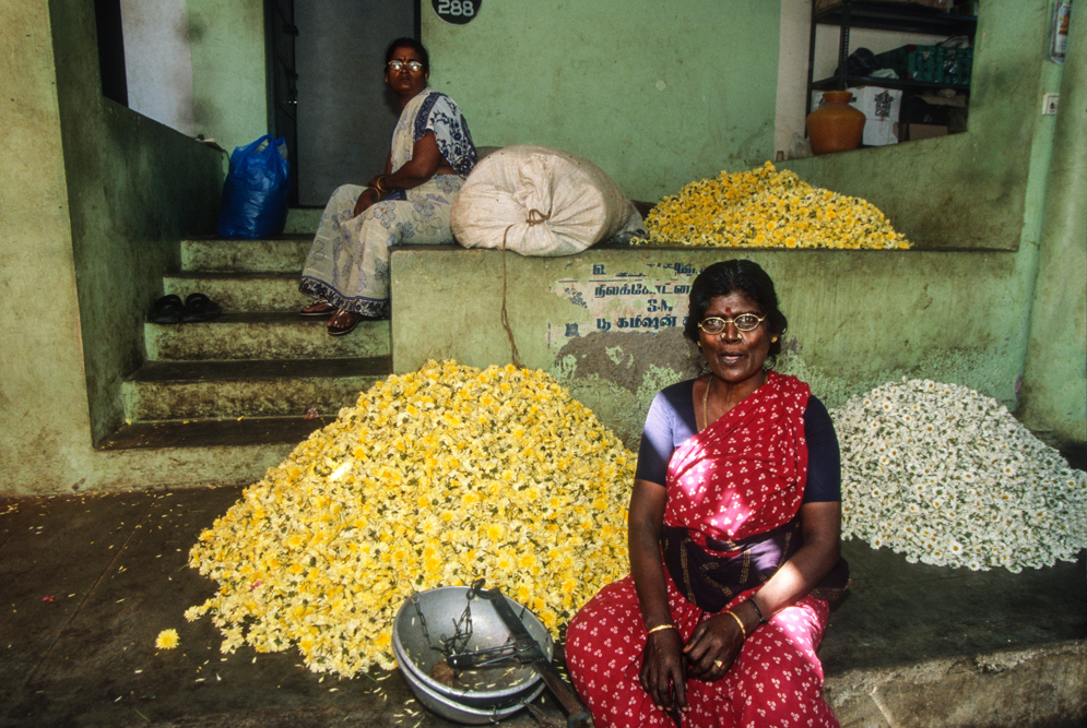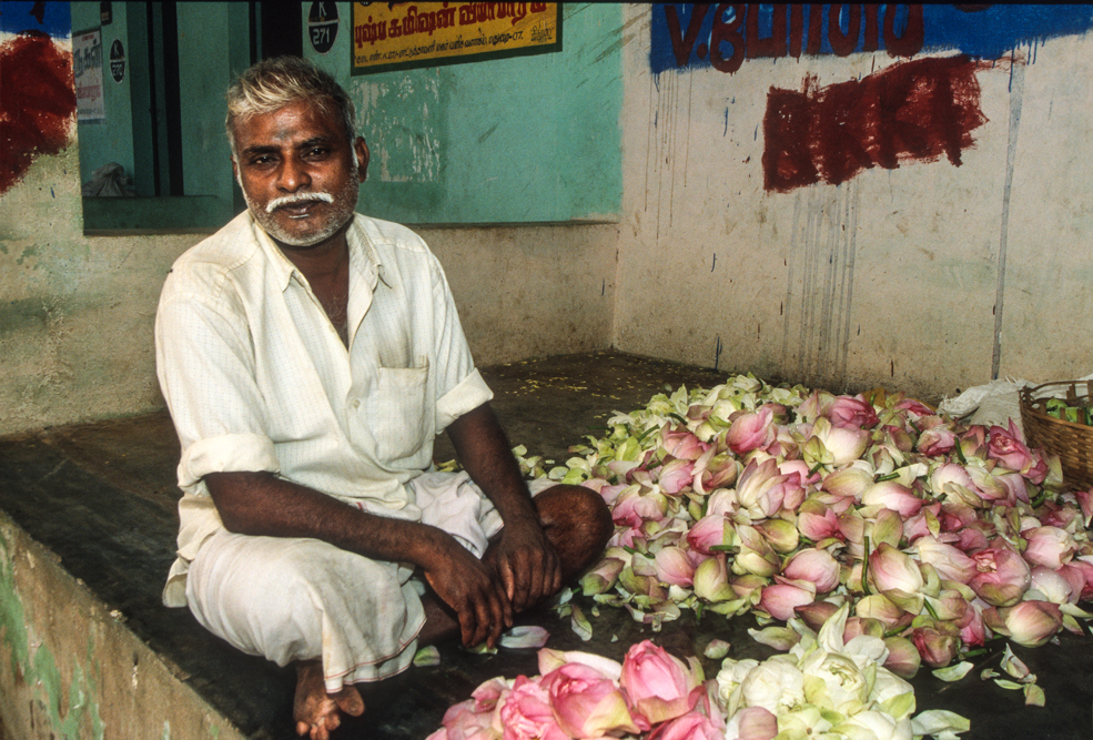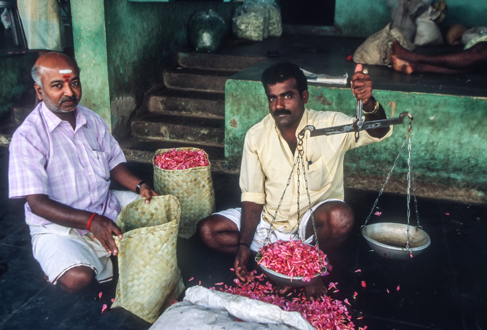 Geschäftig geht es auf dem Blumenmarkt von Madurai zu. Es ist nur eine schmale Gasse, der süße Duft frischer Blüten der einem am Eingang entgegenschlägt, ist ein wenig betäubend. Ein Meer von Farben: zartes Rosa der Lotosblütenblätter, weiße Agavenblüten, blau-violette Jacaranda- und rote Frangipani-Blüten reizen die Sinne. In dem quirligen Gewühl wird gehandelt und gefeilscht und die Blüten auf Fäden zu Blumenketten aufgezogen.