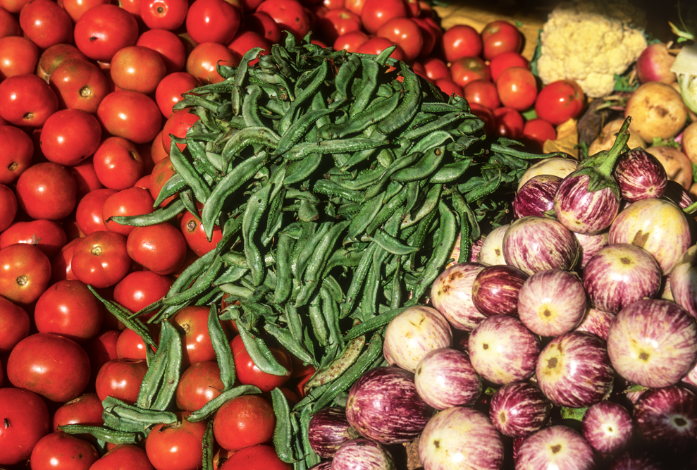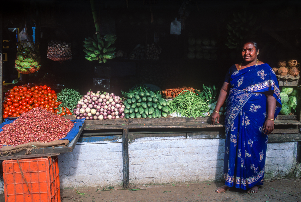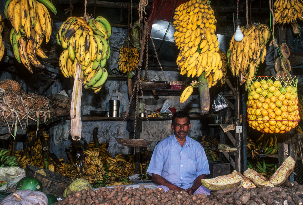 Am Nachmittag bummele ich über den Markt von Valparai; die Markstände brechen fast zusammen. Ladyfingers, Eggfruit, Tomaten, Bananen, Orangen, bringen Farbe ins Bild. Die Gegend ist fruchtbar. Hier muss niemand Hunger leiden. Durch ausgedehnte Palmenhaine verlassen ich die Western Ghats. In den vielen Serpentinen die bergab führen, lauern Rhesusaffen, überfallen den, der anhält und betteln um Süßigkeiten.