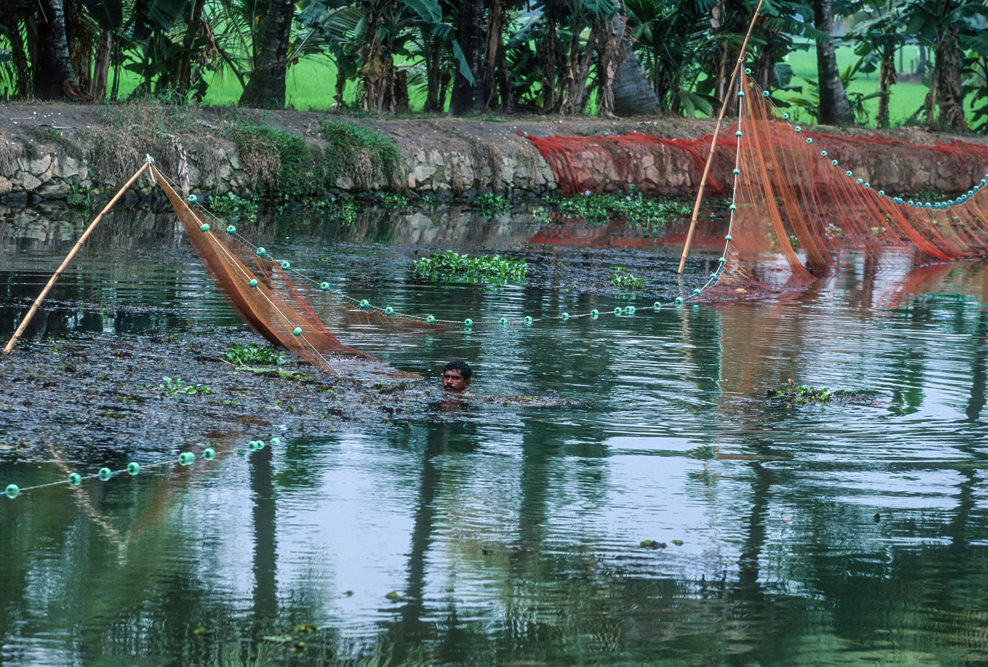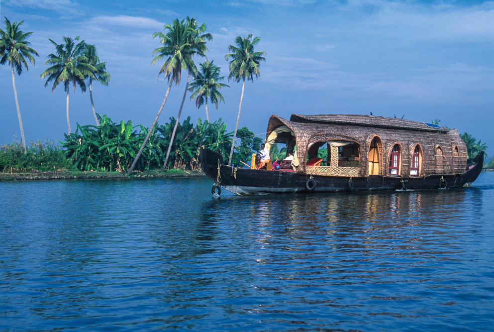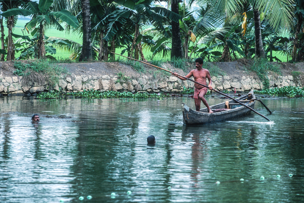 Bei Kollam beginnen die Backwaters. Das ungefähr 800 km lange Kanalsystem, im Hinterland der Küste, ist größtenteils künstlich angelegt. Die ehemaligen Kolonialherren waren daran interessiert, dass die Reichtümer des Landes, die Lagerhäuser und Häfen von Alappuzha und Kochi, unversehrt erreichen. So schufen sie dieses unvergleichliche Gewirr von Wasserstrassen, deren Ufer heute Lebensraum für Reisbauern, Bananenfarmer und Küstenfischer sind. Nachbauten der alten Lastkähne schippern heute Touristen durch die Kanäle. Die Hausboote sind mit allem erdenklichen Komfort ausgestattet, und die Bootsbesatzung liest dem Gast jeden Wunsch von den Lippen ab. Am Ufer waschen Frauen Wäsche und Kinder. Fischer stecken im flachen Wasser ihre Stellnetze in den Grund. Kleine, schmale Boote setzen Schüler und Schülerinnen von einem Ufer zum anderen Ufer über. Gemächlich zieht das Leben an mir vorbei. Zeit zum Träumen !