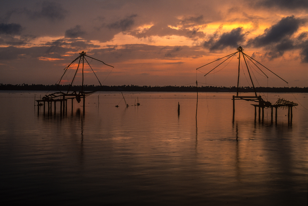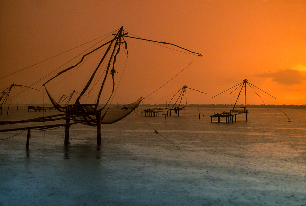 Kochi ist mit knapp 700.000 Einwohnern nur eine indische Kleinstadt, im Ballungsraum leben über 1,6 Mio. Menschen. Neben Schiffbau, Landwirtschaft und Fischerei ist die Region in den vergangenen Jahren Teil des indischen Silicon-Valley geworden. Berühmt ist Kochi für seine chinesischen Fischernetze. Sie sollen hier bereits im 13. Jahrhundert von chinesischen Kaufleuten eingeführt worden sein. Die meisten Reisenden besuchen die Fischernetze an der südlichen Spitze des Hafens. Ich habe mit meinem Freund Althaf die Möglichkeit eine Fischerfamilie außerhalb von Kochi zu besuchen, wo die schweren Holzkonstruktionen an denen die Netze wie an einem Galgen im Wasser hängen, sich frei gegen einen Abendhimmel über dem indischen Ozean abzeichnen, der zum Tagesausklang in allen Violetttönen erstrahlt.