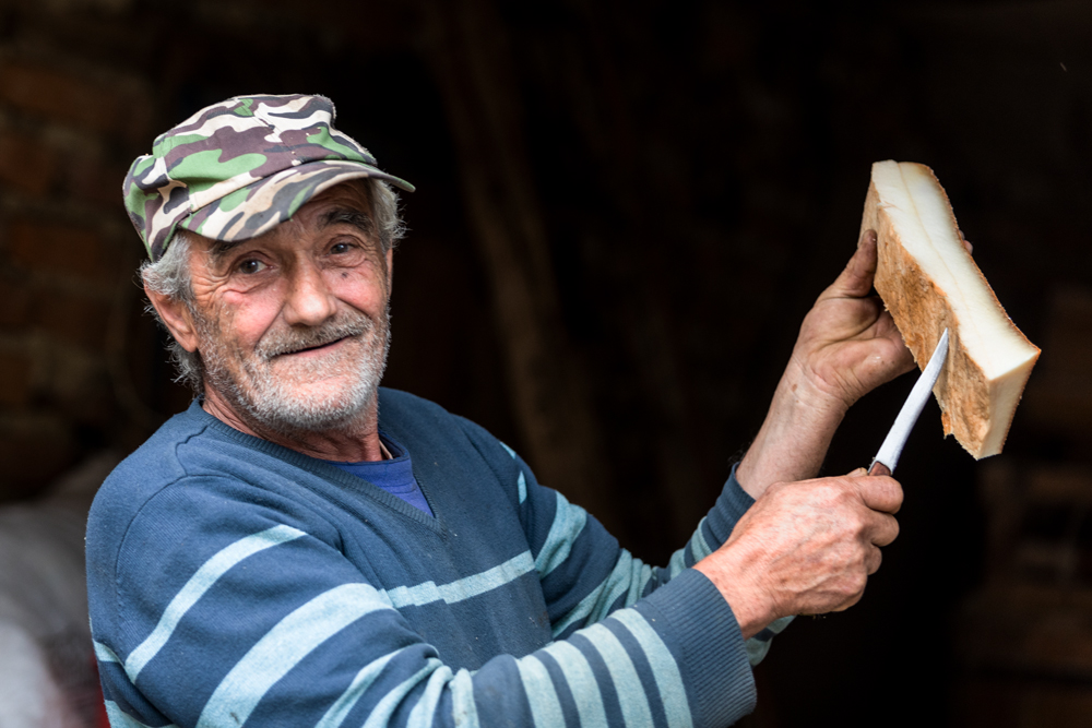 Der Besuch muss unterbrochen werden, den Ion muss dringend die Schweine füttern. Als wir uns nach einer guten Stunde verabschieden wollen, packt er mich am Arm, zieht mich auf die Veranda und stürmt ins Haus. Gleich darauf kommt er mit einem großen Messer zurück. Nimmt das fröhliche Zusammentreffen jetzt ein unfreundliches Ende ?  Ganz im Gegenteil. Ion holt die Leiter, krabbelt hinauf in die Sparren der Scheune und schneidet uns ein riesiges Stück grünen Speck, den er dort zum Trocknen aufgehängt hat, als Wegzehrung ab. Als Dreingabe gibt es einen Bund Zwiebeln. Da wir so ausgehungert ausschauen, wird die Leiter noch an den Apfelbaum gestellt und einige Kilo Äpfel gepflückt.  Weil die allein so sauer schmecken, packt er noch eine große Plastiktüte mit Walnüssen oben auf.