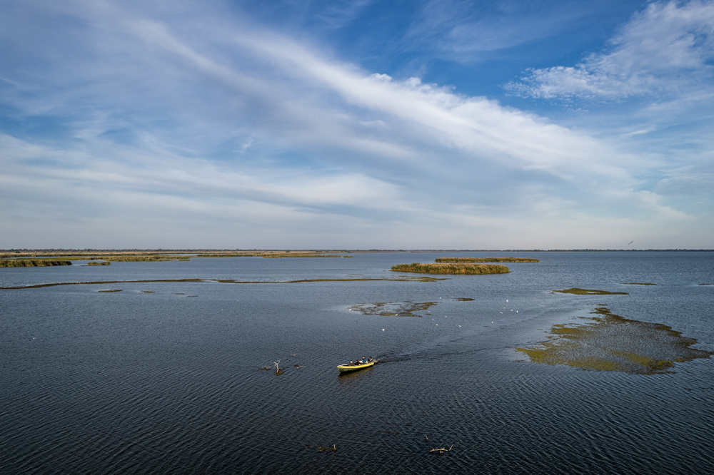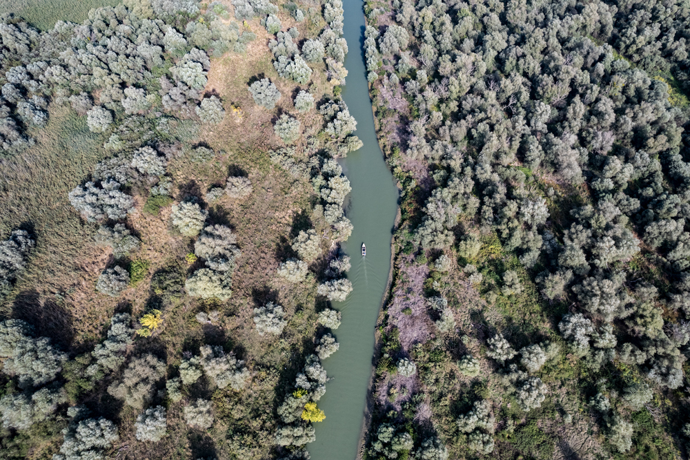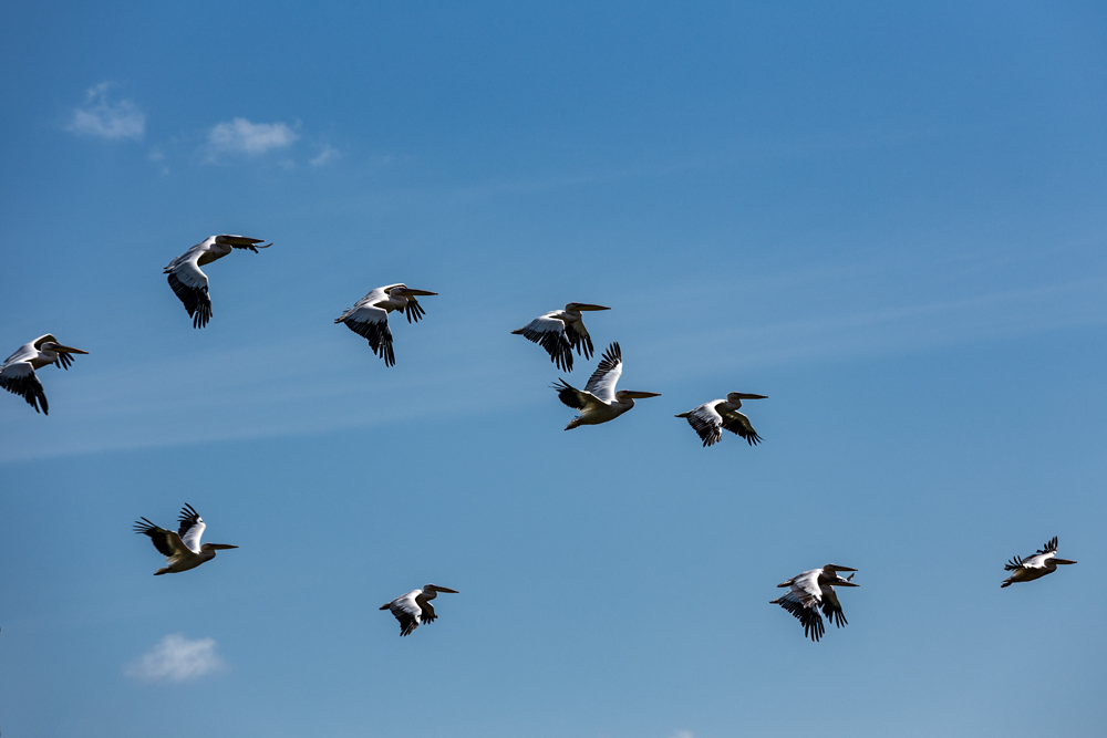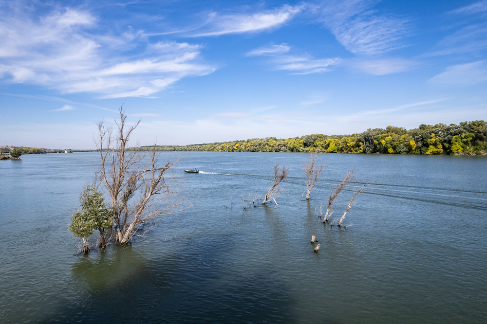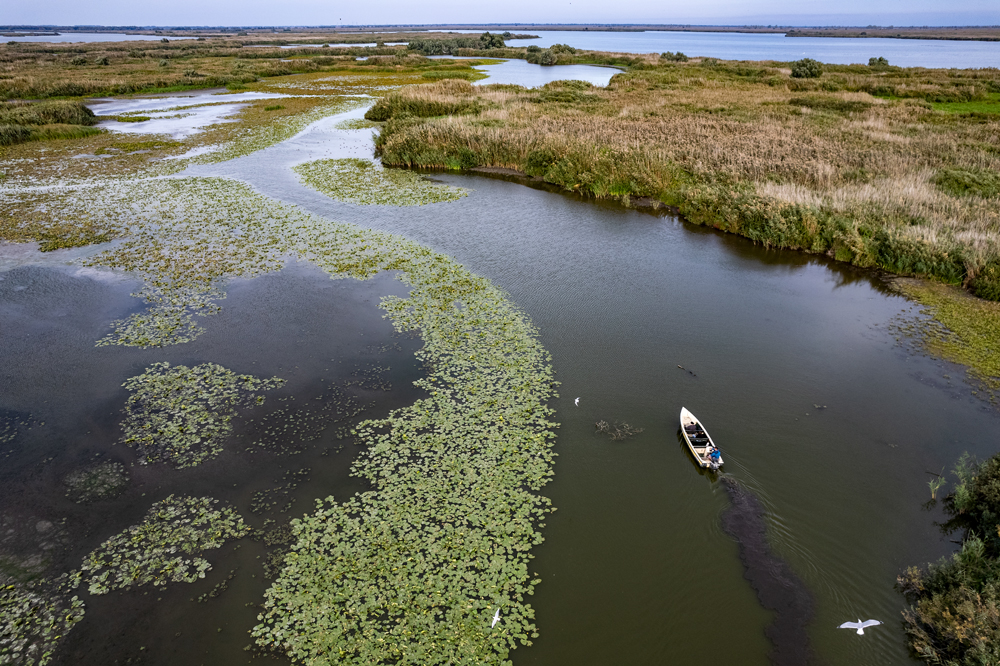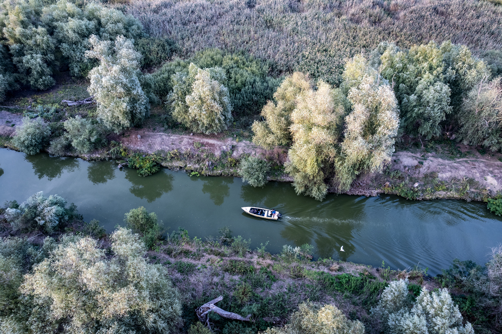 Auch der Versuch zu einer der großen Kolonien Pelikan-Kkolonien im Sfântu-Gheorghe Arm der Donau zu gelangen, verläuft buchstäblich im Sand. Der mittlere Durchfluss der Donau liegt im Delta bei über 7000 m³/sec. Die Differenz zwischen Niedrigwasser (2000 m³/sec.) und Hochwasser (24.000 m³/sec.) ist erheblich, und wir haben, – Sie ahnen es schon – Niedrigwasser. Ich kann das nicht verstehen. Wasser, soweit das Auge reicht. Das man jedoch mit Gummistiefeln neben dem Boot herlaufen könnte, erkenne ich erst auf den Drohnenaufnahmen zuhause, denn wir wirbeln mit der Schraube den Grund auf und ziehen eine breite Schlickspur hinter uns her.