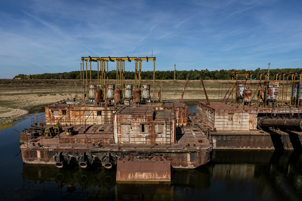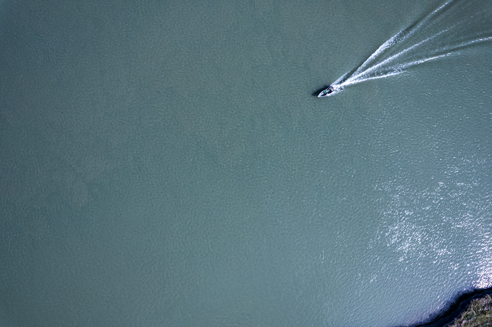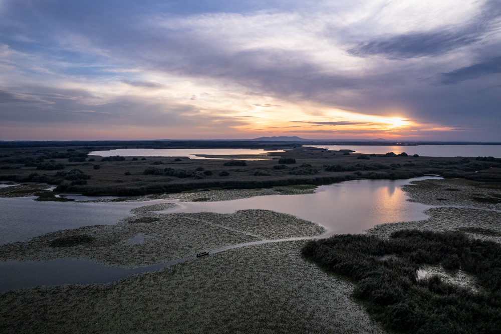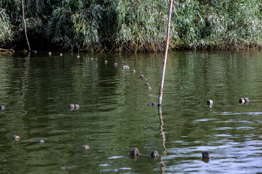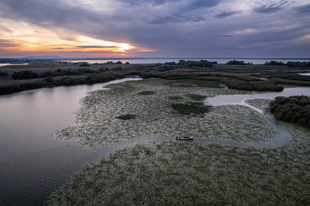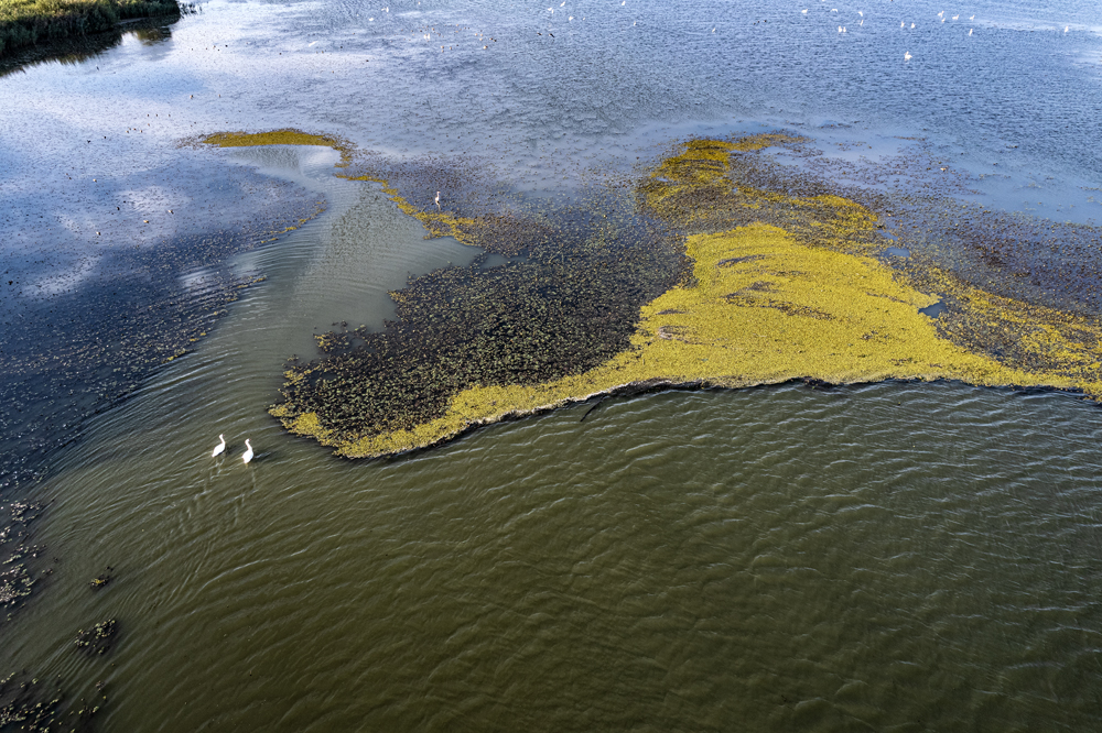Auch der Versuch zu einer der großen Kolonien Pelikan-Kkolonien im Sfântu-Gheorghe Arm der Donau zu gelangen, verläuft buchstäblich im Sand. Der mittlere Durchfluss der Donau liegt im Delta bei über 7000 m³/sec. Die Differenz zwischen Niedrigwasser (2000 m³/sec.) und Hochwasser (24.000 m³/sec.) ist erheblich, und wir haben, – Sie ahnen es schon – Niedrigwasser. Ich kann das nicht verstehen. Wasser, soweit das Auge reicht. Das man jedoch mit Gummistiefeln neben dem Boot herlaufen könnte, erkenne ich erst auf den Drohnenaufnahmen zuhause, denn wir wirbeln mit der Schraube den Grund auf und ziehen eine breite Schlickspur hinter uns her.