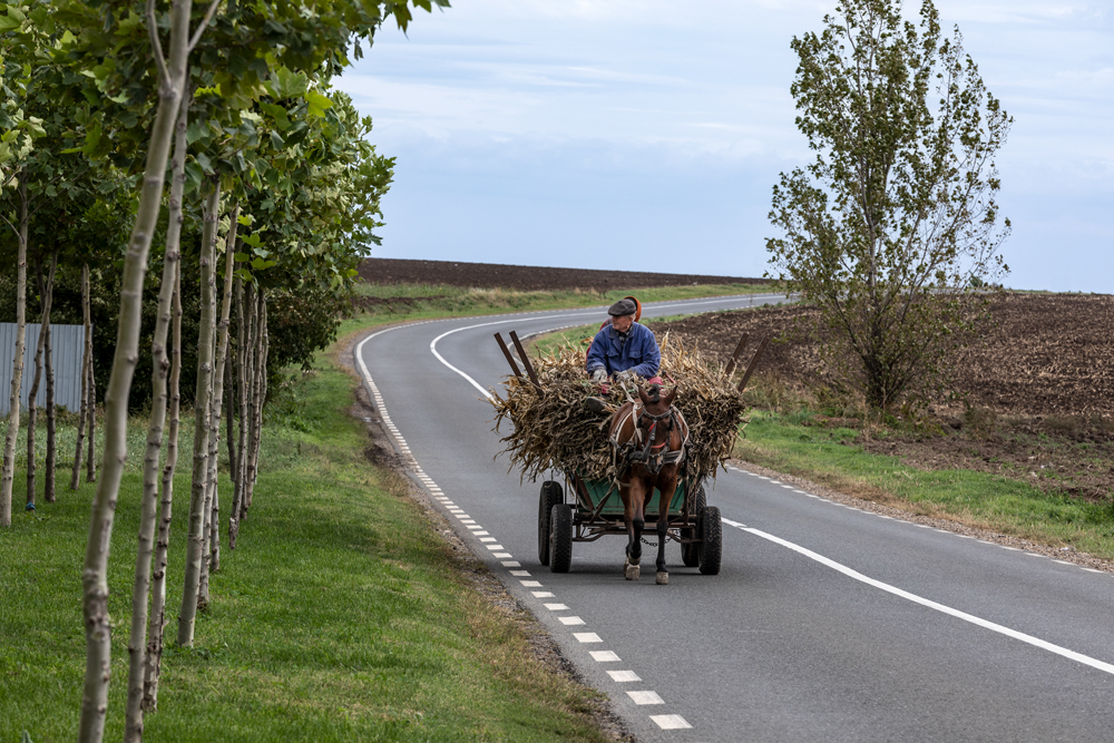 …der Sonne hinterher. Wir wollen ins Donau-Delta. Hinter Bukarest wird das Land flach. Rumänische Streubüchse. Schwerer, schwarzer, fruchtbarer Boden. Die Kornkammer des Landes. Wer Rumänien erleben will, muss die großen Fernstraßen verlassen. Ich bin auf dem Land aufgewachsen. In den frühen 60er Jahren des vergangenen Jahrhunderts. Sobald wir bei Cernavodă die Brücke über den Donau-Schwarzmeer-Kanal überquert und die Fernverkehrsstraße verlassen haben, fühle ich mich wieder in diese Zeit zurückversetzt. Auf den Landstraßen gehören ein- oder zweifach-bespannte Pferdewagen zum Straßenbild. Die alltägliche Hektik ist verflogen oder gleitet so beschaulich vor sich hin, wie die Donau, an deren Ufer wir entlangfahren. Es ist Sonntag, und doch treffen wir viele Leute an, die auf dem Feld arbeiten. Es ist Erntezeit, und da muss jede Stunde genutzt werden, bis die Ernte eingebracht ist.