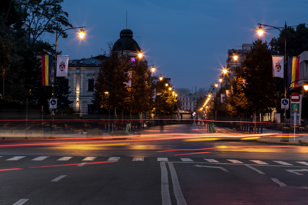 Eigentlich finde ich den Regen gar nicht so schlimm, zumindest an diesem Tag, denn in allen guten Fotos, welche ich bisher von Oradea gesehen hatte, sind Asphalt und Pflaster regennass und die zur „blauen Stunde“ angestrahlten Gebäude rund um den Piața Uniriii erzeugen darauf einen sanften Schimmer. Doch im Moment schimmert gar nichts. It’s a long way to Oradea 😉, und der Regen prasselt in dicken Tropfen auf’s Autodach. Aber der „Liebe Gott der Fotografen“ hat meine Gebete erhört und ein Einsehen. Als wir in Oradea ankommen hört der Regen auf. Ideale Voraussetzungen. Lasset die Spiele beginnen!