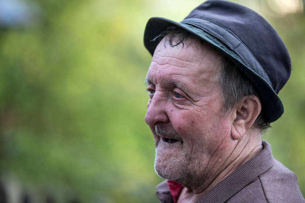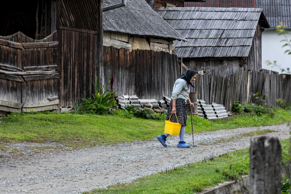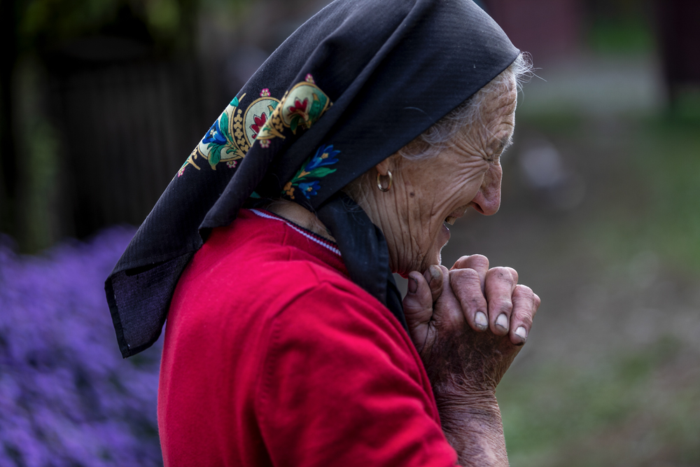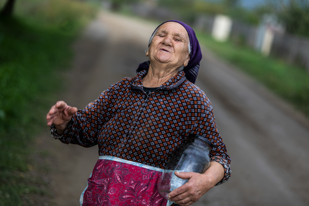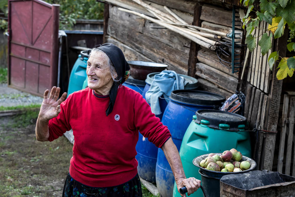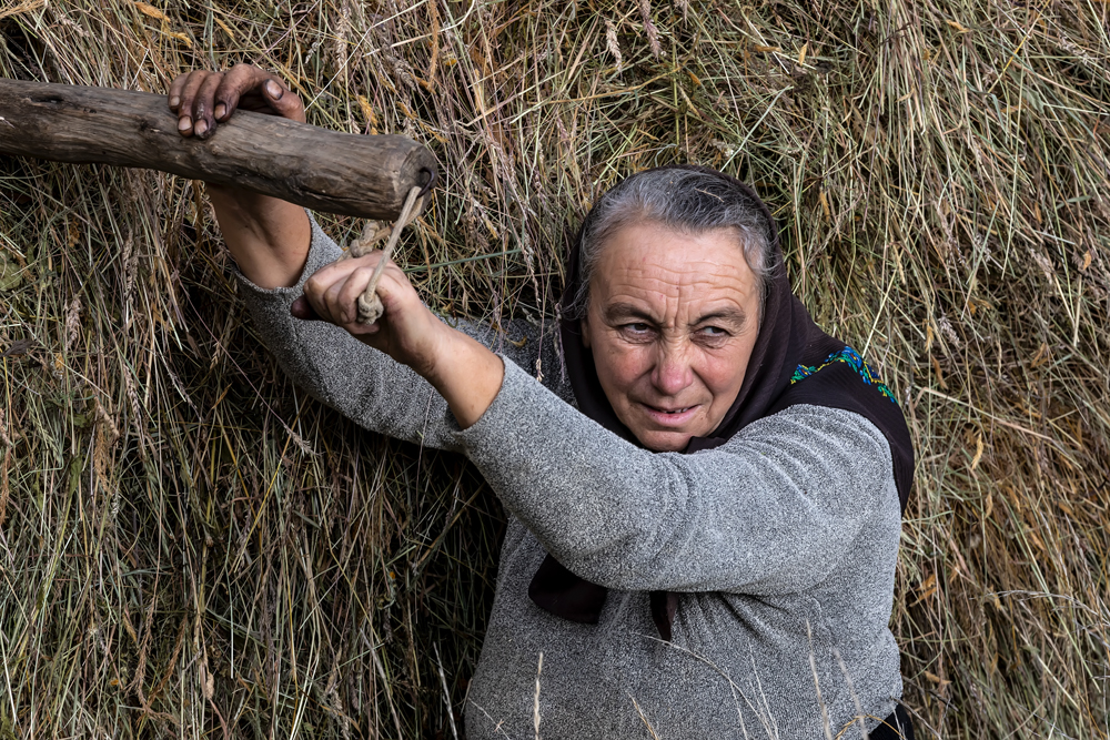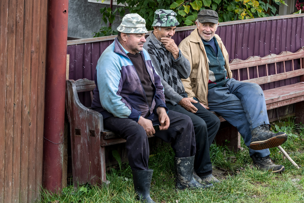 Auf unserem Weg durchs Dorf begegnen wir einem fidelen Trio, das sicher bereits das eine oder andere Feierabendbierchen intus hat. Wobei es für Feierabend vielleicht ein wenig früh ist. Die Gesprächsrunde erweitert sich schnell, schließlich bekommt man selten neue Gesichter zu sehen. Nach einer Weile ist der Reiz des Neuen verflogen und die „Talkrunde“ löst sich auf, aber einer ruft seinem Kumpel noch hinterher: „Erzähl‘ bloß meiner Frau nicht, dass ich hier sitze, die glaubt ich sei bei der Arbeit“. Der Dorfspaziergang zieht sich, denn jeder will den „Deutschen“ sehen. Am Ende der Dorfstraße treffen wir auf Ileana. Auch sie ist schon über achtzig. Ein langes Leben und harte Arbeit haben ihre Spuren hinterlassen. Sie geht krumm wie eine Sichel. Klagen tut sich nicht; – na ja vielleicht ein wenig: …so viel Obst, und so wenig Hilfe murmelt sie und bückt sich, um weitere Äpfel aufzusammeln. Wir schleppen ihr den schweren Korb mit den aufgesammelten Früchten zu einer vorsintflutlichen Saftpresse und Ileana dreht die Kurbel. Großzügig biete ich mich an, ihr ein wenig Arbeit abzunehmen und merke schnell wie viel Kraft die alte Dame haben muss, denn die die alte Saftpresse ist widerborstig. Aber Ileana sieht den guten Willen, drückt mir einen dicken Kuss auf die Wange und schenkt mir zum Abschied einen hastig gepflückten kleinen Blumenstrauß. Sie verschränkt die Hände wie zu einem Gebet, nicht etwas das sie Gott dafür dankt, dass wir endlich verschwinden (n ja, vielleicht auch das 😉), nein sie kann vor Lachen gar nicht an sich halten, als ich ihr die Fotos auf dem Kameradisplay zeige: „So viele Bilder hast Du von mir alter Frau gemacht!“