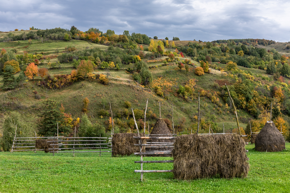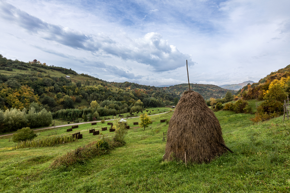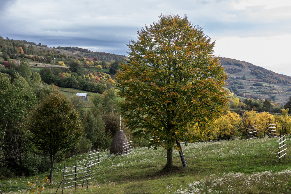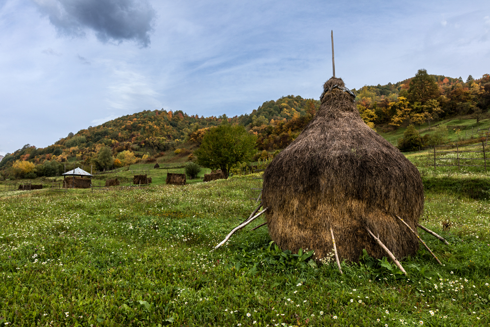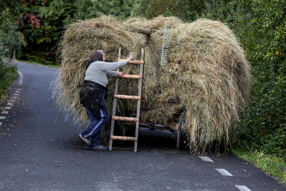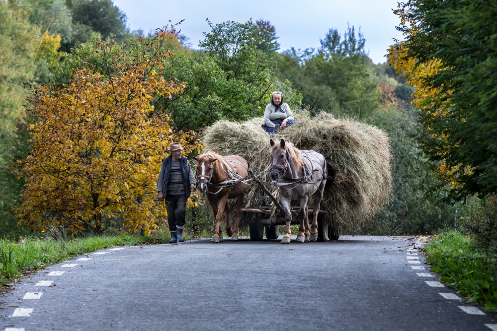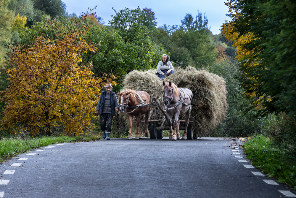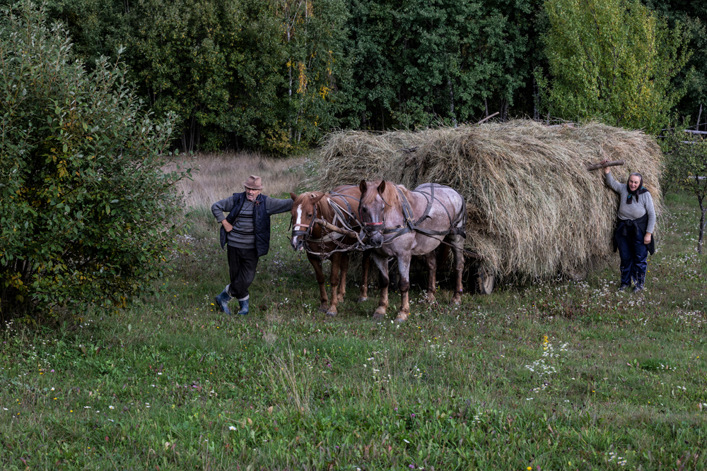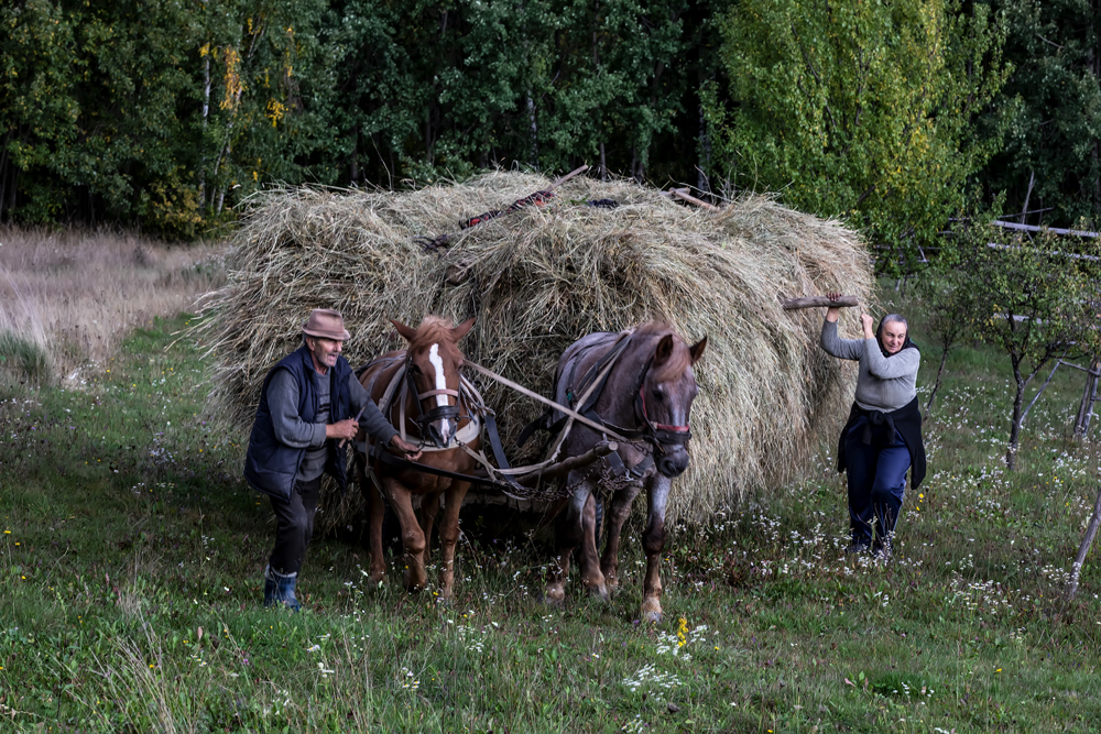 Ich packe die Kamera weg und denke: Zeit für Frühstück! Gut gestärkt machen wir uns auf den Weg nach Oradea. Der Tag, der so vielversprechend begann, hat zwischenzeitlich schwere, graue, herbstliche Wolken vor die Sonne gehängt. Wir fahren durch eine typische Maramureș-Landschaft. Taleinschnitte mit leicht ansteigenden, sattgrünen Weiden, Heuhaufen, Inselbäume in prächtigen Herbstfarben in allen Schattierungen. Kurz vor Glod sehen wir auf einem Feld einen Pferdewagen und ein älteres Ehepaar, die den Wagen mit Heu aus einem jener für Maramureș so typischen, halbkugelförmigen Heuhaufen beladen. Natürlich halten wir dort an und erfahren das Grigore und Ana den heiligen Sonntag dazu nutzen das Heu einzufahren, da es in den letzten Tagen immer wieder geregnet hat und auch die Wettervorhersage für die kommenden Tage nicht gut ist, wollen die beiden eine Ladung in die heimische Scheune bringen. Mehr als eine Stunde begleiten wir die Beiden, wie sie mit Ihren Forken das Heu auf den Wagen schichten, mit schweren Balken die Ladung sichern, wie sie die Pferde anschirren, wie Ana auf einer wackeligen Leiter auf den Wagen krabbelt, auf dem sie wie eine Königin thront und ihr Wagen schließlich außer Sicht kommt. …and than the rain begins to fall…