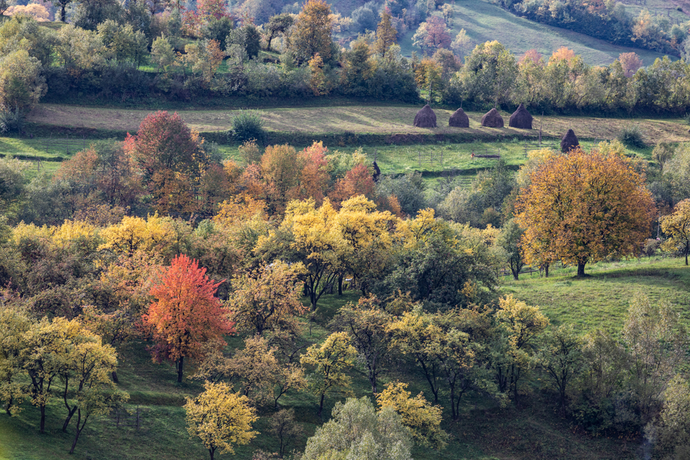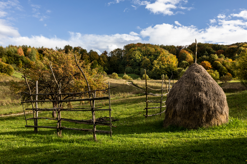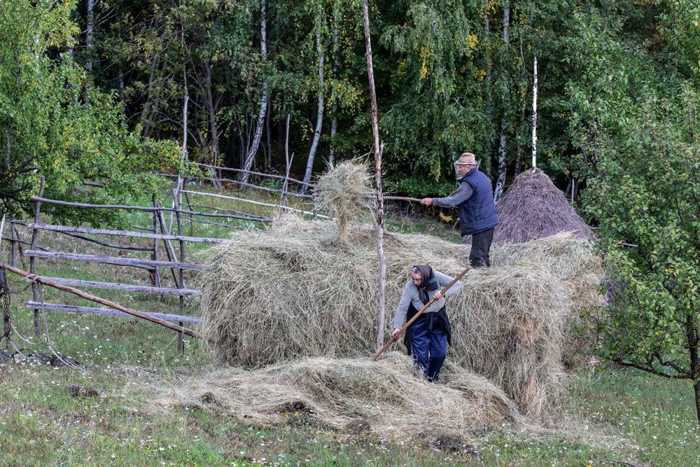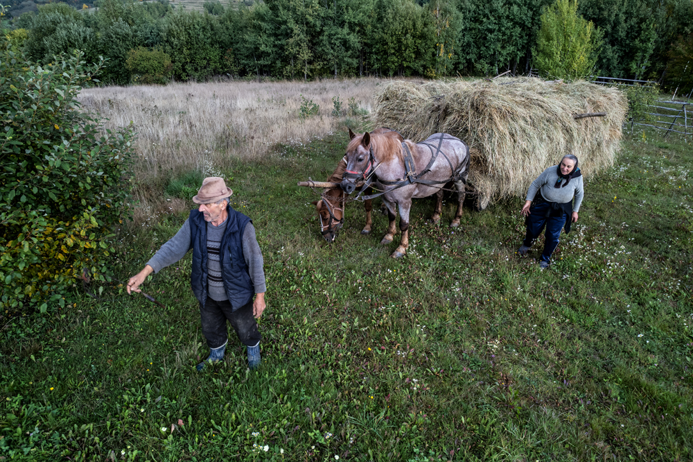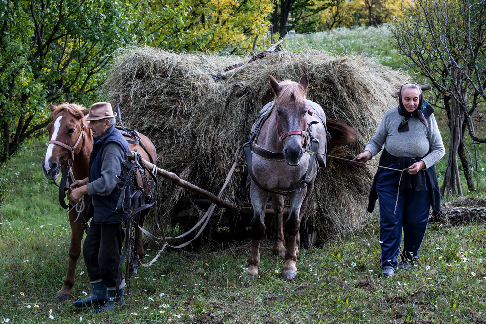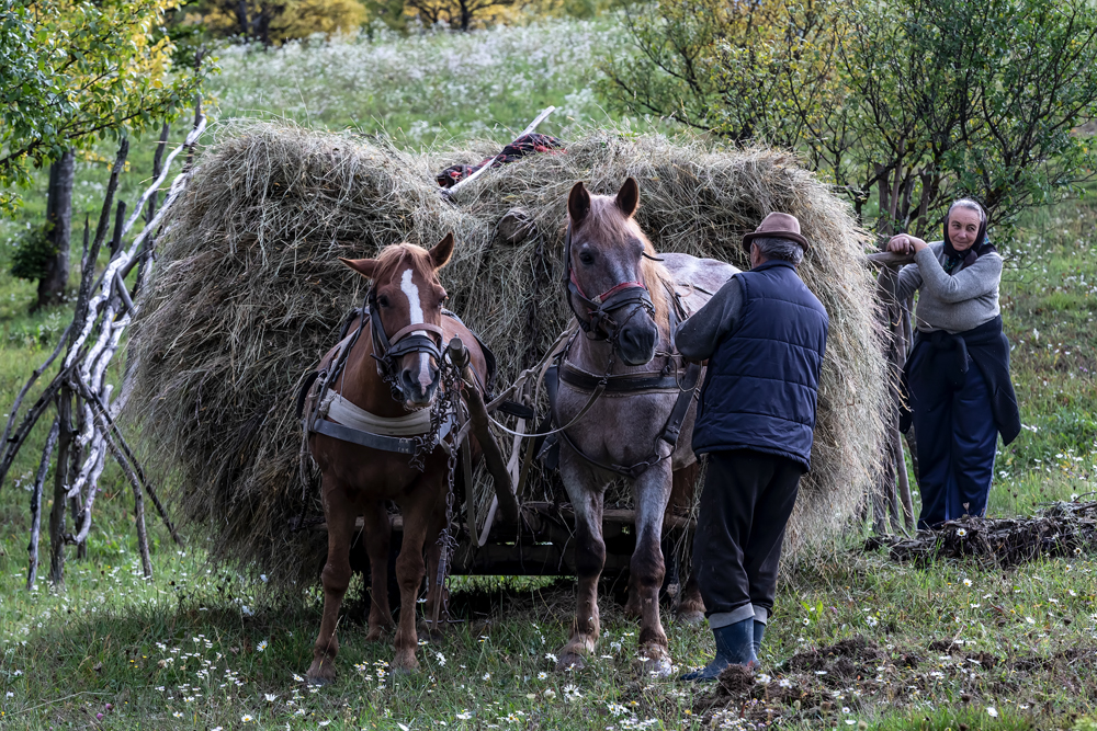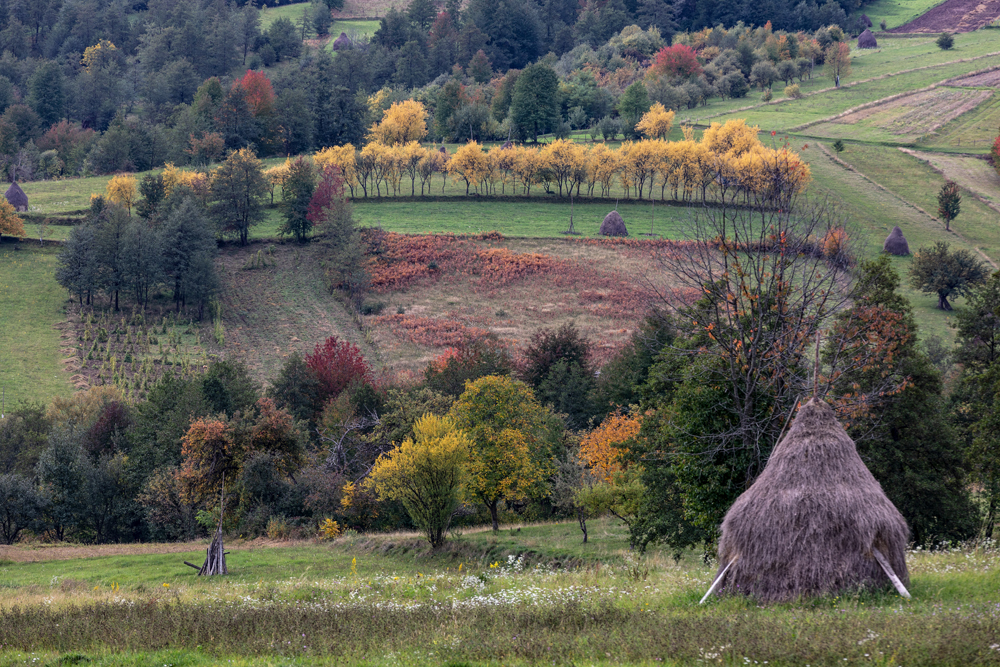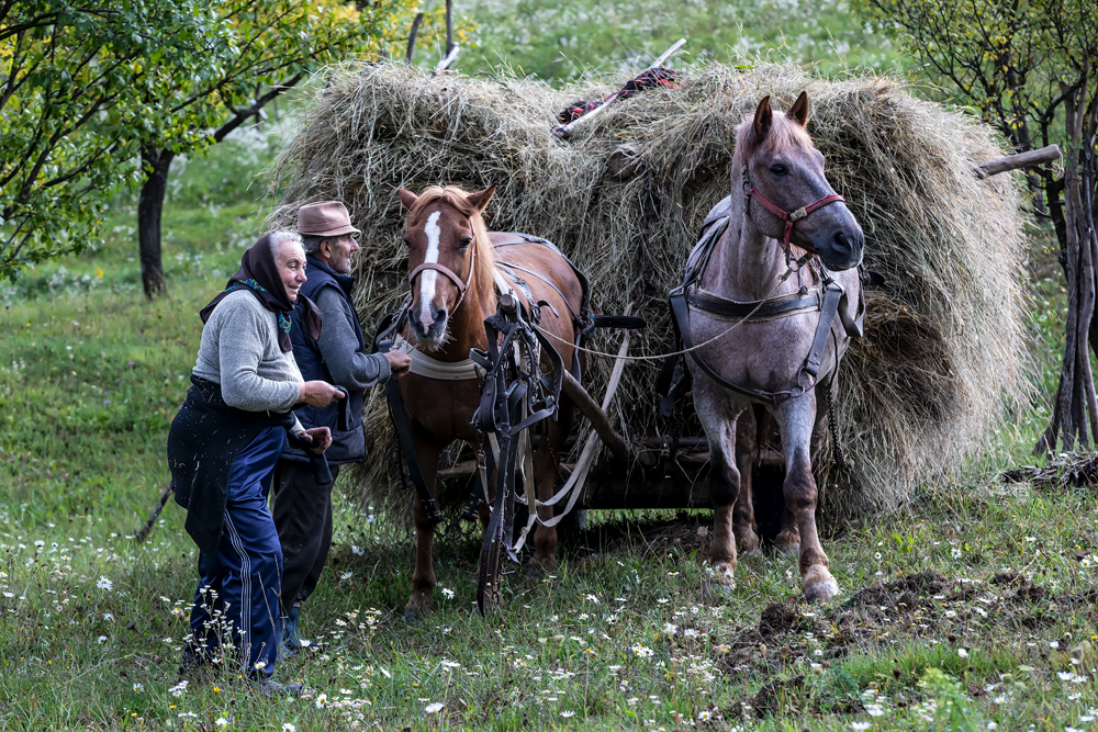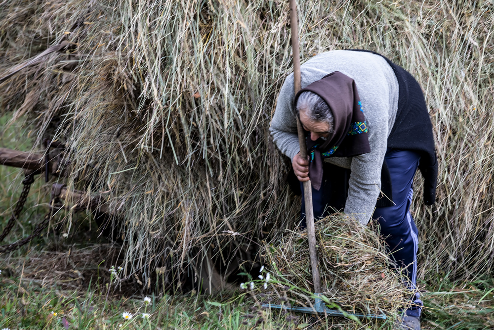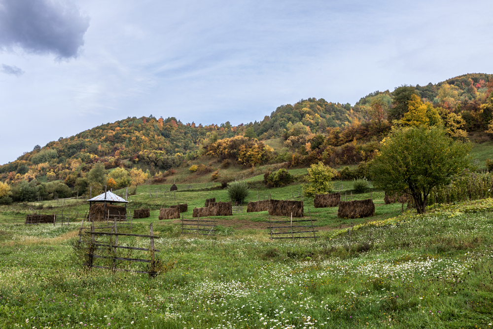 Ich packe die Kamera weg und denke: Zeit für Frühstück! Gut gestärkt machen wir uns auf den Weg nach Oradea. Der Tag, der so vielversprechend begann, hat zwischenzeitlich schwere, graue, herbstliche Wolken vor die Sonne gehängt. Wir fahren durch eine typische Maramureș-Landschaft. Taleinschnitte mit leicht ansteigenden, sattgrünen Weiden, Heuhaufen, Inselbäume in prächtigen Herbstfarben in allen Schattierungen. Kurz vor Glod sehen wir auf einem Feld einen Pferdewagen und ein älteres Ehepaar, die den Wagen mit Heu aus einem jener für Maramureș so typischen, halbkugelförmigen Heuhaufen beladen. Natürlich halten wir dort an und erfahren das Grigore und Ana den heiligen Sonntag dazu nutzen das Heu einzufahren, da es in den letzten Tagen immer wieder geregnet hat und auch die Wettervorhersage für die kommenden Tage nicht gut ist, wollen die beiden eine Ladung in die heimische Scheune bringen. Mehr als eine Stunde begleiten wir die Beiden, wie sie mit Ihren Forken das Heu auf den Wagen schichten, mit schweren Balken die Ladung sichern, wie sie die Pferde anschirren, wie Ana auf einer wackeligen Leiter auf den Wagen krabbelt, auf dem sie wie eine Königin thront und ihr Wagen schließlich außer Sicht kommt. …and than the rain begins to fall…