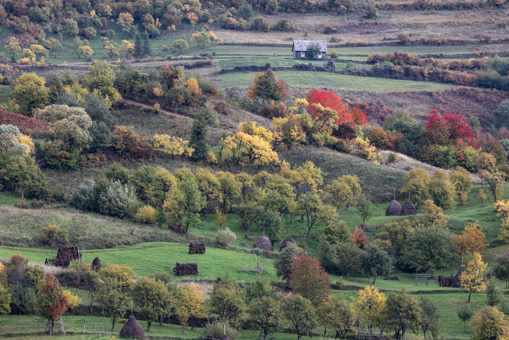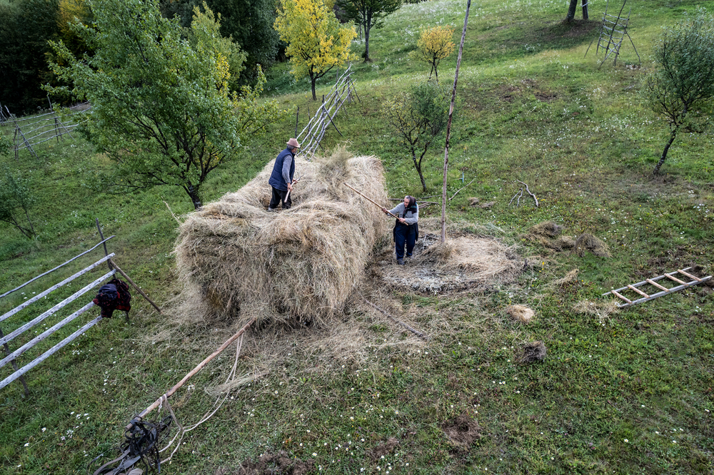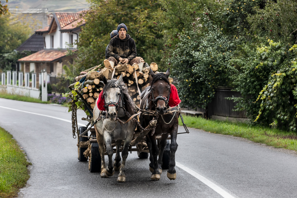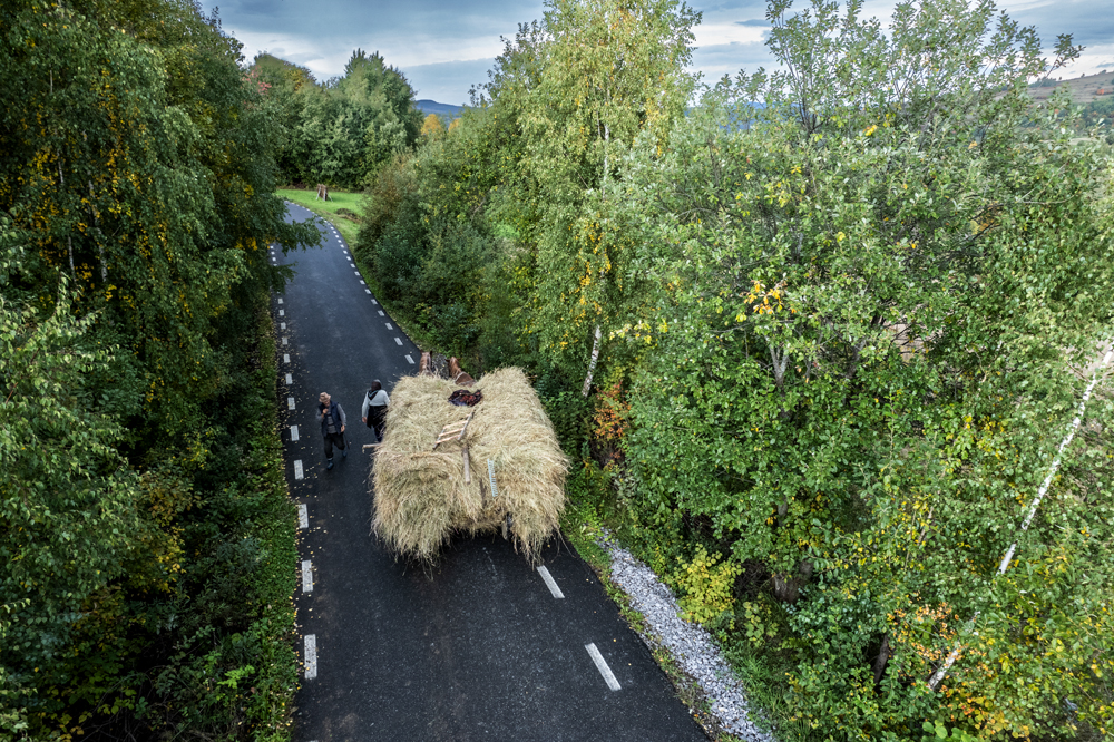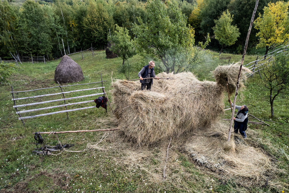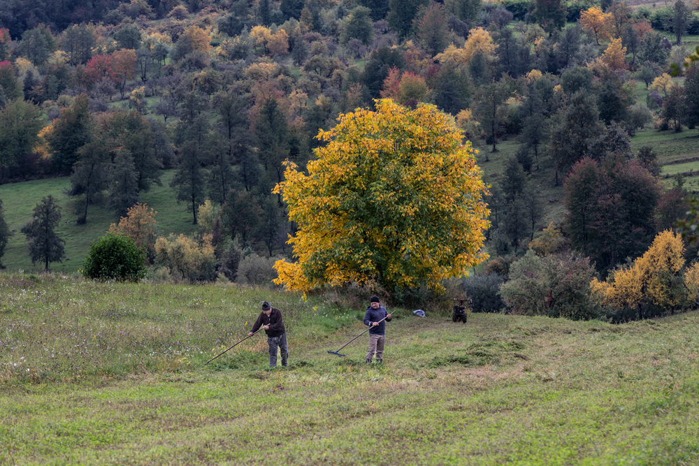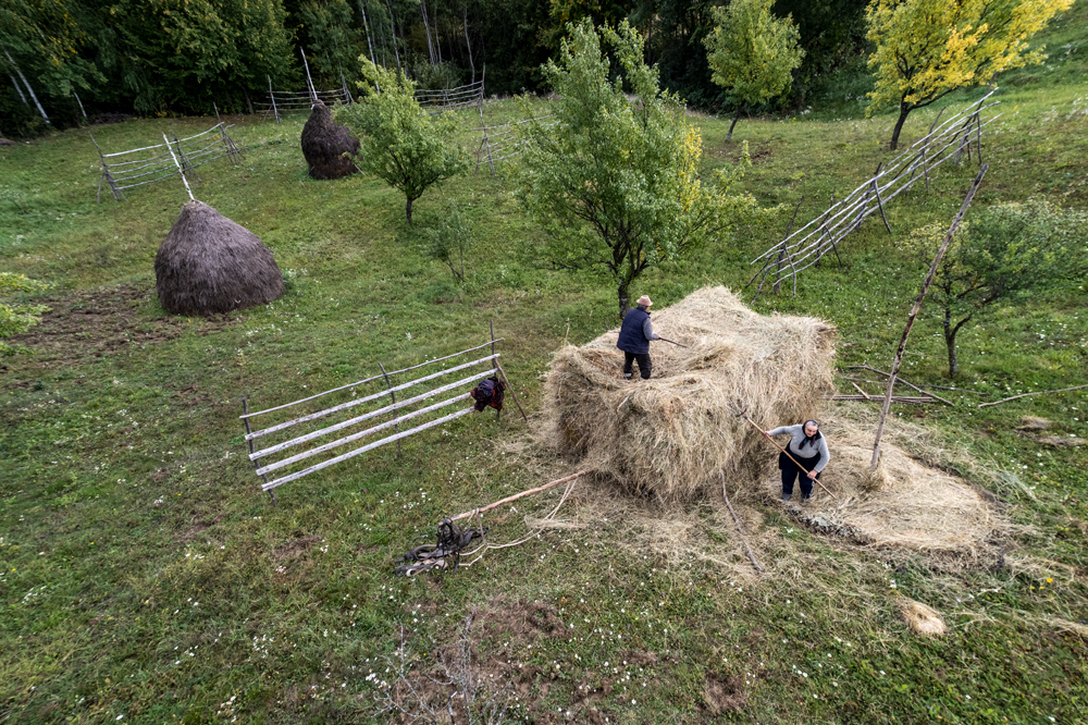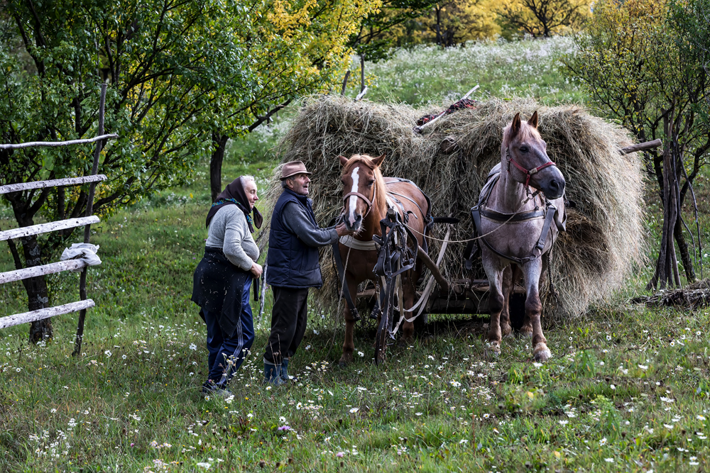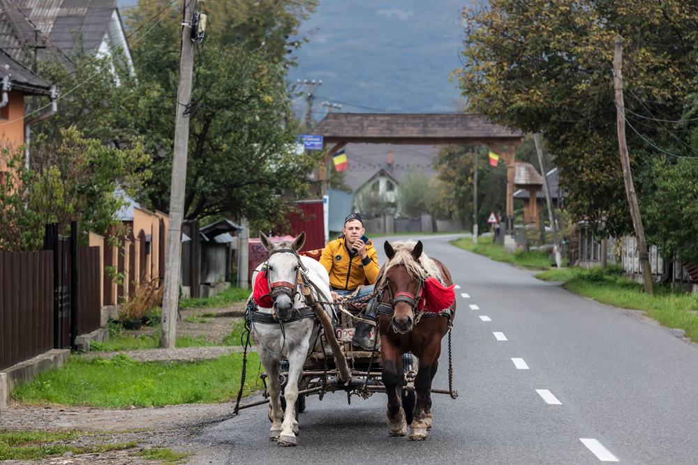 Ich packe die Kamera weg und denke: Zeit für Frühstück! Gut gestärkt machen wir uns auf den Weg nach Oradea. Der Tag, der so vielversprechend begann, hat zwischenzeitlich schwere, graue, herbstliche Wolken vor die Sonne gehängt. Wir fahren durch eine typische Maramureș-Landschaft. Taleinschnitte mit leicht ansteigenden, sattgrünen Weiden, Heuhaufen, Inselbäume in prächtigen Herbstfarben in allen Schattierungen. Kurz vor Glod sehen wir auf einem Feld einen Pferdewagen und ein älteres Ehepaar, die den Wagen mit Heu aus einem jener für Maramureș so typischen, halbkugelförmigen Heuhaufen beladen. Natürlich halten wir dort an und erfahren das Grigore und Ana den heiligen Sonntag dazu nutzen das Heu einzufahren, da es in den letzten Tagen immer wieder geregnet hat und auch die Wettervorhersage für die kommenden Tage nicht gut ist, wollen die beiden eine Ladung in die heimische Scheune bringen. Mehr als eine Stunde begleiten wir die Beiden, wie sie mit Ihren Forken das Heu auf den Wagen schichten, mit schweren Balken die Ladung sichern, wie sie die Pferde anschirren, wie Ana auf einer wackeligen Leiter auf den Wagen krabbelt, auf dem sie wie eine Königin thront und ihr Wagen schließlich außer Sicht kommt. …and than the rain begins to fall…