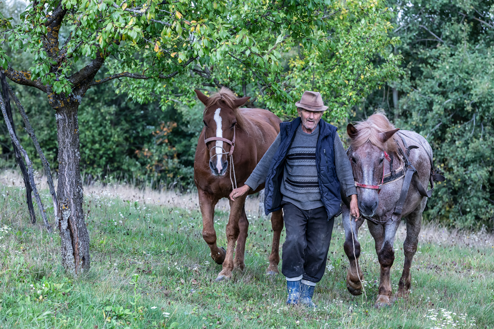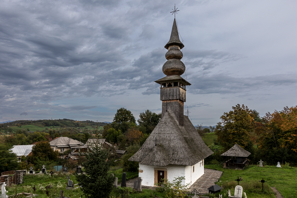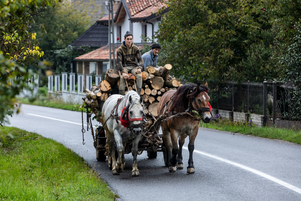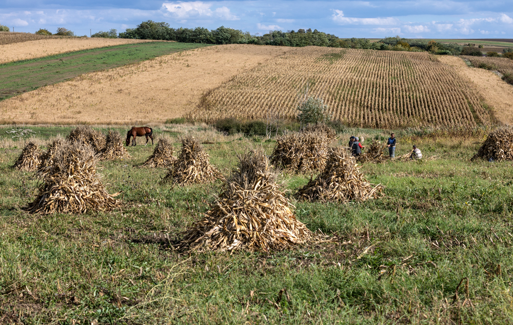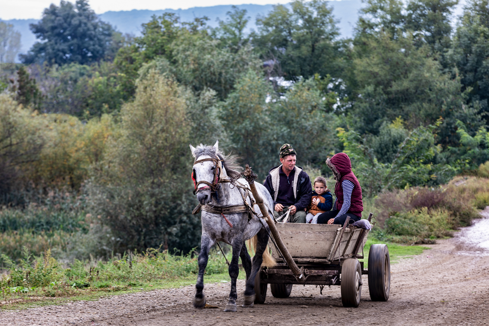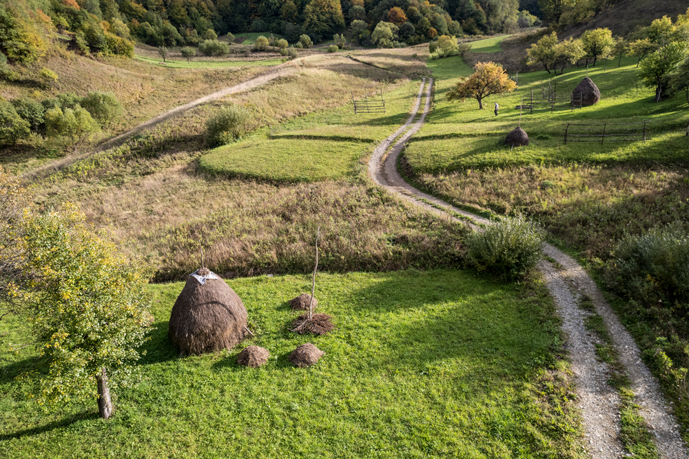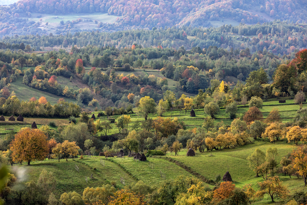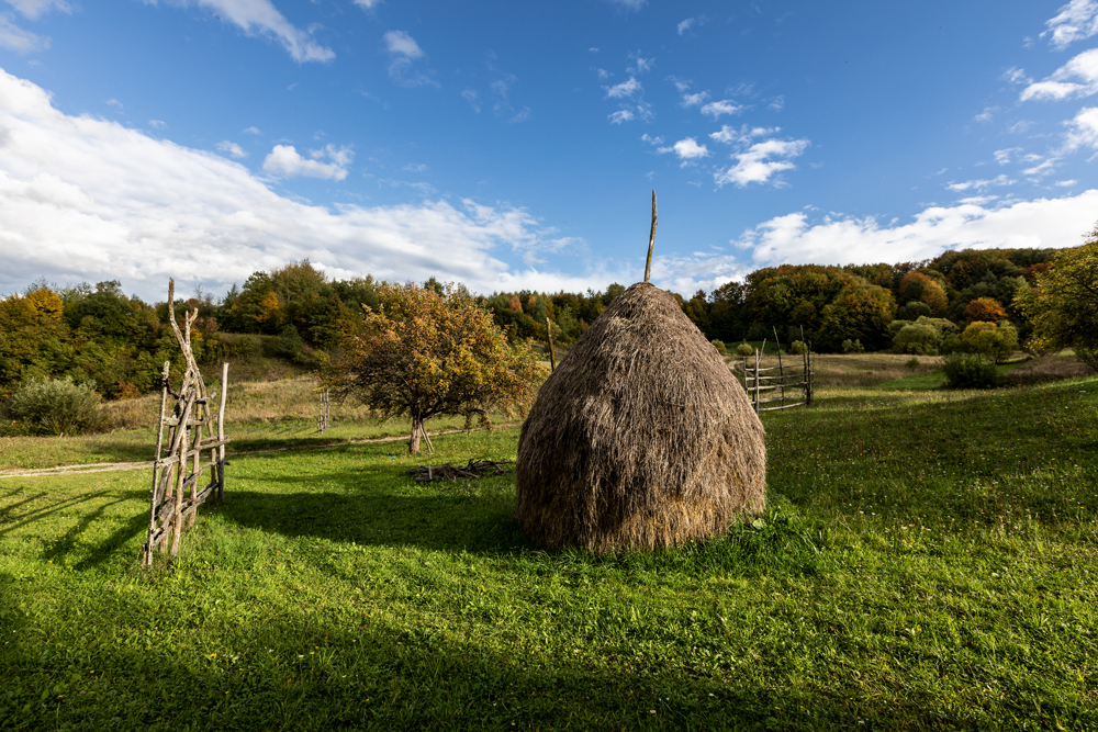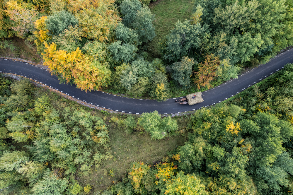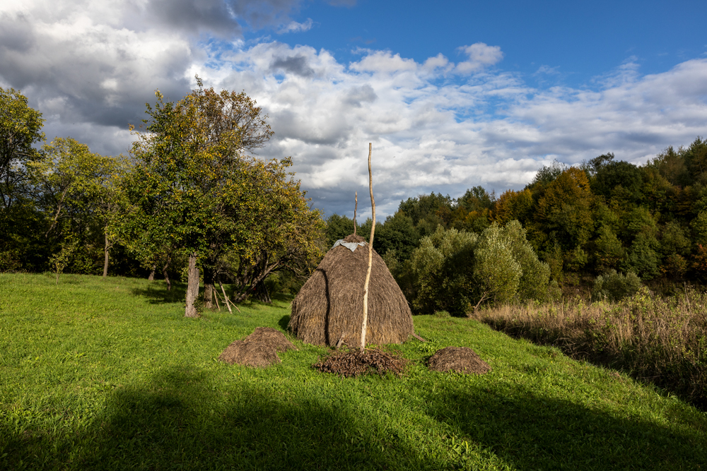 Ich packe die Kamera weg und denke: Zeit für Frühstück! Gut gestärkt machen wir uns auf den Weg nach Oradea. Der Tag, der so vielversprechend begann, hat zwischenzeitlich schwere, graue, herbstliche Wolken vor die Sonne gehängt. Wir fahren durch eine typische Maramureș-Landschaft. Taleinschnitte mit leicht ansteigenden, sattgrünen Weiden, Heuhaufen, Inselbäume in prächtigen Herbstfarben in allen Schattierungen. Kurz vor Glod sehen wir auf einem Feld einen Pferdewagen und ein älteres Ehepaar, die den Wagen mit Heu aus einem jener für Maramureș so typischen, halbkugelförmigen Heuhaufen beladen. Natürlich halten wir dort an und erfahren das Grigore und Ana den heiligen Sonntag dazu nutzen das Heu einzufahren, da es in den letzten Tagen immer wieder geregnet hat und auch die Wettervorhersage für die kommenden Tage nicht gut ist, wollen die beiden eine Ladung in die heimische Scheune bringen. Mehr als eine Stunde begleiten wir die Beiden, wie sie mit Ihren Forken das Heu auf den Wagen schichten, mit schweren Balken die Ladung sichern, wie sie die Pferde anschirren, wie Ana auf einer wackeligen Leiter auf den Wagen krabbelt, auf dem sie wie eine Königin thront und ihr Wagen schließlich außer Sicht kommt. …and than the rain begins to fall…