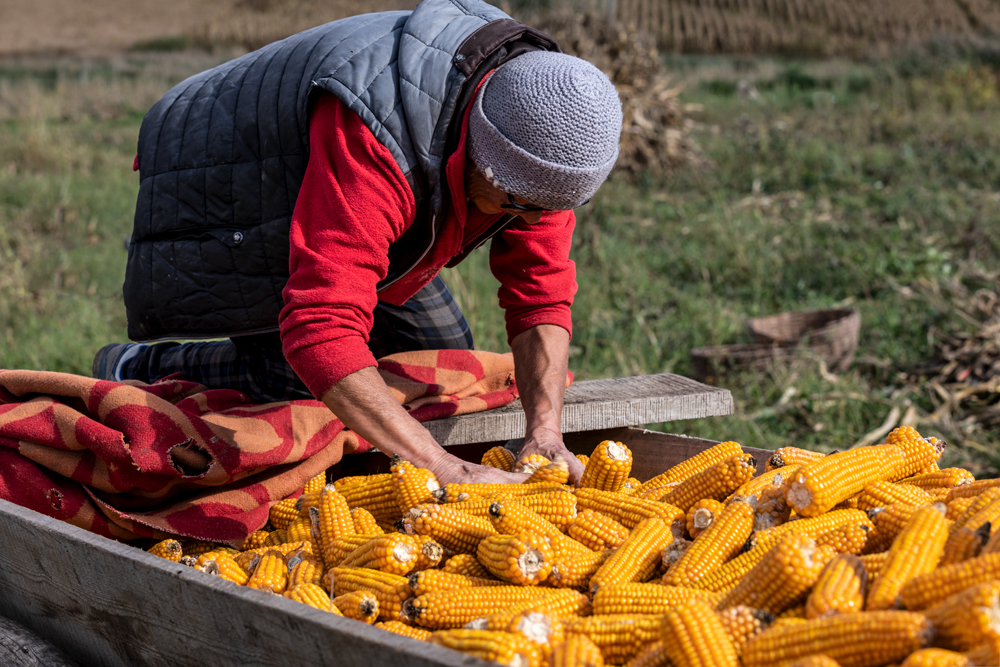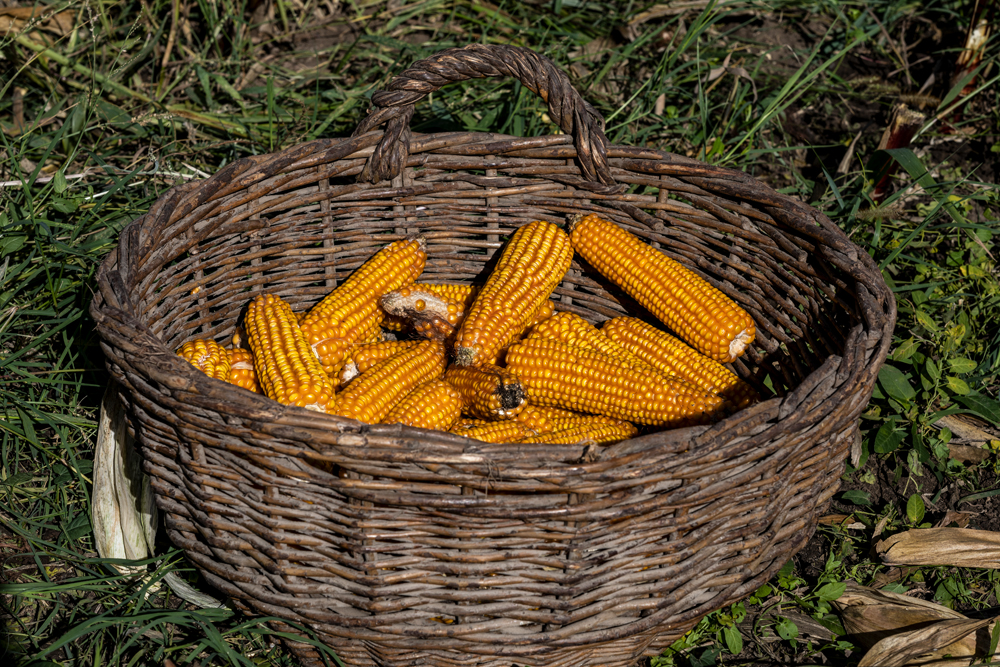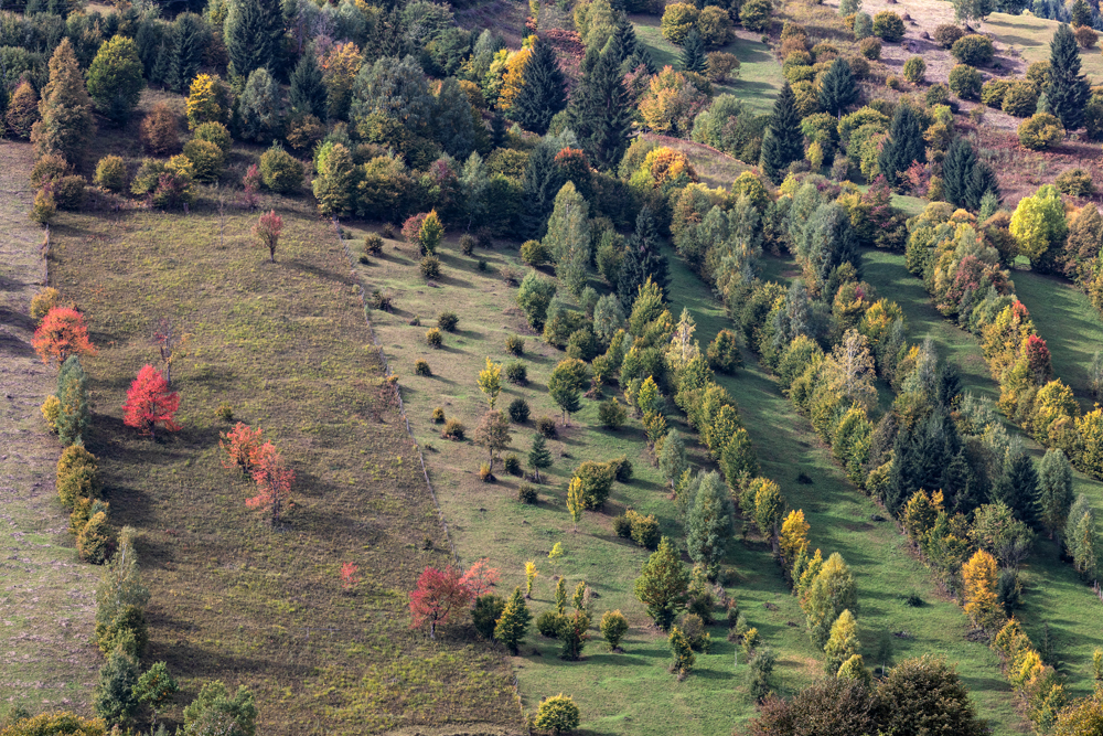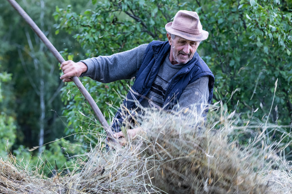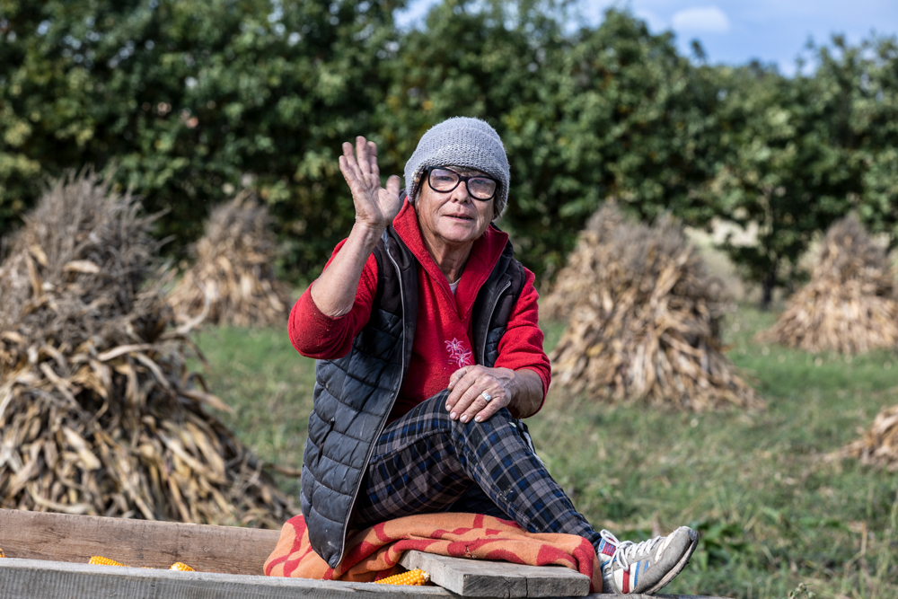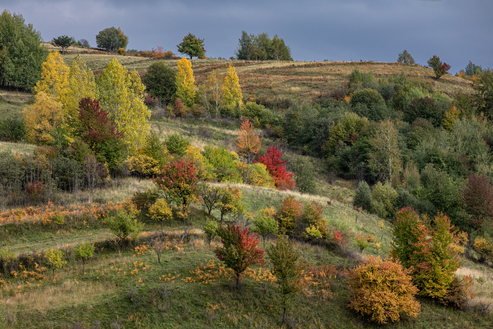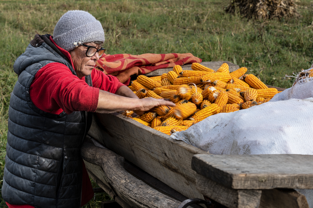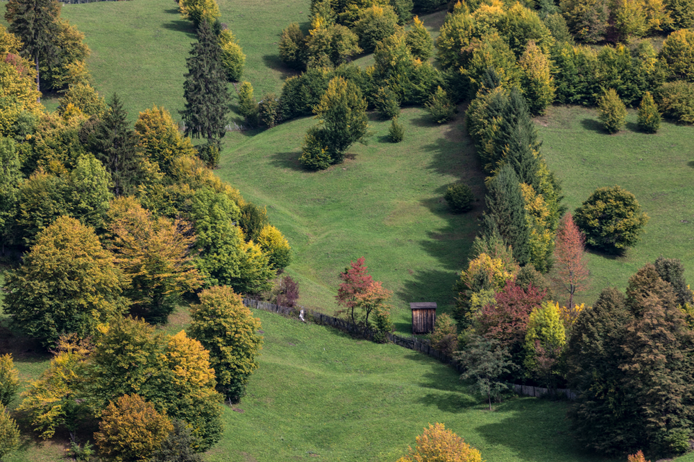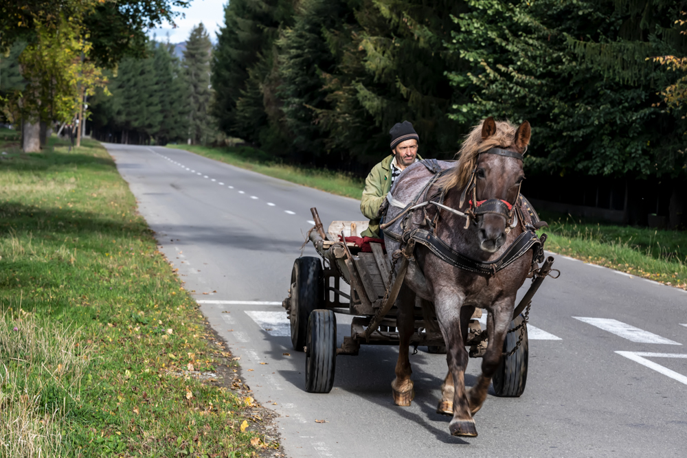 Ich packe die Kamera weg und denke: Zeit für Frühstück! Gut gestärkt machen wir uns auf den Weg nach Oradea. Der Tag, der so vielversprechend begann, hat zwischenzeitlich schwere, graue, herbstliche Wolken vor die Sonne gehängt. Wir fahren durch eine typische Maramureș-Landschaft. Taleinschnitte mit leicht ansteigenden, sattgrünen Weiden, Heuhaufen, Inselbäume in prächtigen Herbstfarben in allen Schattierungen. Kurz vor Glod sehen wir auf einem Feld einen Pferdewagen und ein älteres Ehepaar, die den Wagen mit Heu aus einem jener für Maramureș so typischen, halbkugelförmigen Heuhaufen beladen. Natürlich halten wir dort an und erfahren das Grigore und Ana den heiligen Sonntag dazu nutzen das Heu einzufahren, da es in den letzten Tagen immer wieder geregnet hat und auch die Wettervorhersage für die kommenden Tage nicht gut ist, wollen die beiden eine Ladung in die heimische Scheune bringen. Mehr als eine Stunde begleiten wir die Beiden, wie sie mit Ihren Forken das Heu auf den Wagen schichten, mit schweren Balken die Ladung sichern, wie sie die Pferde anschirren, wie Ana auf einer wackeligen Leiter auf den Wagen krabbelt, auf dem sie wie eine Königin thront und ihr Wagen schließlich außer Sicht kommt. …and than the rain begins to fall…