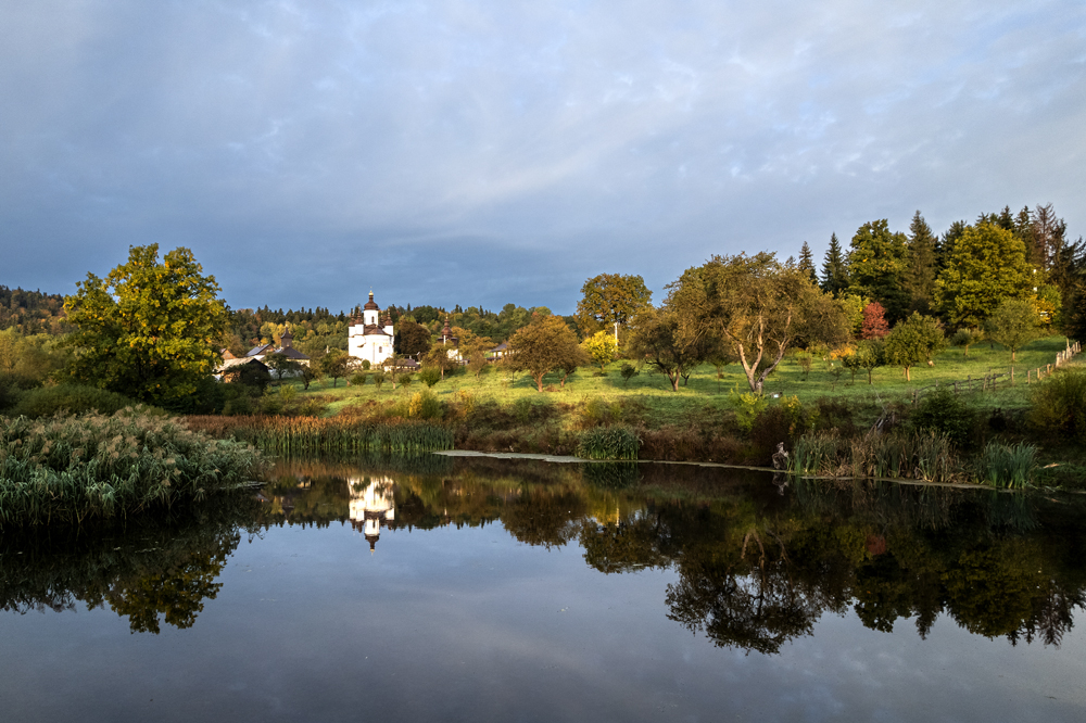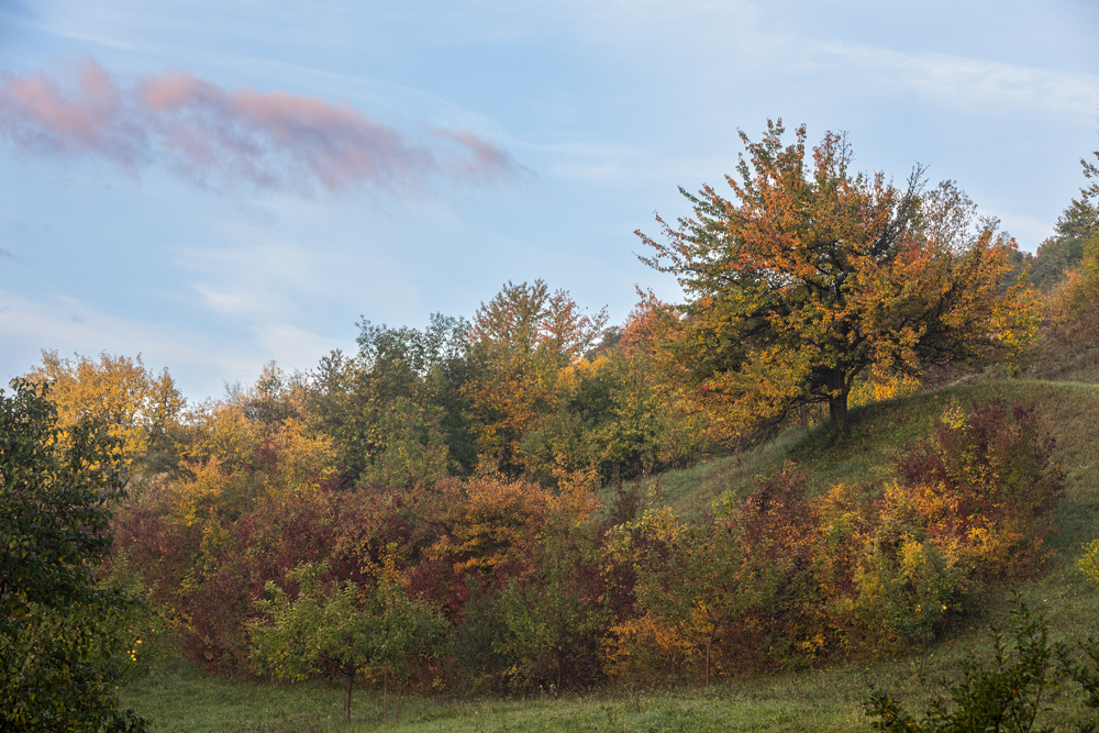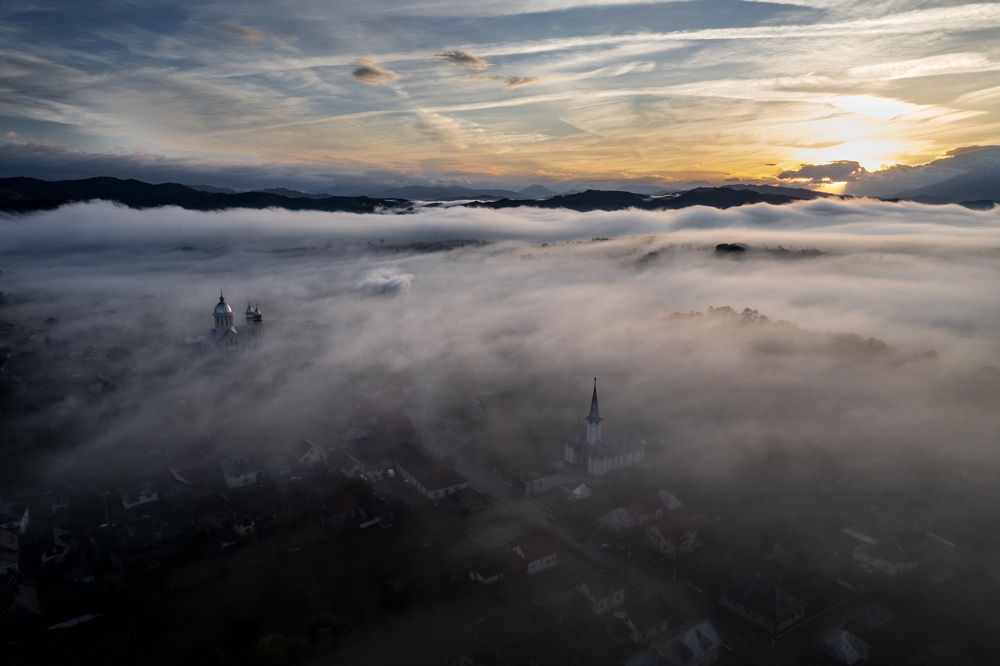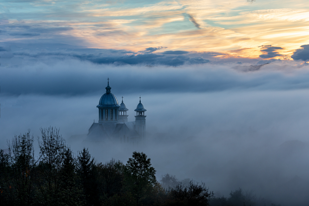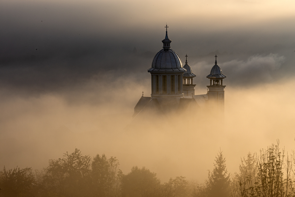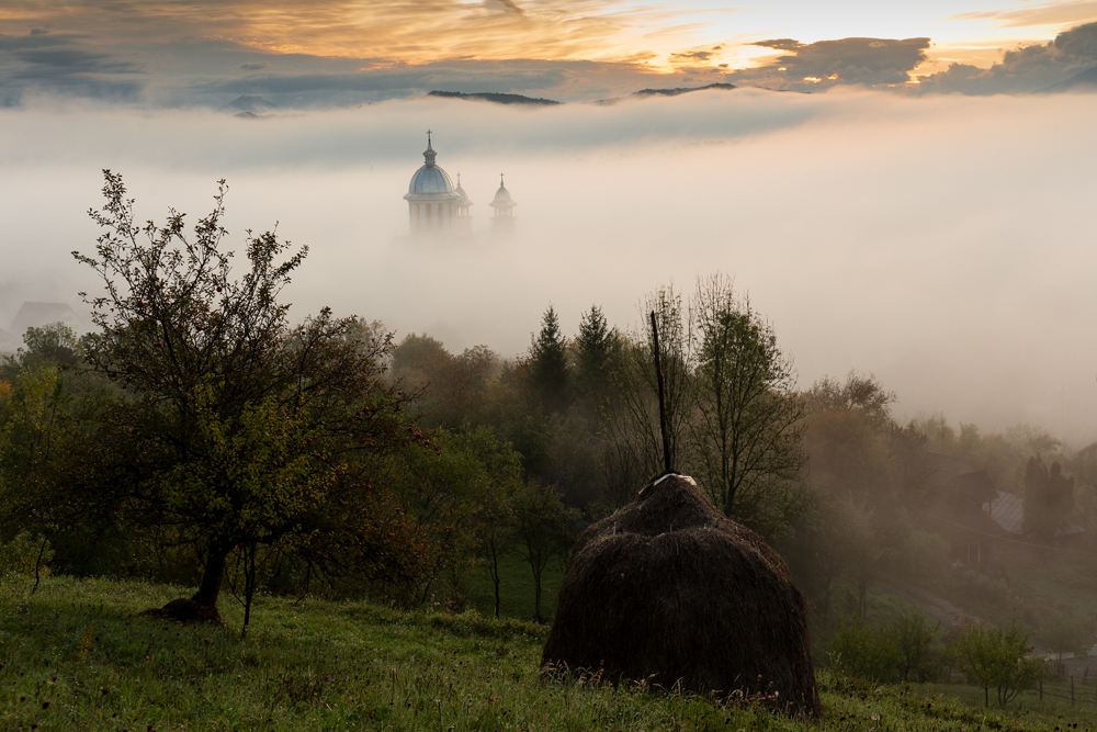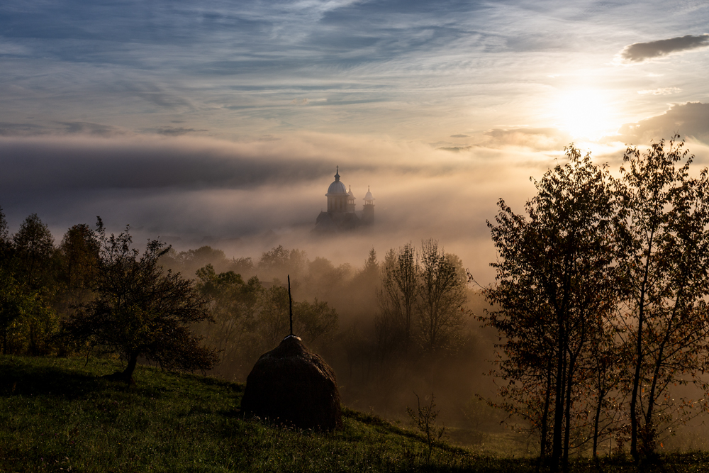 Nach dem wunderschönen Sonnenaufgang des Vortages, hoffe ich auf eine Wiederholung und bin schon früh unterwegs. Aber erstens kommt es anders, zweitens als man denkt. Der Nebel, der mich draußen empfängt, ist so dicht, dass man die nur wenig entfernt liegende Kirche nicht sehen kann… und da ist er wieder, der Saint-Exupéry-Effekt: “Die schönste Freude erlebt man immer dann, wenn man sie am wenigsten erwartet“. Die Sonne geht auf, brennt immer wieder Löcher in die schnellziehenden Nebelschwaden. Erste Sonnenstrahlen durchdringen die Wolkentürme. Kirchturmspitzen ragen durch die Nebeldecke, Bäume im herbstlichen Kleid und Heuhaufen werden kurz sichtbar und verschwinden gleich darauf wieder im Nebel. Die höher steigende Morgensonne färbt den Nebel orange. Fast eine Stunde hält dieser Zauber an, bevor die Sonne endgültig den Nebel besiegt. Es ist Sonntag. Gedämpft höre ich in der Ferne die Kirchenglocken von Ieud.