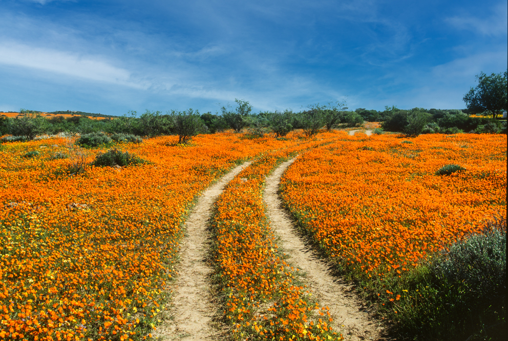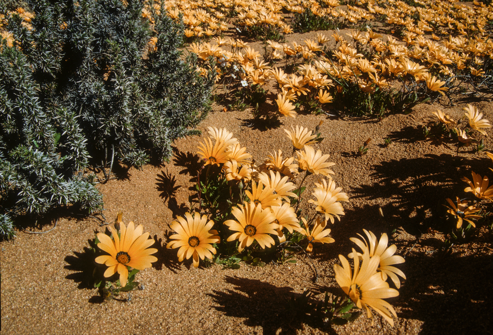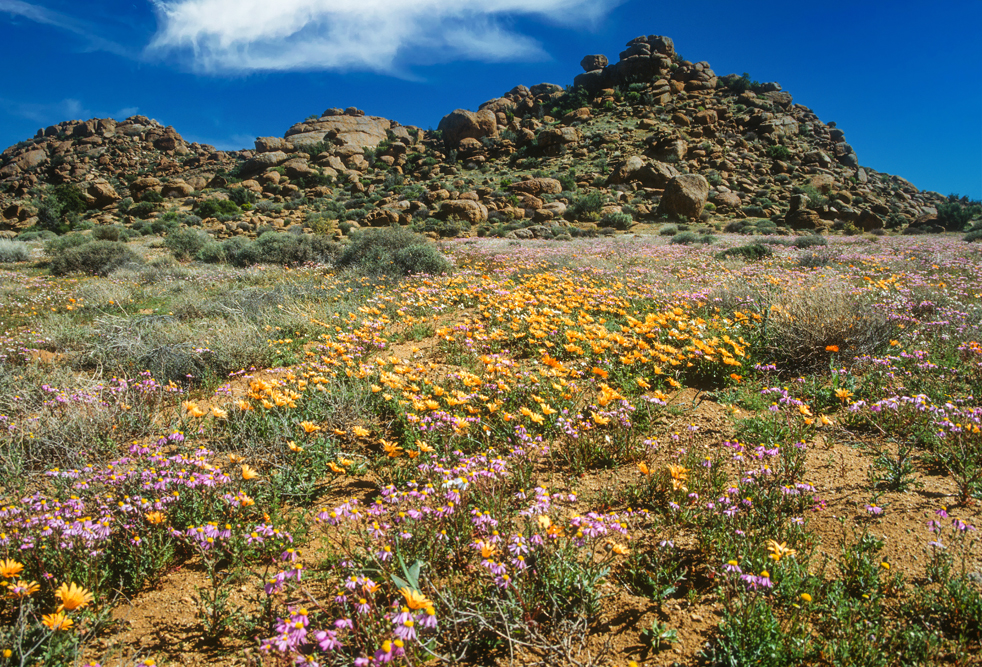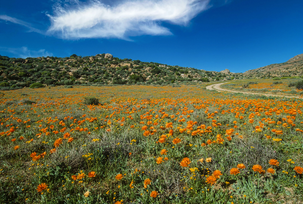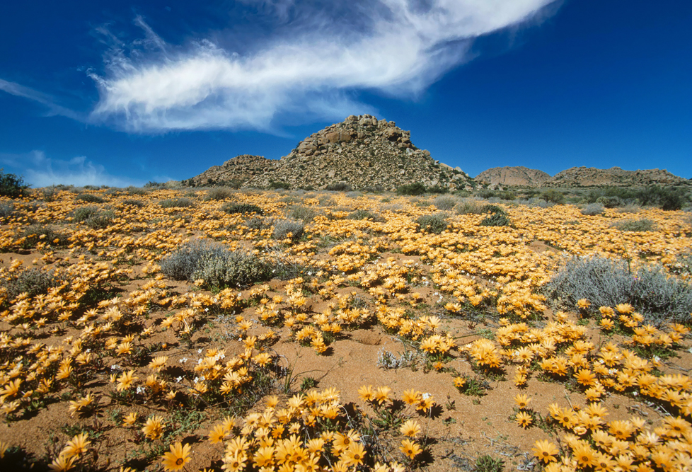 Das Namaqualand im Nordwesten Südafrikas, wirkt den größten Teil des Jahres wie eine uralte, runzelige Haut, unattraktiv, in tristen Grau- Braun- und Grüntönen. Ein Landstrich, von herbem Charme. Einmal im Jahr jedoch, im Frühling, legt die Natur für 2 Wochen ihre prächtigsten Sonntagskleider an. Das Buschland verwandelt sich in ein Meer aus blühenden, orangefarbenen Mittagsblumen. Felder aus Margariten und Maßliebchen, so weit das Auge reicht. Den rechten Zeitpunkt zu treffen, ist reine Glückssache; wir haben dieses Glück, und wandern 3 Tage durch das Malan Nature Reserve in all seiner Blütenpracht.