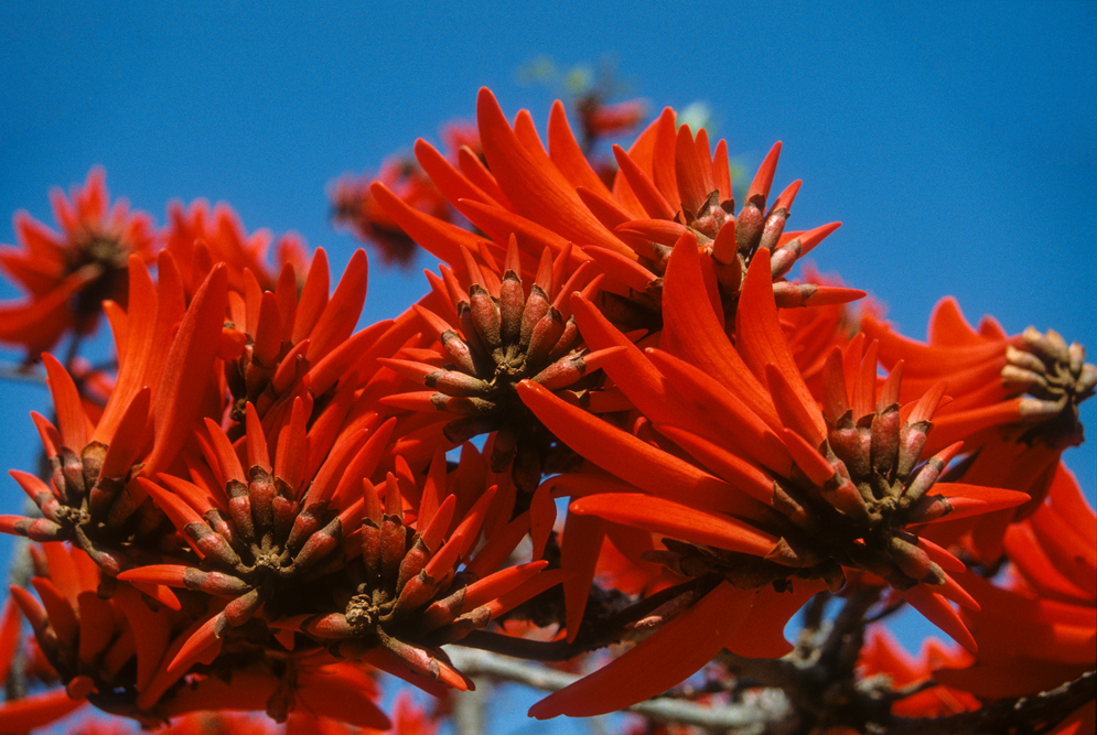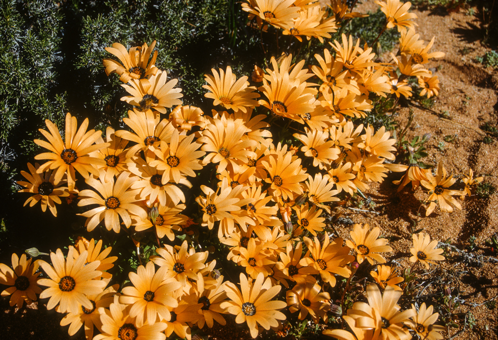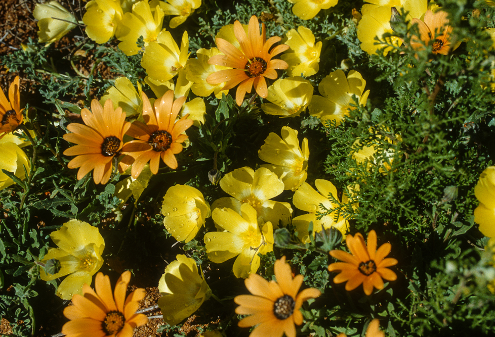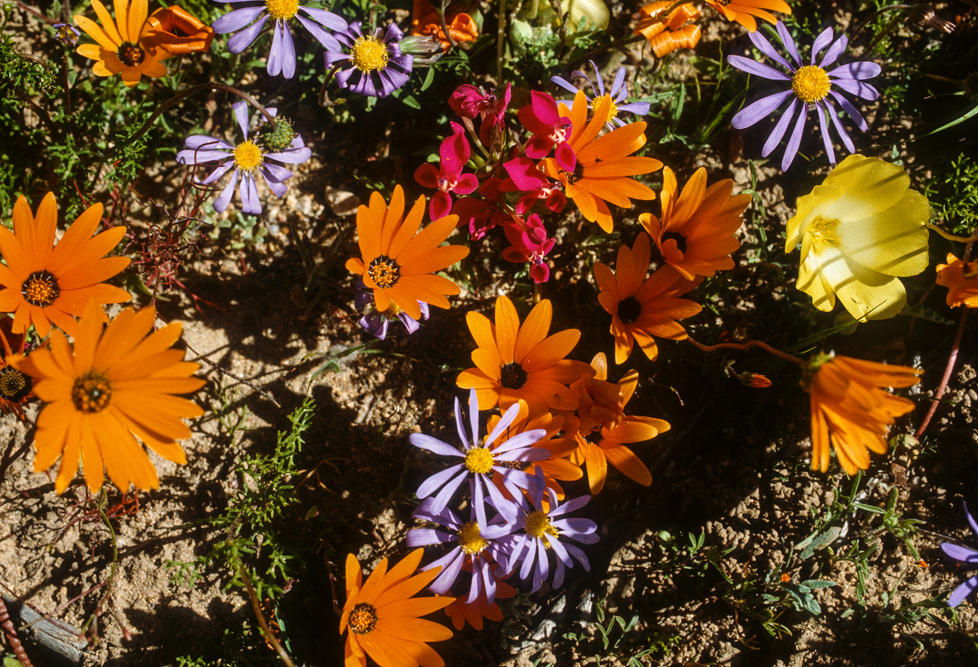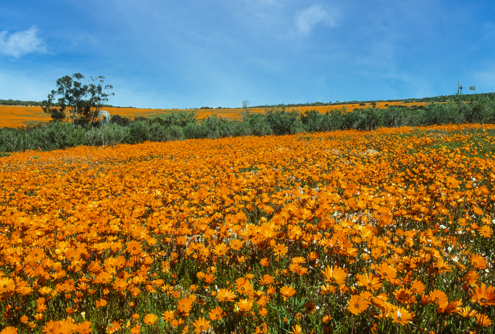 Das Namaqualand im Nordwesten Südafrikas, wirkt den größten Teil des Jahres wie eine uralte, runzelige Haut, unattraktiv, in tristen Grau- Braun- und Grüntönen. Ein Landstrich, von herbem Charme. Einmal im Jahr jedoch, im Frühling, legt die Natur für 2 Wochen ihre prächtigsten Sonntagskleider an. Das Buschland verwandelt sich in ein Meer aus blühenden, orangefarbenen Mittagsblumen. Felder aus Margariten und Maßliebchen, so weit das Auge reicht. Den rechten Zeitpunkt zu treffen, ist reine Glückssache; wir haben dieses Glück, und wandern 3 Tage durch das Malan Nature Reserve in all seiner Blütenpracht.