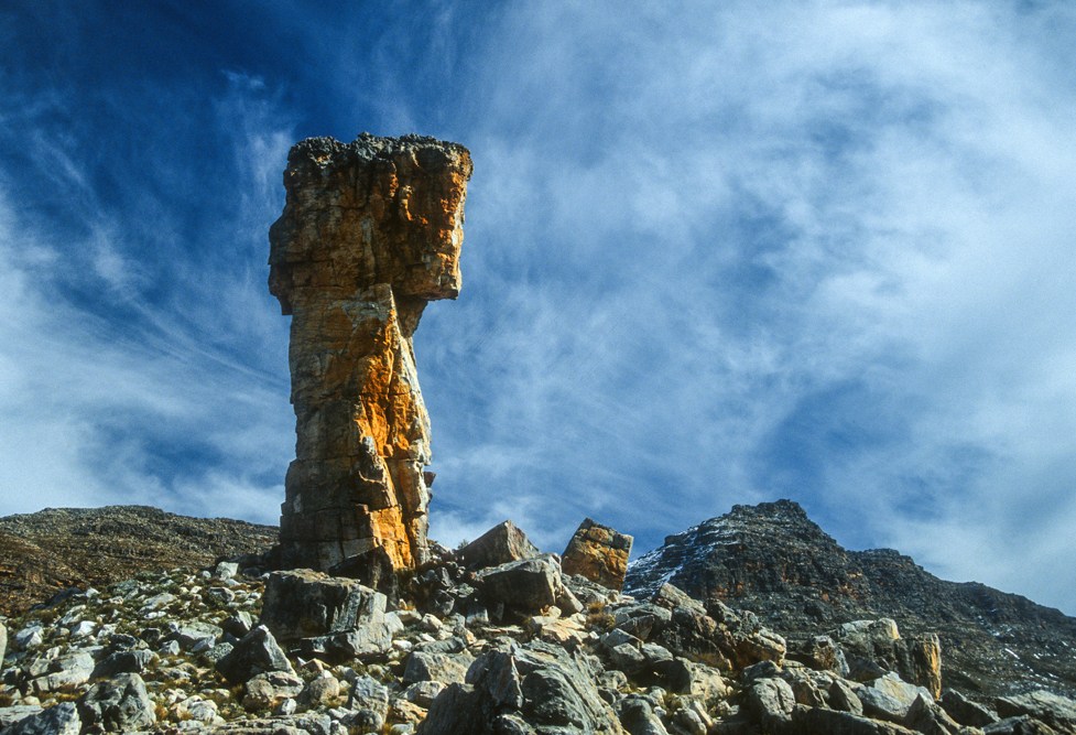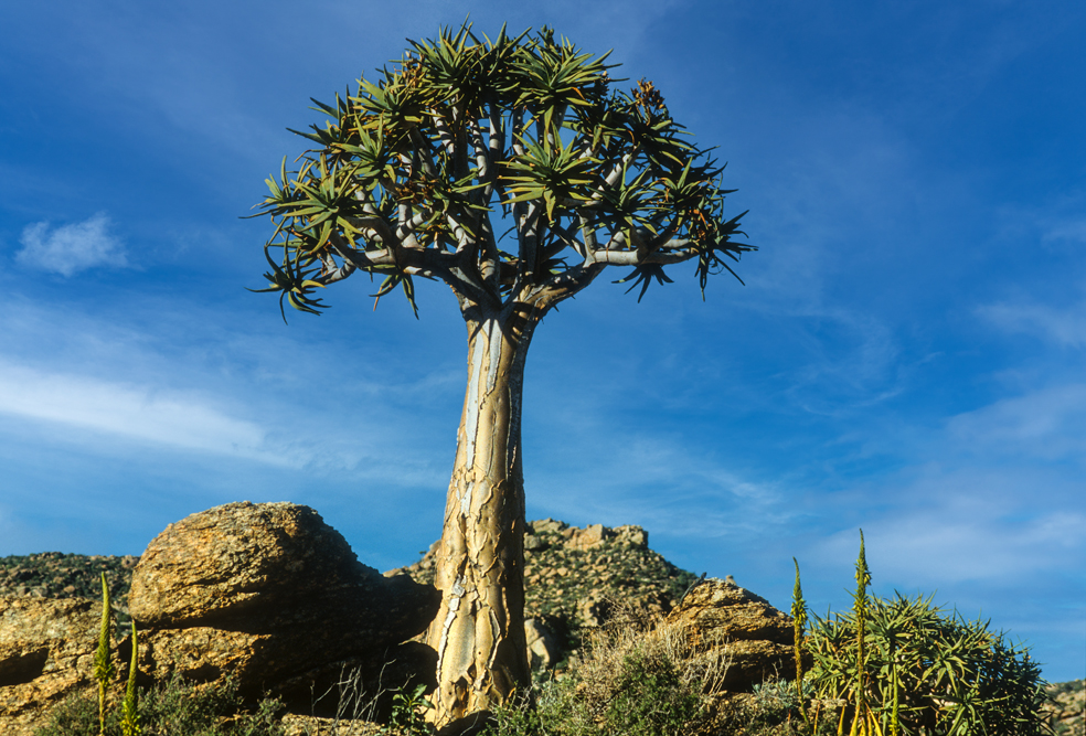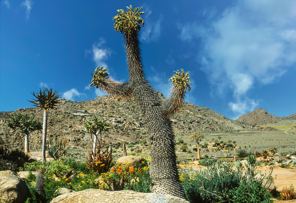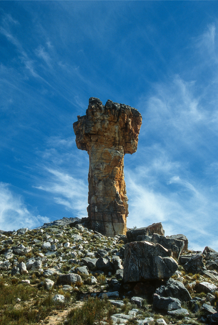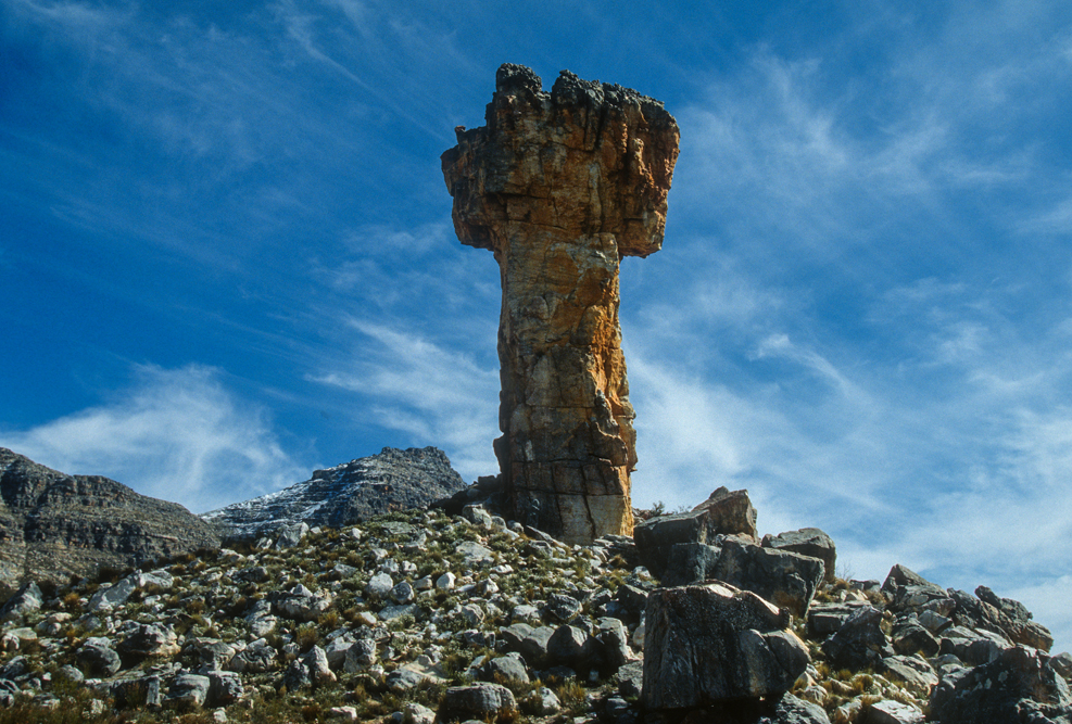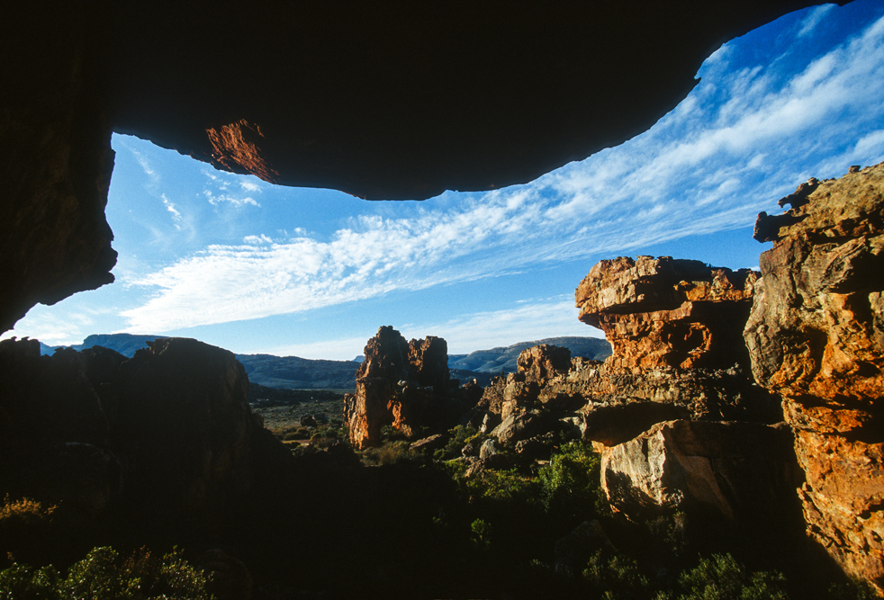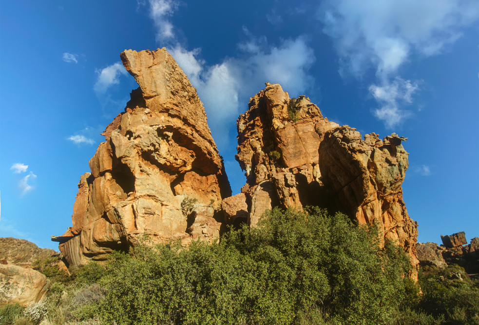 Wenig bekannt ist auch die Berglandschaft der Cedar Mountains, ein Schutzgebiet für Leoparden. Ich mache Station auf der Niewoudt Brothers Farm, um auf langen Wanderungen die Bergwelt zu erkunden. Pieter Niewoudt bringt mich mit seinem Traktor zum Einstieg in eine Felsformation, die sich Malteser Kreuz nennt und als Felsnadel aus einem Höhenzug ragt. Anstrengend ist der pfadlose Weg durch das Gebirge; so freue ich mich, dass unsere Gastgeber die Gäste abends mit spritzigem südafrikanischen Wein und einem pikanten Geflügel-Eintopf überraschen. Hier sitzen schwarze Farmarbeiter am gleichen Tisch wie der Farmbesitzer und die Touristen, zu Zeiten der Apartheid noch ein Unding, heute eine Selbstverständlichkeit.