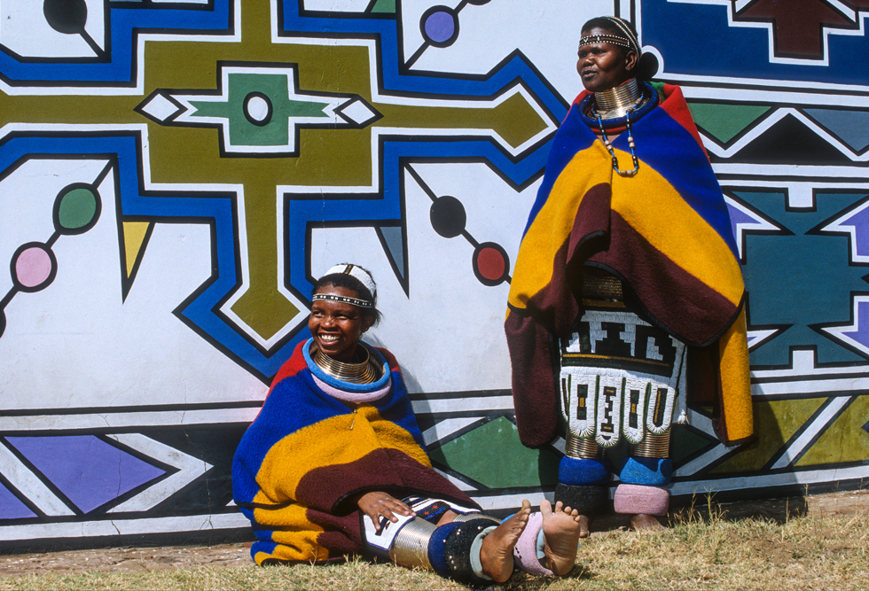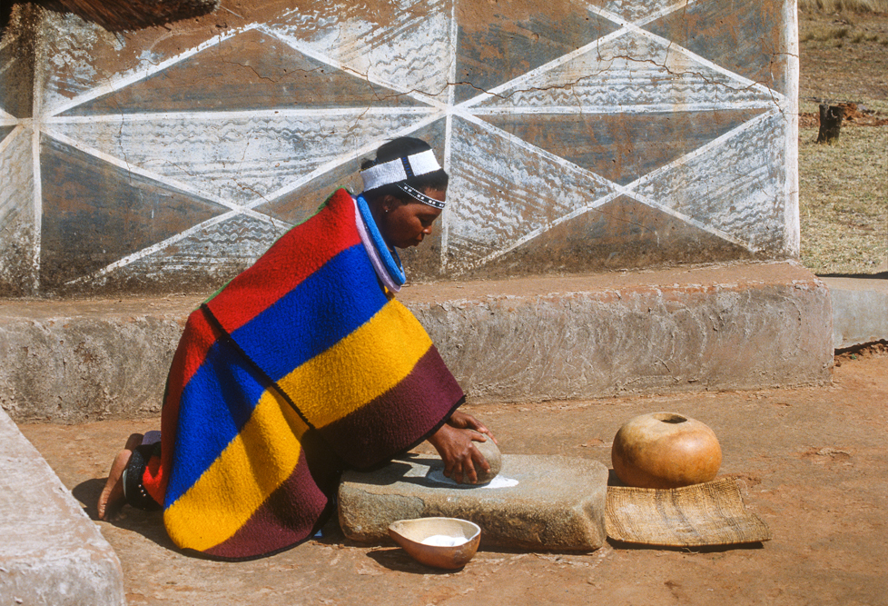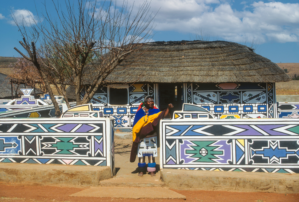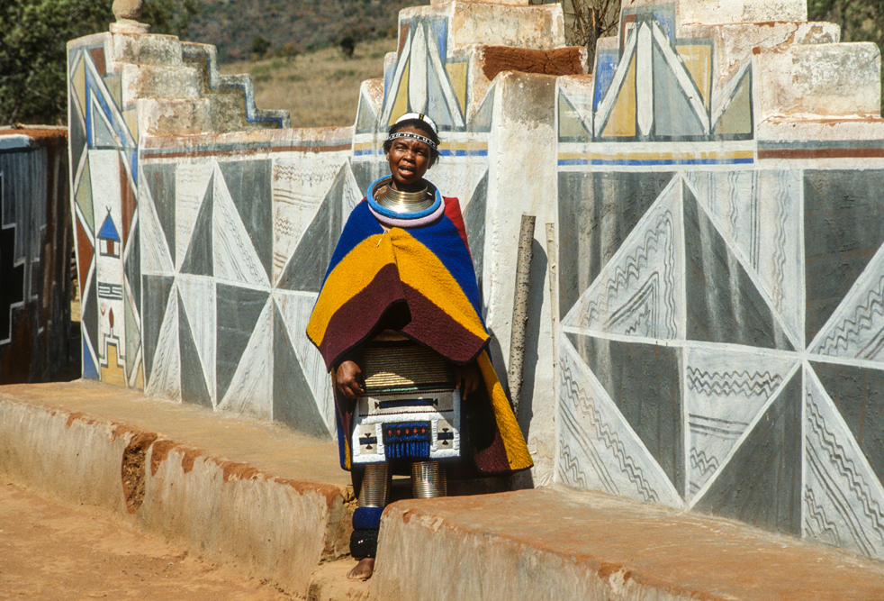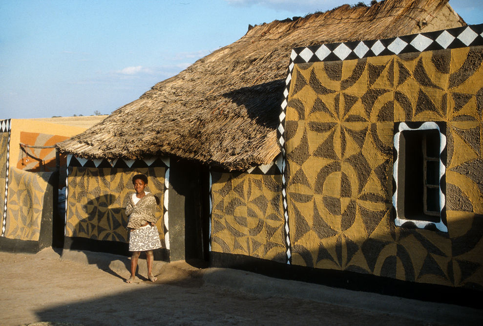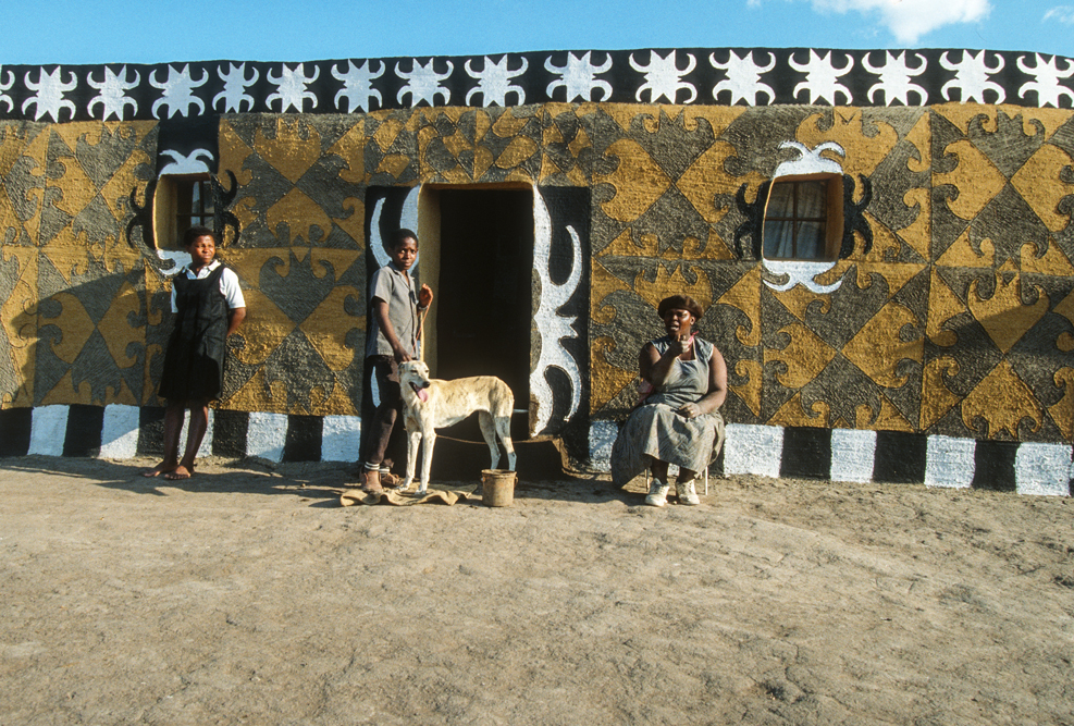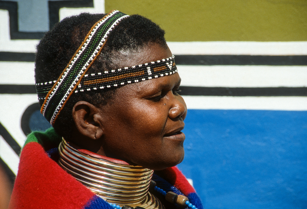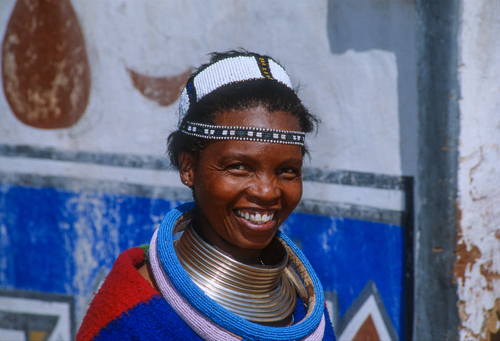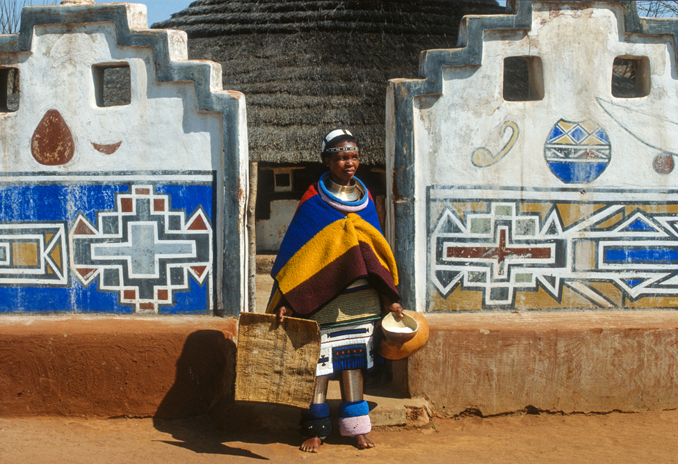 Ich bin froh als es weiter geht, denn nun kommt etwas, auf das ich mich schon lange gefreut hatte. In Deutschland hatte ich eine Ausstellung der Fotografin Margret Courtney-Clarke mit Ihren Bildern der Ndebele-Frauen gesehen. Und hier, unweit von Fort Merensky, gibt es die Botshabelo Mission, wo Leute vom Ndebele-Stamm sich noch die traditionelle Lebensweise bewahrt haben. Traumhaft bunt ist das Leben hier. Die Frauen tragen die vielfarbigen Decken, feingearbeiteten Perlenstickereien und schwere Messingringe um Hals und Fußgelenke. Ich sehe zu, wie eine Frau mit einem Pinsel aus Vogelfedern die geometrischen Muster auf die Hauswände malt; andere Frauen sitzen im Schatten und ziehen Perlen auf Schnüre oder mahlen Getreide nach alter Art und Weise auf den Reibestein. Männer sieht man nicht.
