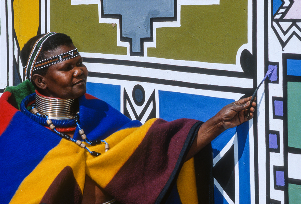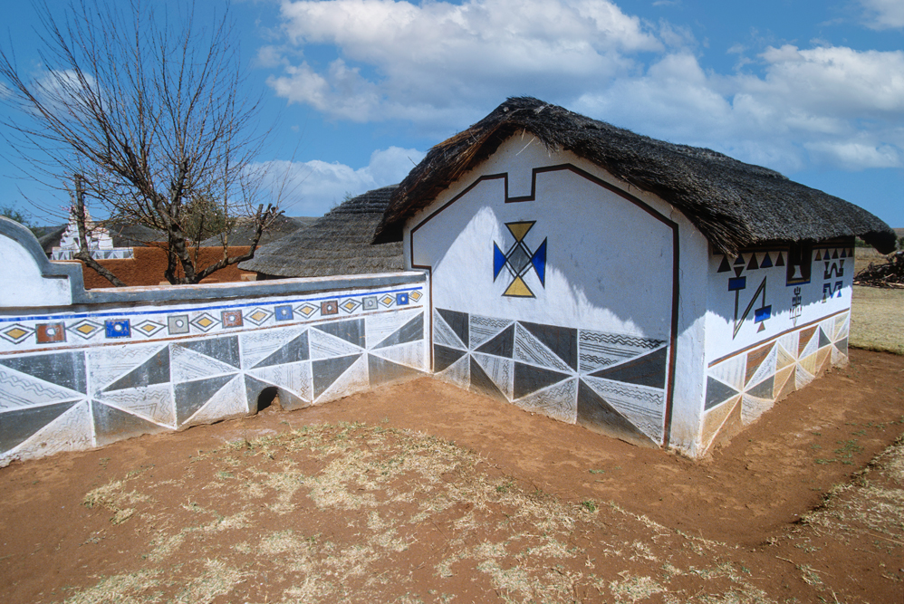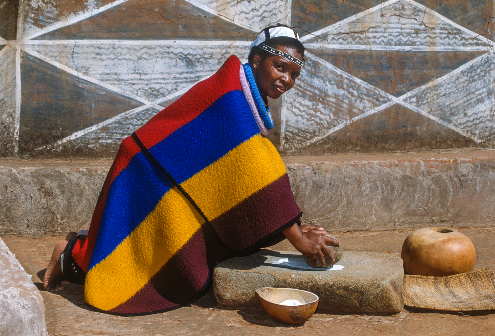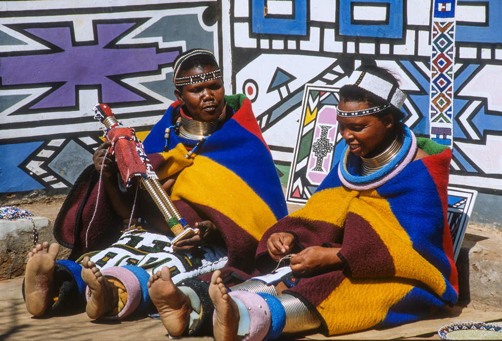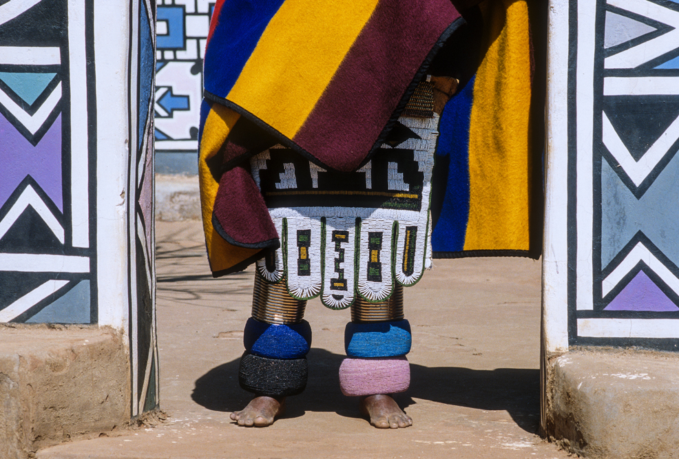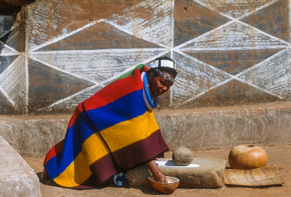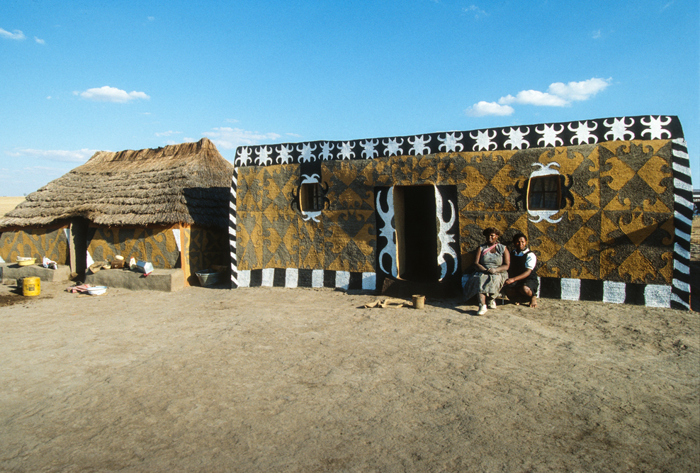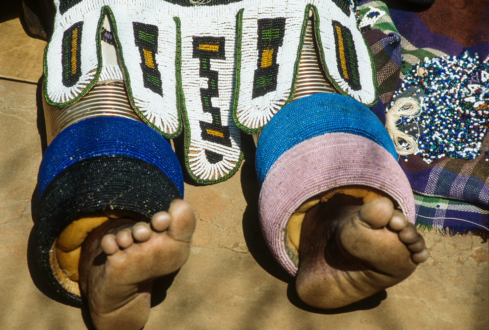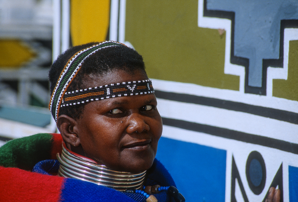 Ich bin froh als es weiter geht, denn nun kommt etwas, auf das ich mich schon lange gefreut hatte. In Deutschland hatte ich eine Ausstellung der Fotografin Margret Courtney-Clarke mit Ihren Bildern der Ndebele-Frauen gesehen. Und hier, unweit von Fort Merensky, gibt es die Botshabelo Mission, wo Leute vom Ndebele-Stamm sich noch die traditionelle Lebensweise bewahrt haben. Traumhaft bunt ist das Leben hier. Die Frauen tragen die vielfarbigen Decken, feingearbeiteten Perlenstickereien und schwere Messingringe um Hals und Fußgelenke. Ich sehe zu, wie eine Frau mit einem Pinsel aus Vogelfedern die geometrischen Muster auf die Hauswände malt; andere Frauen sitzen im Schatten und ziehen Perlen auf Schnüre oder mahlen Getreide nach alter Art und Weise auf den Reibestein. Männer sieht man nicht.
