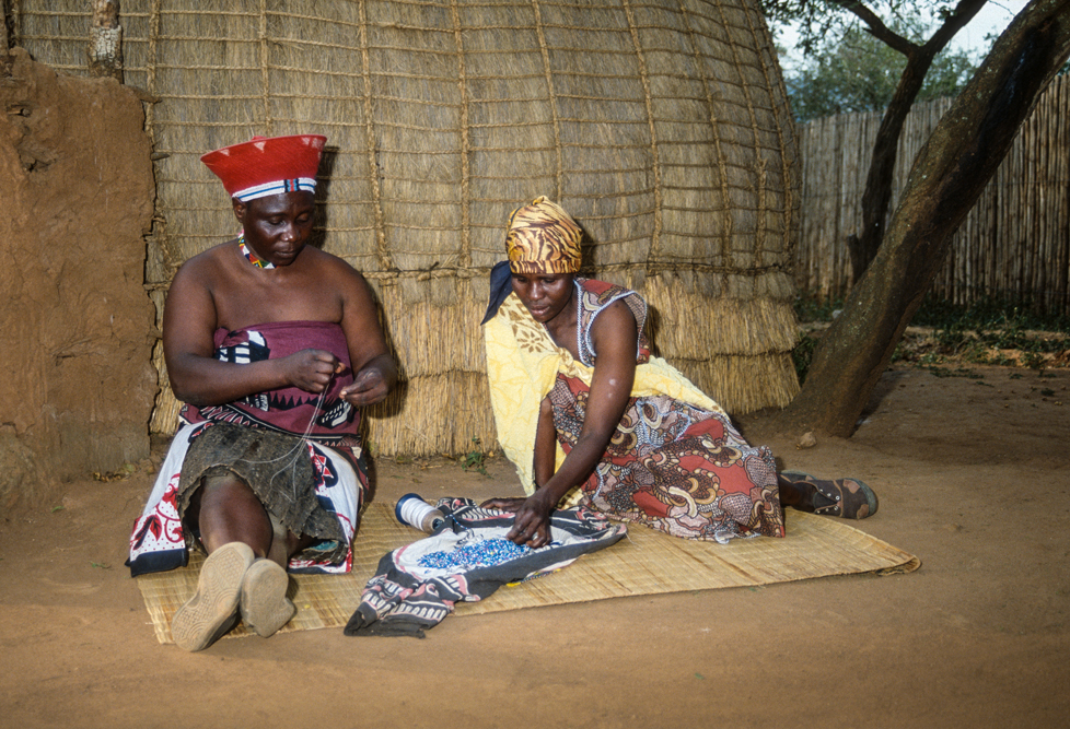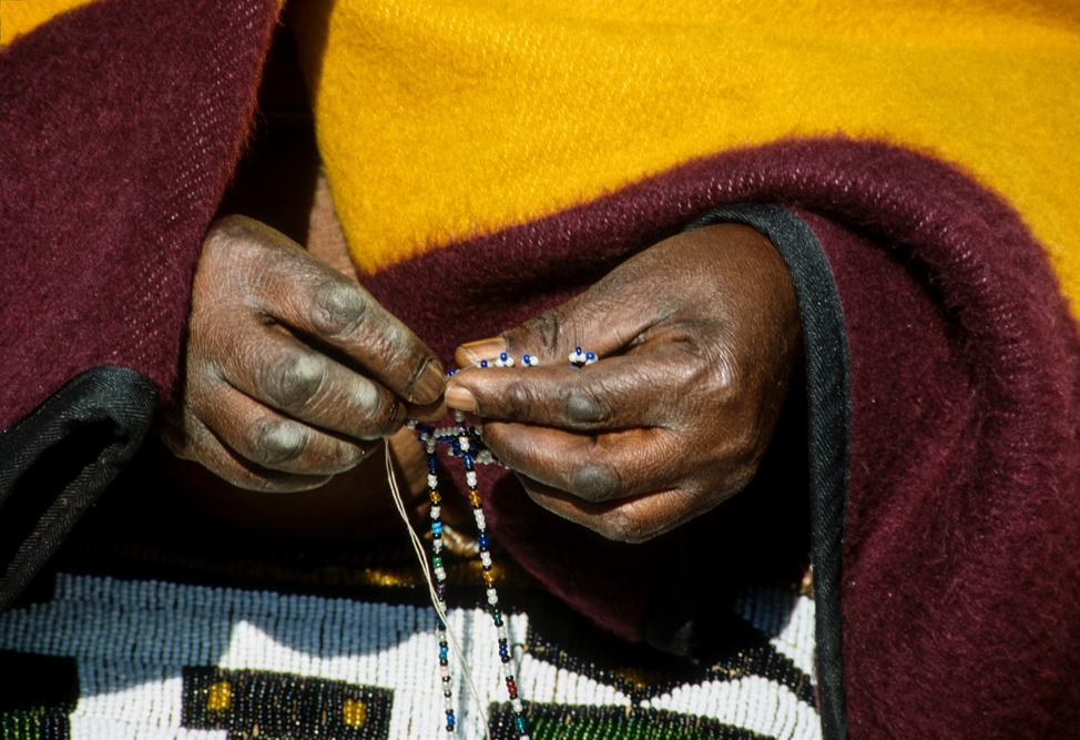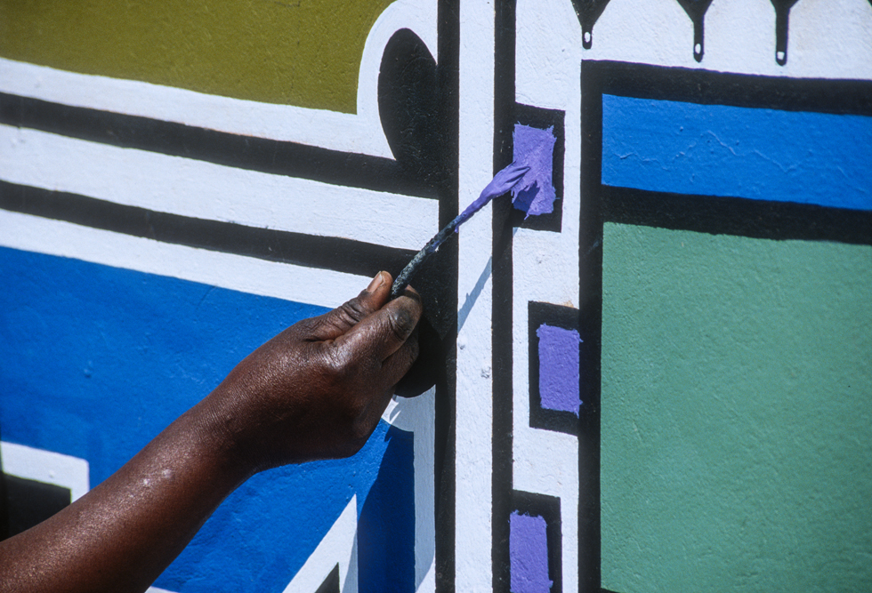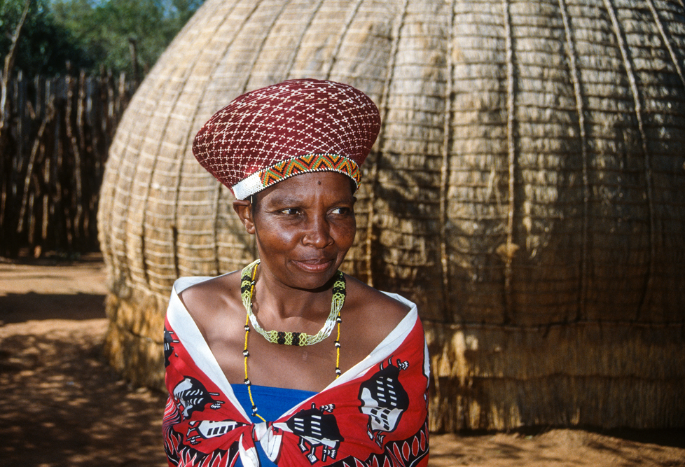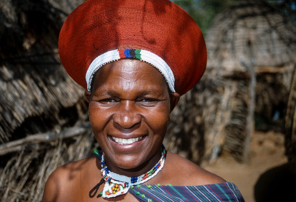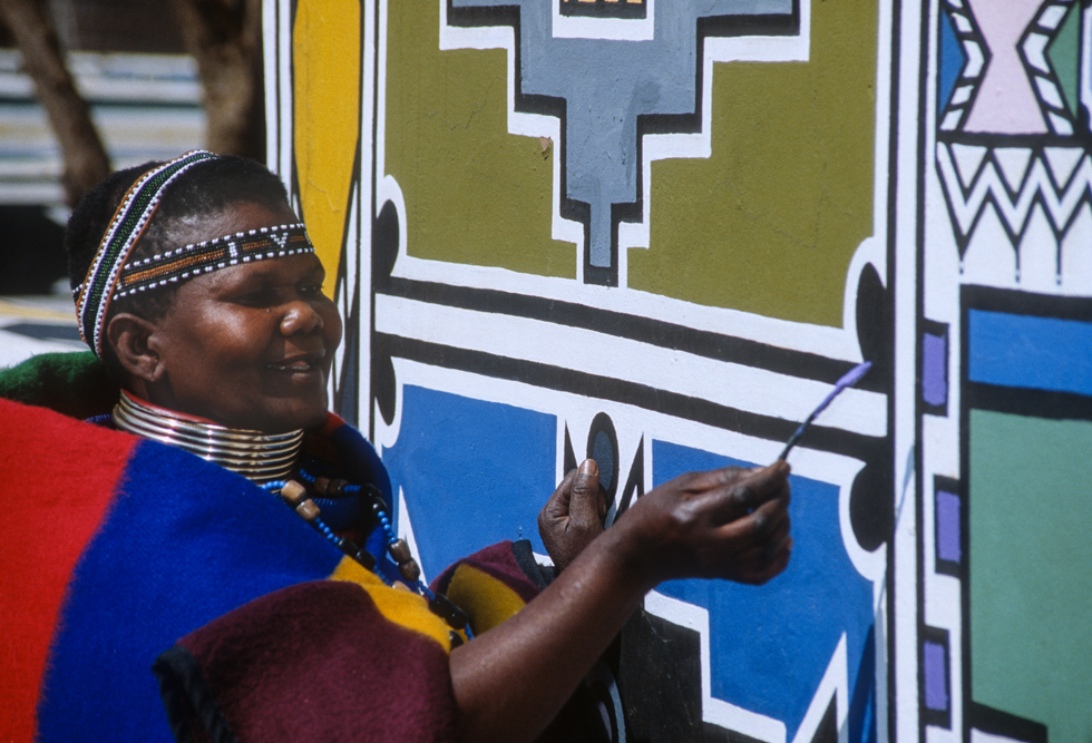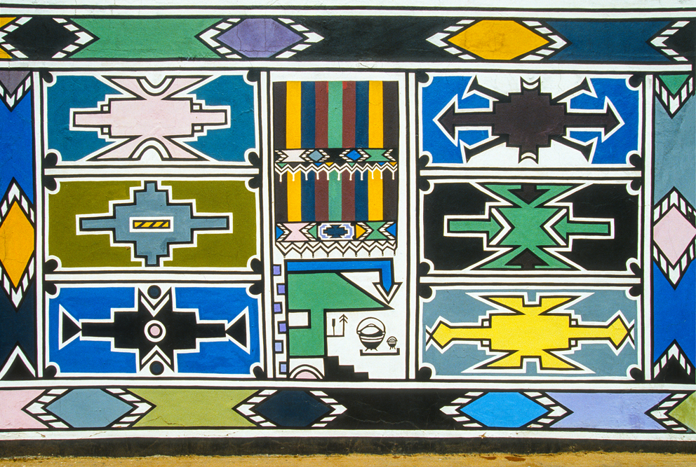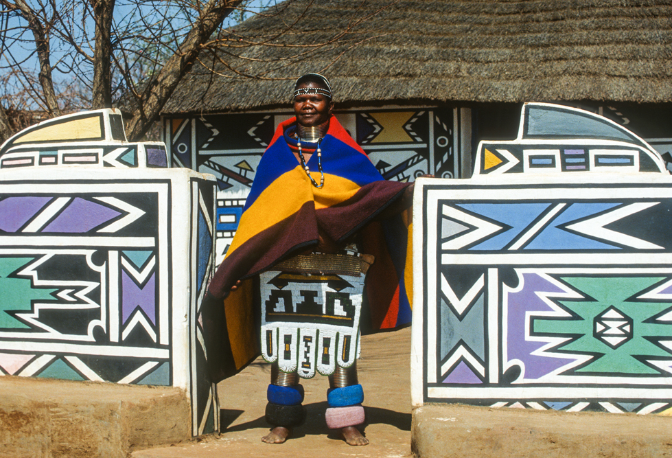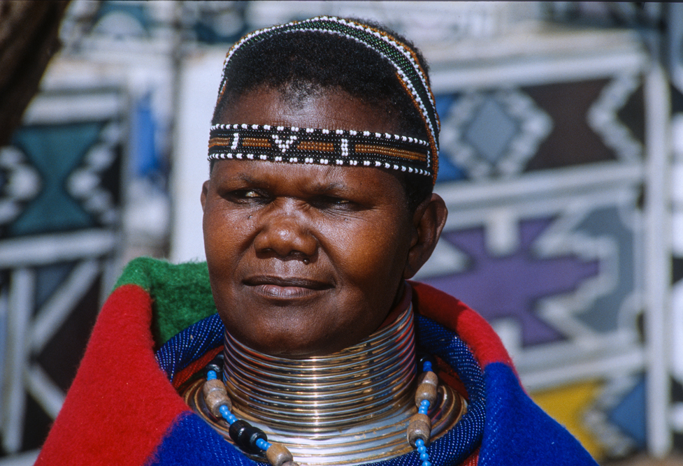 Ich bin froh als es weiter geht, denn nun kommt etwas, auf das ich mich schon lange gefreut hatte. In Deutschland hatte ich eine Ausstellung der Fotografin Margret Courtney-Clarke mit Ihren Bildern der Ndebele-Frauen gesehen. Und hier, unweit von Fort Merensky, gibt es die Botshabelo Mission, wo Leute vom Ndebele-Stamm sich noch die traditionelle Lebensweise bewahrt haben. Traumhaft bunt ist das Leben hier. Die Frauen tragen die vielfarbigen Decken, feingearbeiteten Perlenstickereien und schwere Messingringe um Hals und Fußgelenke. Ich sehe zu, wie eine Frau mit einem Pinsel aus Vogelfedern die geometrischen Muster auf die Hauswände malt; andere Frauen sitzen im Schatten und ziehen Perlen auf Schnüre oder mahlen Getreide nach alter Art und Weise auf den Reibestein. Männer sieht man nicht.