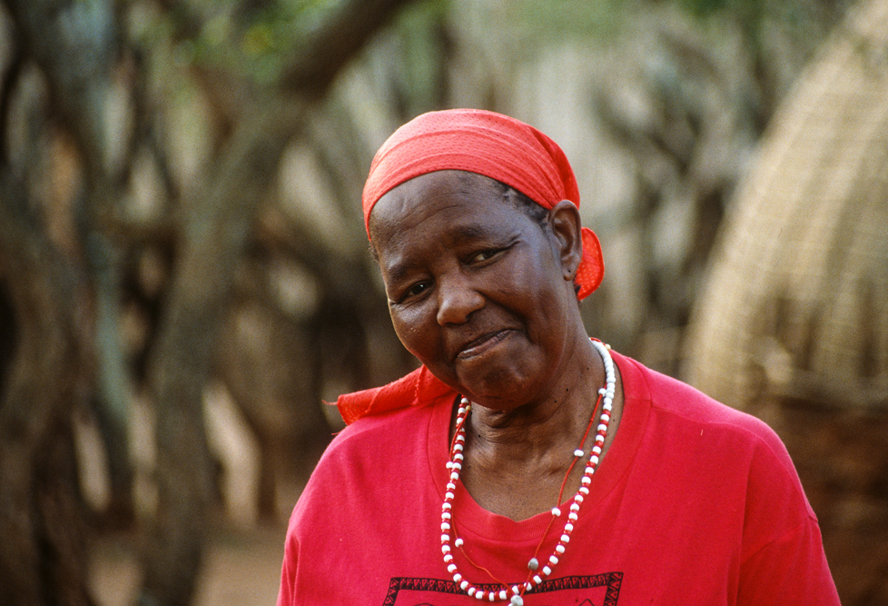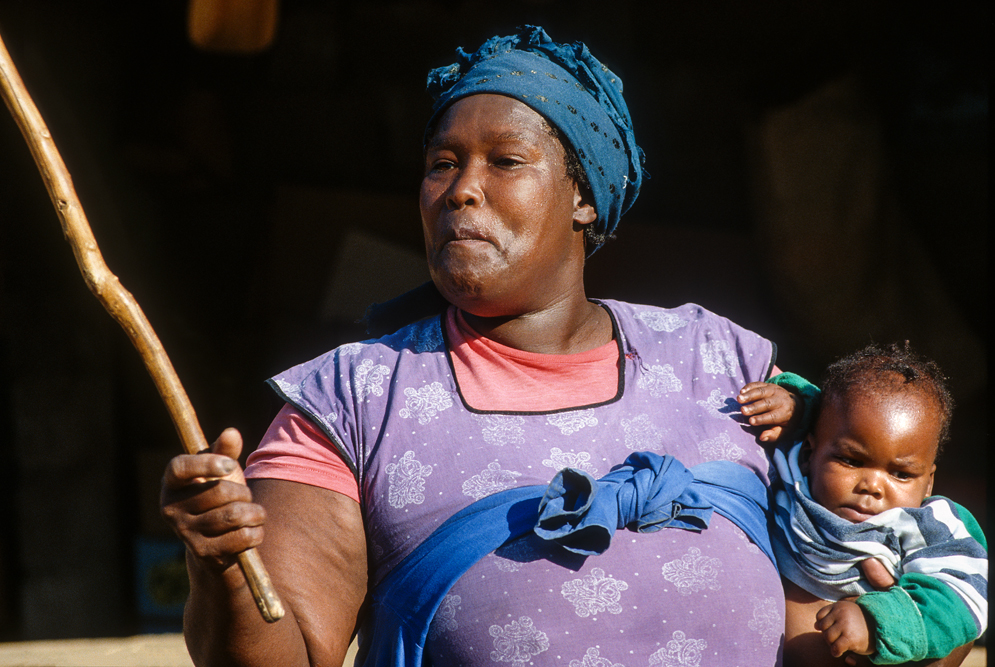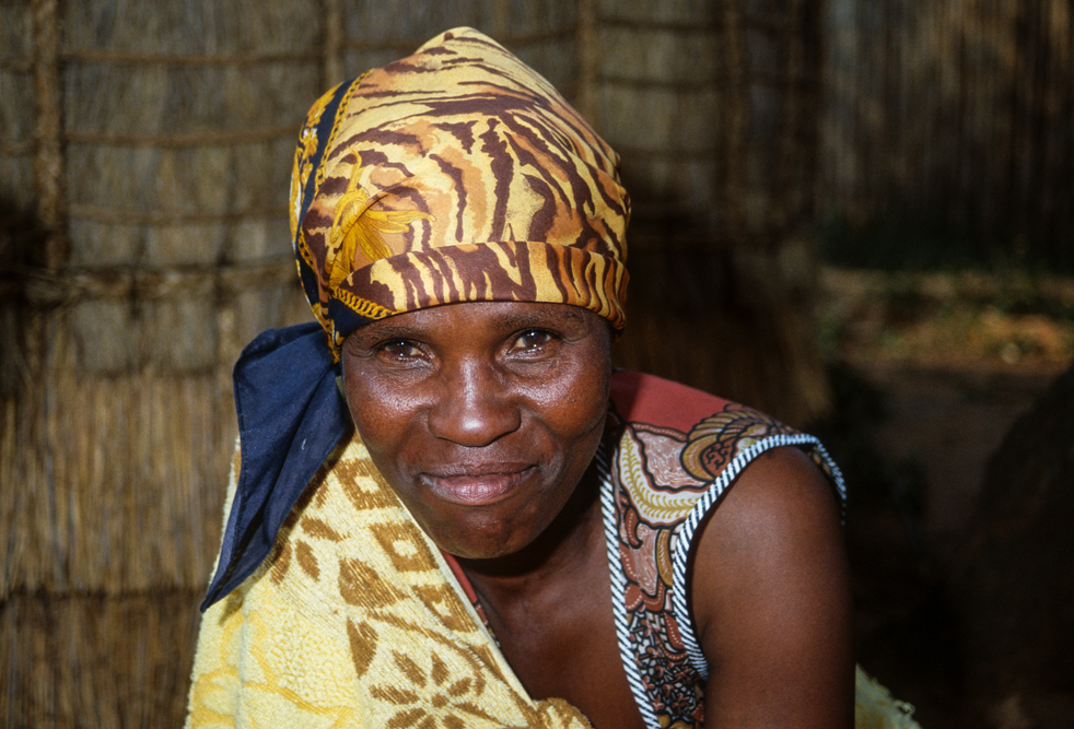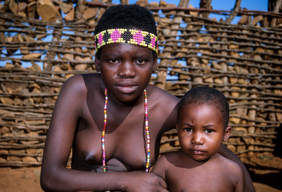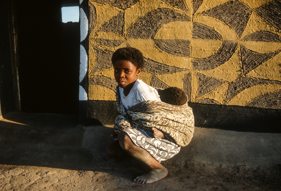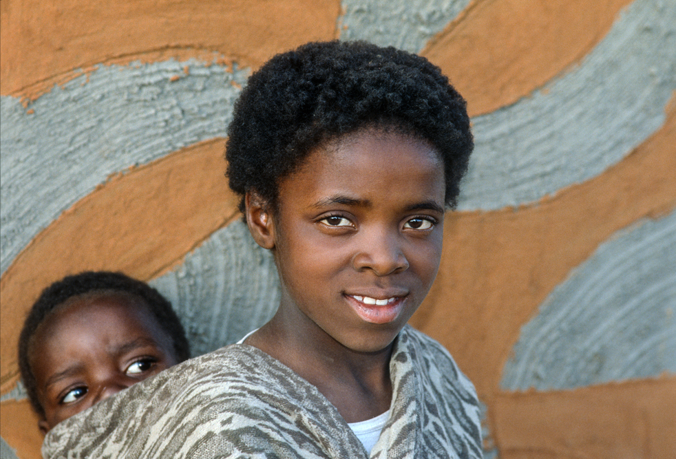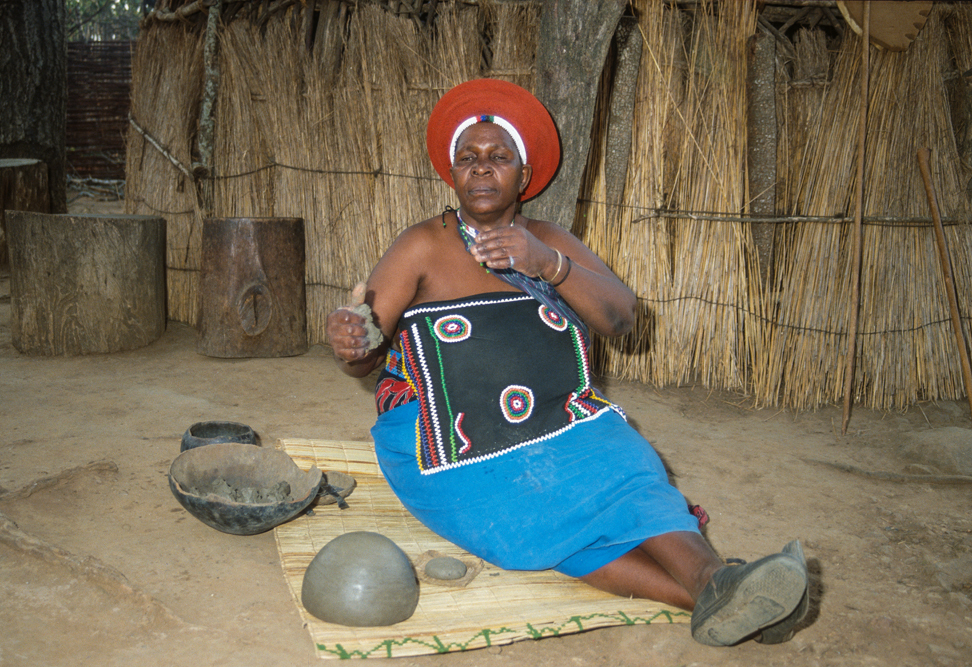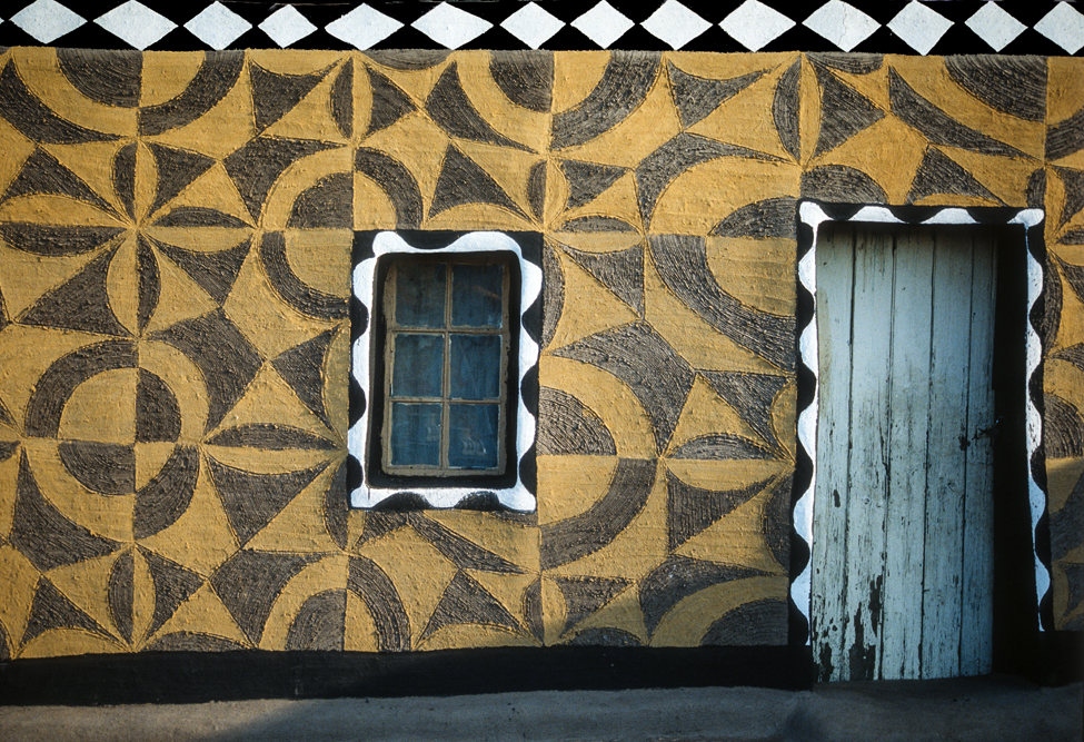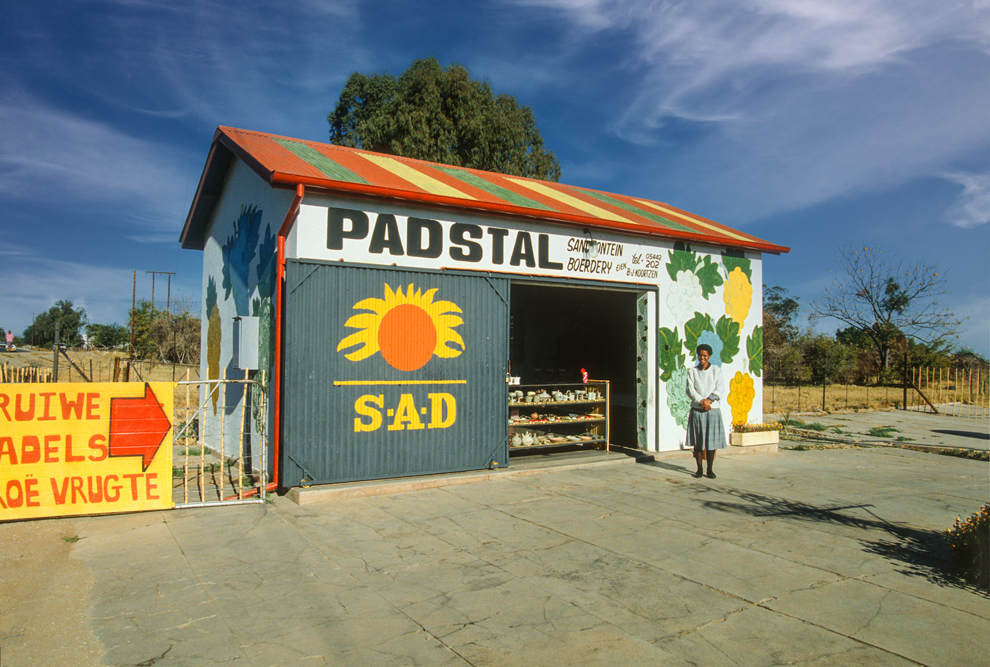 Ich bin froh als es weiter geht, denn nun kommt etwas, auf das ich mich schon lange gefreut hatte. In Deutschland hatte ich eine Ausstellung der Fotografin Margret Courtney-Clarke mit Ihren Bildern der Ndebele-Frauen gesehen. Und hier, unweit von Fort Merensky, gibt es die Botshabelo Mission, wo Leute vom Ndebele-Stamm sich noch die traditionelle Lebensweise bewahrt haben. Traumhaft bunt ist das Leben hier. Die Frauen tragen die vielfarbigen Decken, feingearbeiteten Perlenstickereien und schwere Messingringe um Hals und Fußgelenke. Ich sehe zu, wie eine Frau mit einem Pinsel aus Vogelfedern die geometrischen Muster auf die Hauswände malt; andere Frauen sitzen im Schatten und ziehen Perlen auf Schnüre oder mahlen Getreide nach alter Art und Weise auf den Reibestein. Männer sieht man nicht.