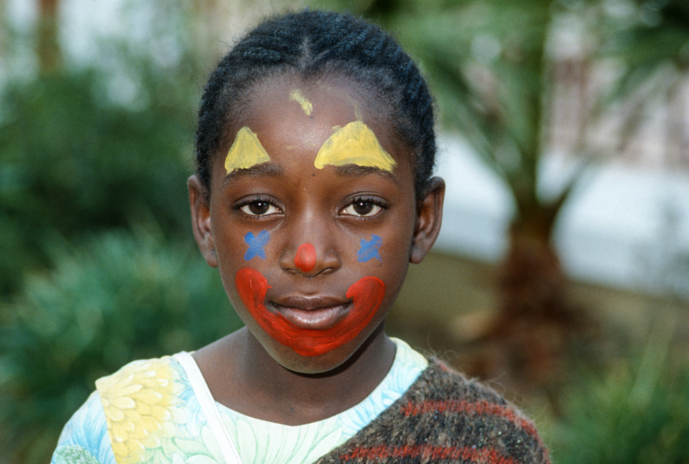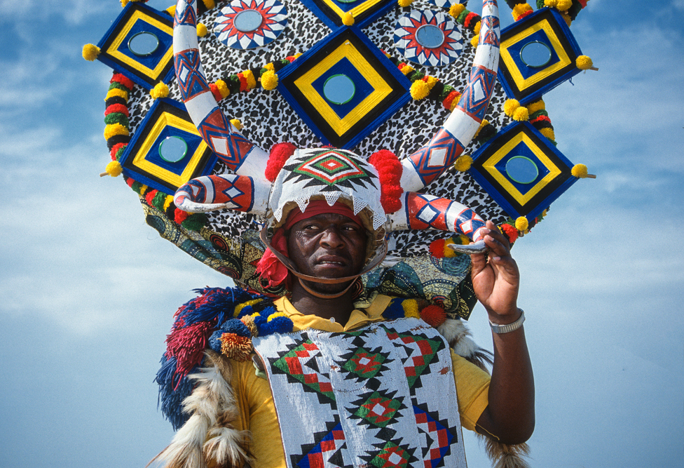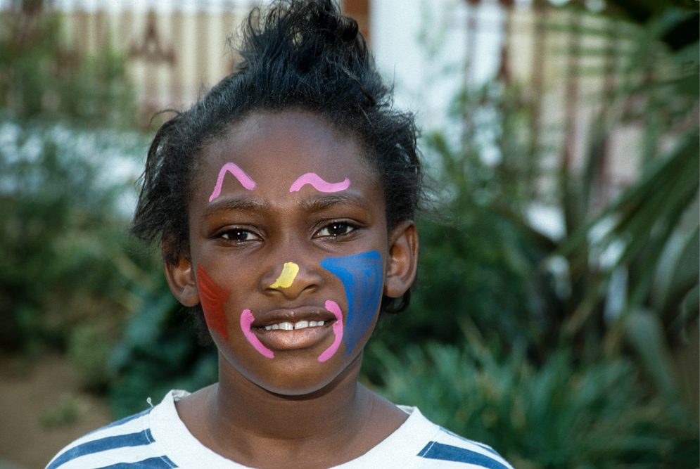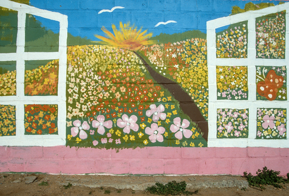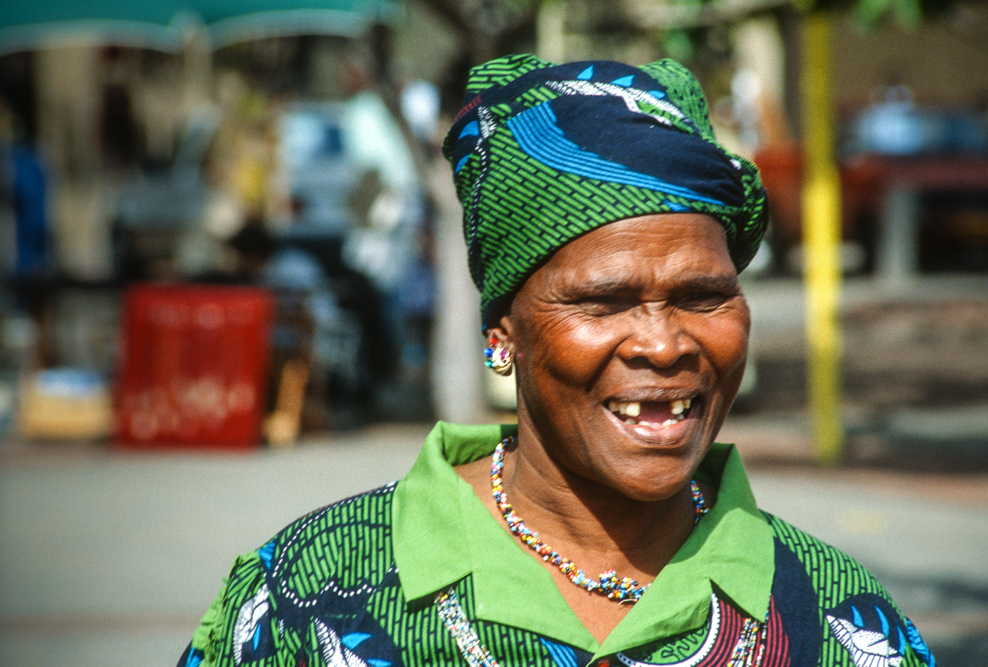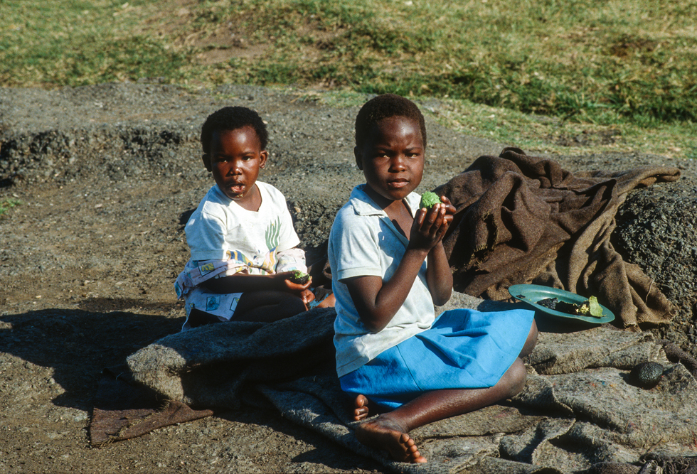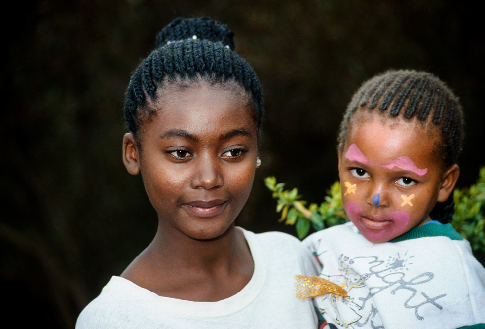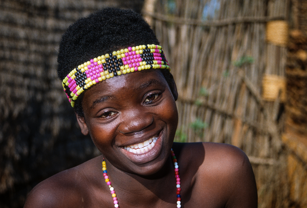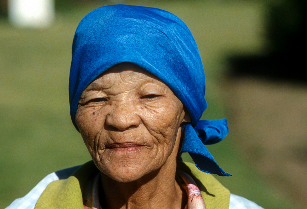 Ich bin froh als es weiter geht, denn nun kommt etwas, auf das ich mich schon lange gefreut hatte. In Deutschland hatte ich eine Ausstellung der Fotografin Margret Courtney-Clarke mit Ihren Bildern der Ndebele-Frauen gesehen. Und hier, unweit von Fort Merensky, gibt es die Botshabelo Mission, wo Leute vom Ndebele-Stamm sich noch die traditionelle Lebensweise bewahrt haben. Traumhaft bunt ist das Leben hier. Die Frauen tragen die vielfarbigen Decken, feingearbeiteten Perlenstickereien und schwere Messingringe um Hals und Fußgelenke. Ich sehe zu, wie eine Frau mit einem Pinsel aus Vogelfedern die geometrischen Muster auf die Hauswände malt; andere Frauen sitzen im Schatten und ziehen Perlen auf Schnüre oder mahlen Getreide nach alter Art und Weise auf den Reibestein. Männer sieht man nicht.