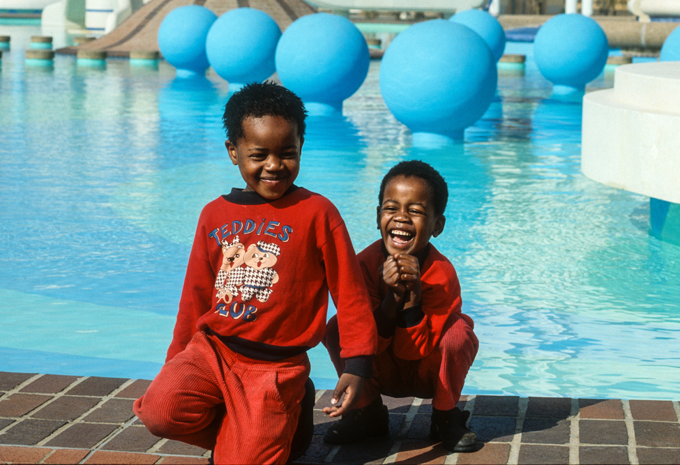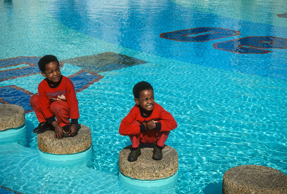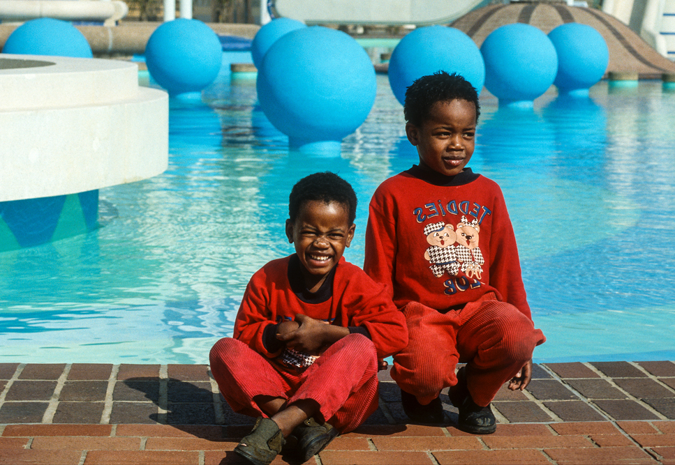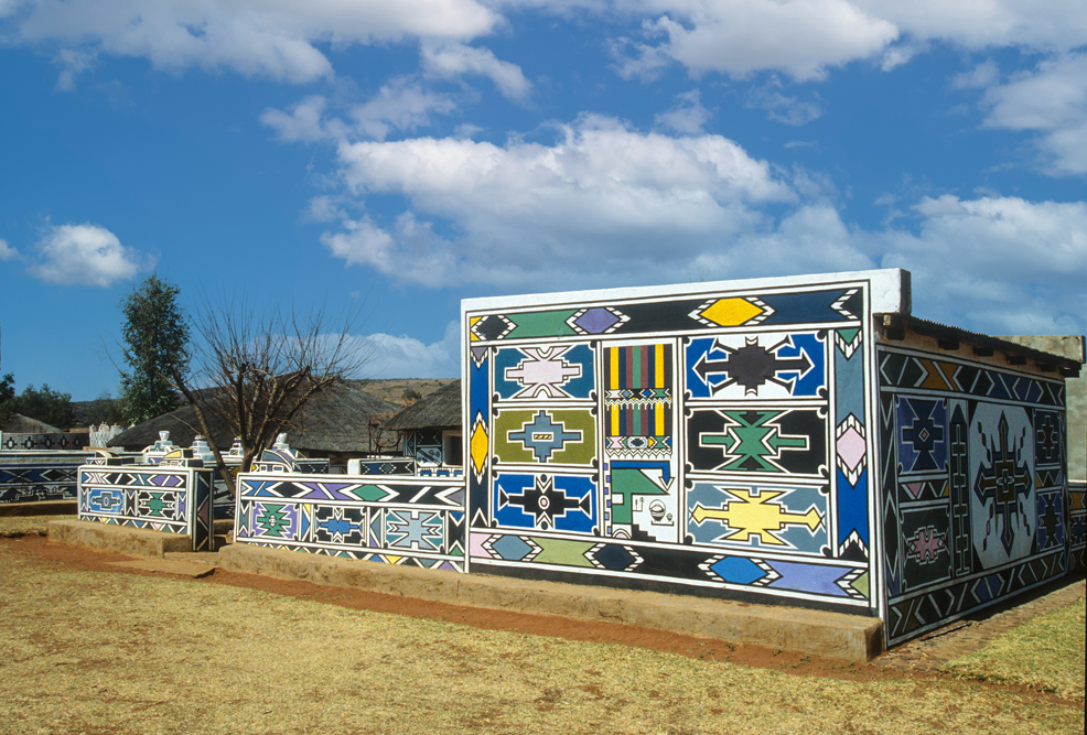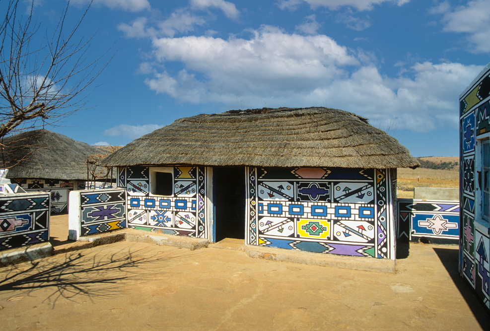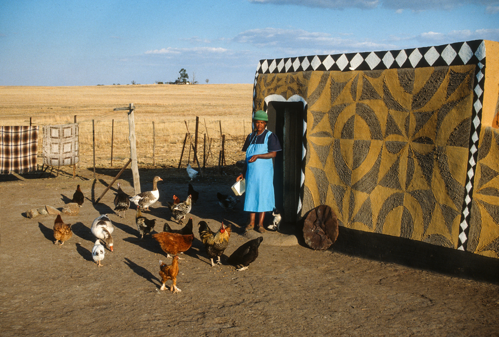 Am kommenden Tag, starte ich zu einer langen Fahrt von Durban nach Johannesburg. Rechts und links der Straße, leicht welliges Farmland, soweit das Auge reicht. Etwa nach der Hälfte der Strecke, erregt ein Gebäude auf einer Anhöhe unsere Aufmerksamkeit. Eine Kleinbauernfamilie vom Stamm der Sotho hat hier ihr Gehöft errichtet und die Außenmauern mit gleichmäßigen geometrischen Mustern in erdigen Farbtönen verziert. Der Weg nach Jo’burg ist noch weit, und meine südafrikanischen Begleiter drängen zum Aufbruch, – sie können nicht verstehen, was mich so begeistert und warum es nicht weitergeht. Eine einzelne Wolke, zieht vor der Sonne hin und her, so dass das Motiv erst nach gut einer Stunde im rechten Licht liegt. So kommen wir erst nach Einbruch der Dunkelheit auf der Heia Safari Ranch an. Hier in Honeydew, vor den Toren von Johannesburg, hat der deutsche Auswanderer Franz Richter, ein kleines Paradies geschaffen. Auf dem Ranchgelände hat er 16 komfortable Rondavels errichtet, in denen sich gut leben lässt. Die Ranch wird von Zulus bewirtschaftet und auf dem riesigen Farmgelände hat man Tiere ausgewildert, die dem Besucher das Flair von „Out of Africa“ vermitteln. So kann es gut sein, dass man vom Mittagsschlaf erwacht; sich die Augen reibt, weil Giraffen auf der Veranda stehen oder ein Zebra, das den Pool als Tränke nutzt, in selbigen hineinfällt.
