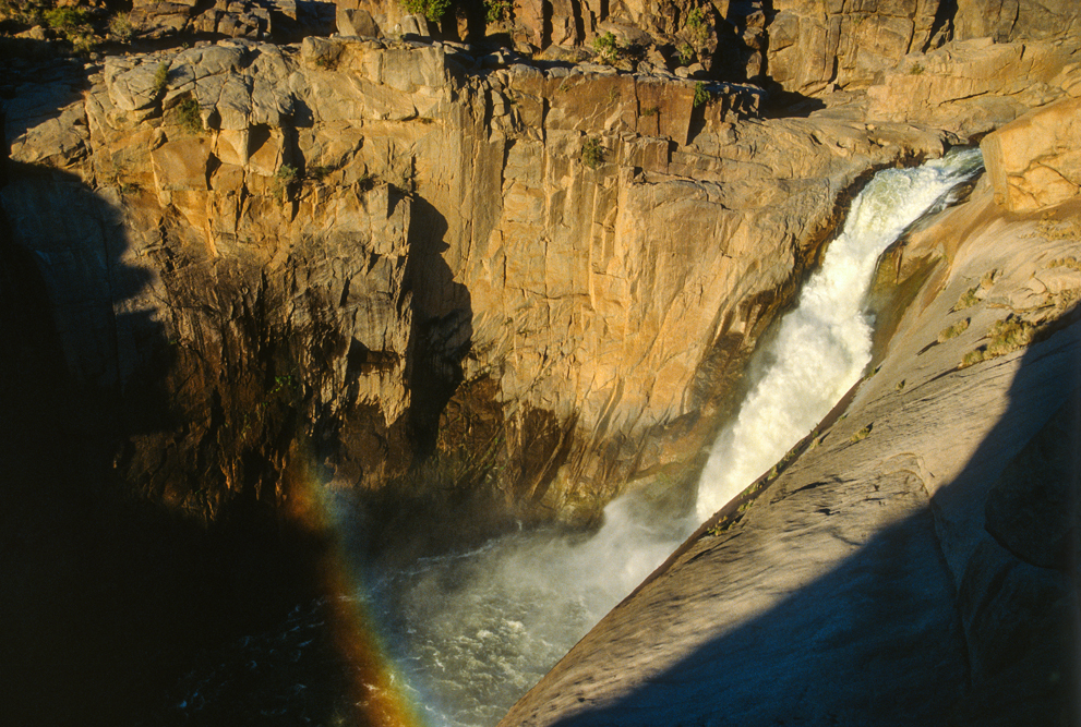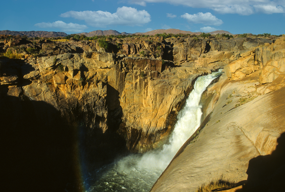 Der Westen Südafrikas bietet viel. Augrabies Falls zum Beispiel; hier hat sich der Oranje River sein Bett in den harten Granit gegraben. Wir sind zwar im Südwinter hier, aber man kann sich gut vorstellen, wie nach der Regenzeit bis zu 400 Millionen Liter Wasser pro Stunde über die 56 m hohe Abbruchkante donnern und sich in vielen kleineren Kaskaden ins Tal ergießen.