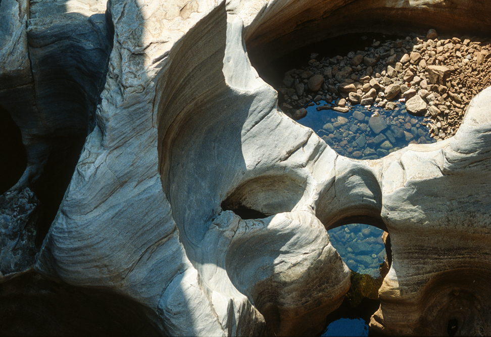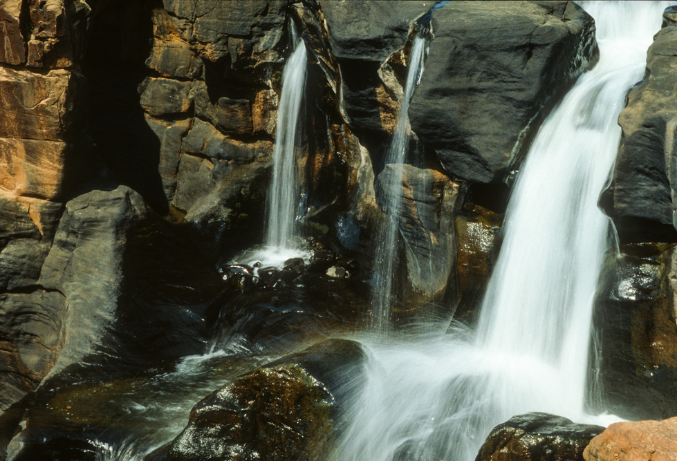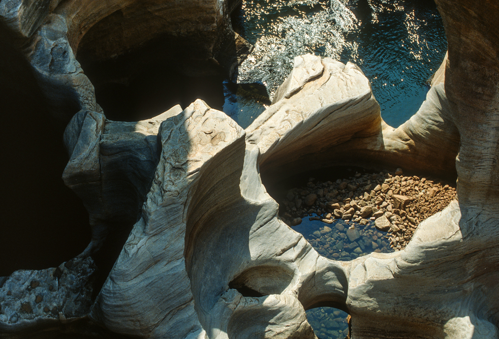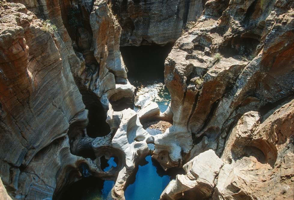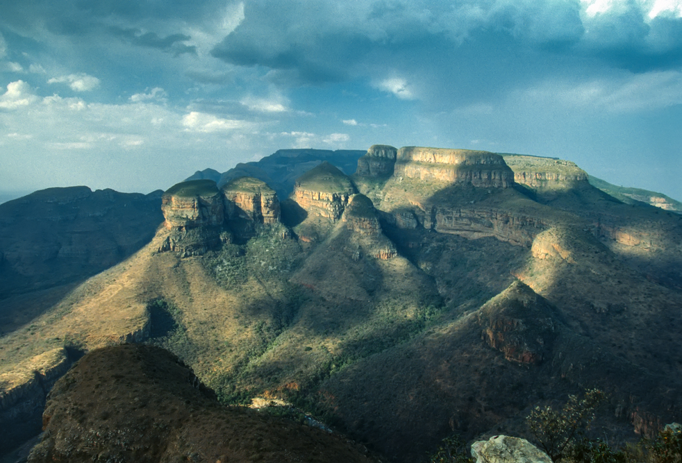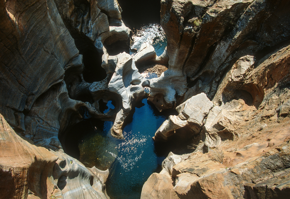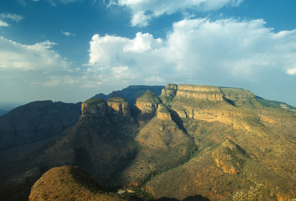 Als ich aufbreche, ist es bereits später Nachmittag, in der Zeit habe ich mich sehr verschätzt, denn wir wollen noch bis nach Hazyview, am Rande der Transvaaler Drakensberge. Ich bin dankbar, dass ich auf der gut ausgebauten Straße zügig vorankomme. Ein Freund hat mir das Casa do Sol empfohlen, doch in der Dunkelheit irre ich eine gute Stunde herum, bis ich die Zufahrt finde. An der Bar bin ich der einzige Gast, – doch ein Absacker muss noch sein. Der Barmann schaut mich aus trüben Augen an, zuckt mit den Schultern und gießt mir noch einen Single Malt ein. Todmüde falle ich ins Bett und genieße am folgenden Tag den Luxus dieser außergewöhnlichen Hotelanlage. Nach diesen Ferien vom Urlaub, fahre ich am nächsten Tag zum Blyde River Canyon, lasse den Wagen an der Rangerstation stehen und wandere durch die wildromantische Gebirgslandschaft. Am Aussichtspunkt God’s Window packe ich den Lunch aus, den man mir im Hotel eingepackt hat, kalter Hummer, leckeres, geräuchertes Wildfleisch und kühler Chardonnay. So gestärkt, brechen ich auf zu den Wasserfällen rund um Bourkes Luck Potholes, wo das Wasser sich gurgelnd in eine Schlucht ergießt und über immer wieder neue Kaskaden zu Tal stürzt. Nördlich von Pilgrim’ s Rest, hat der Blyde River eine spektakuläre Schlucht in den Fels gegraben. Das Flussbett, liegt fast 800 m tiefer, als die umliegenden Berggipfel. Gekrönt wird die Szenerie von den drei Rondavels, drei abgeschliffenen Bergkegeln, die wie die Rundhütten der Zulus aussehen.
