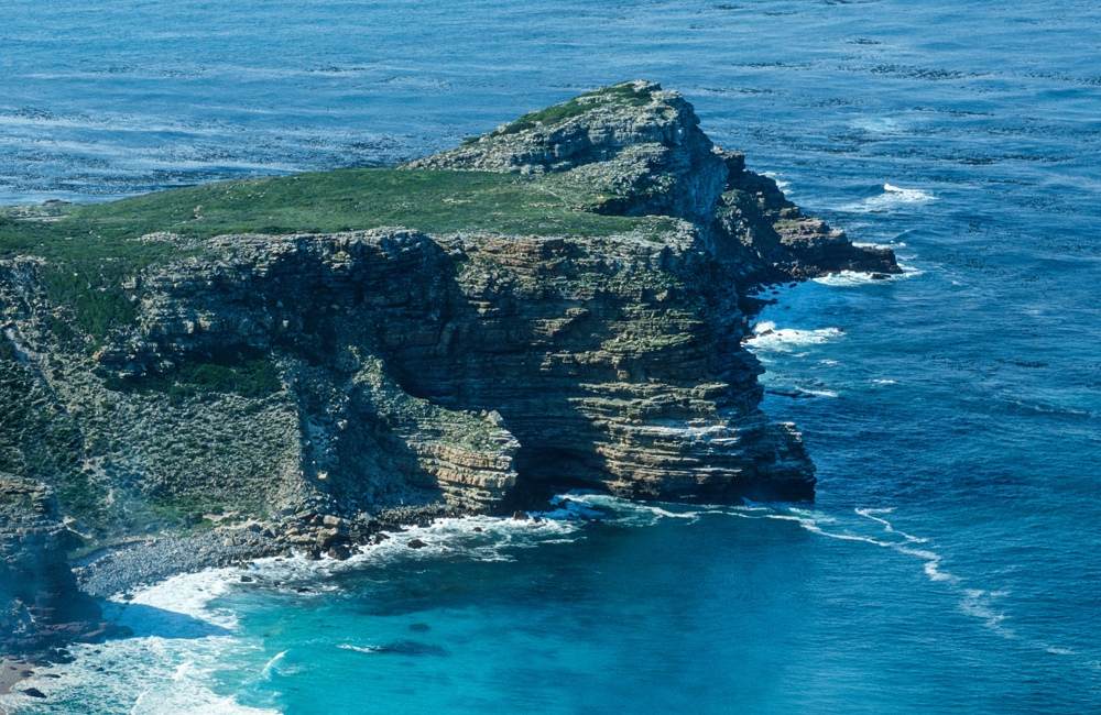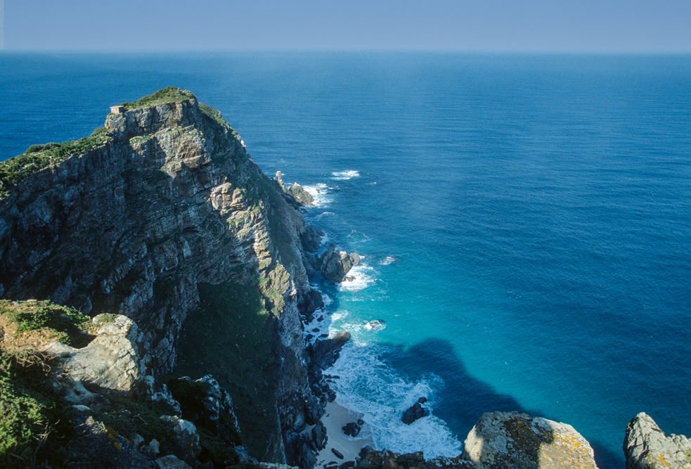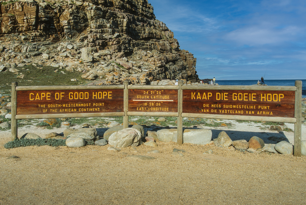 Am Nachmittag betrete ich historischen Boden. Wer kennt den Namen nicht ? „Kap der guten Hoffnung“ ! Das Kap ist heute Touristenmagnet und Naturreservat, jeder will hier gewesen sein, am südlichsten Punkt Afrikas – doch halt, das stimmt nicht ! Dies ist ein Irrtum, denn der südlichste Punkt des afrikanischen Festlandes ist Cap Agulhas das Nadelkap, – weil hier die Kompassnadel genau nach Norden zeigt -, hier treffen Atlantik und Indischer Ozean aufeinander, gut 100 km von Kapstadt entfernt.