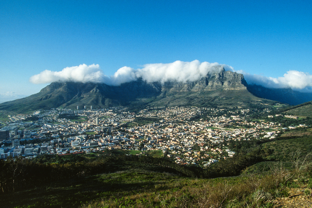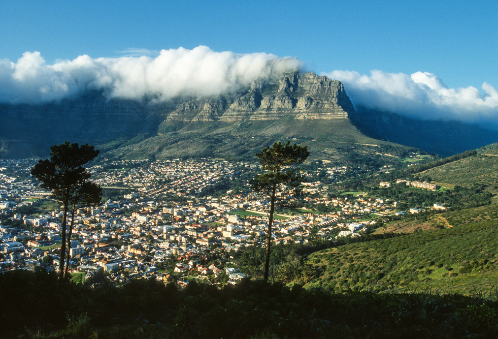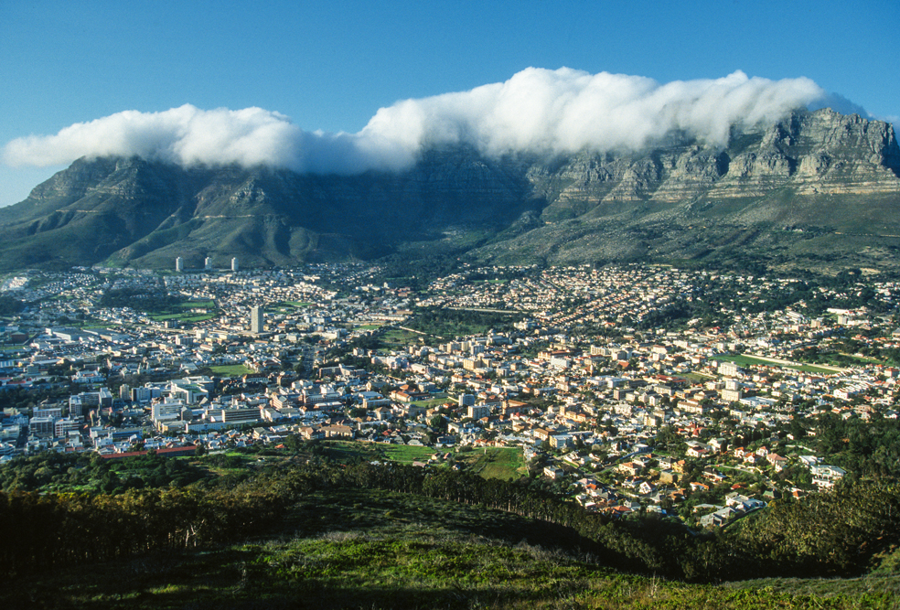 Während das Kap der guten Hoffnung das Wahrzeichen Kapstadt von der Meerseite gesehen ist, ist die Landseite nicht weniger spektakulär, der Tafelberg ein 1000 m hoher, massiver Block aus Sandstein, überragt die Stadt. Man kann die Seilbahn benutzen um auf den Gipfel zu gelangen, man kann sich die Gegend jedoch auch erwandern. An den östlichen Hängen des Tafelbergs erstreckt sich der über 500 ha. große Botanische Garten, und am Devils Peak liegt das Groote Schuur Estate. Hier befindet sich die ehemalige Residenz des Magnaten Cecil Rhodes, nach dessen Tod im Jahre 1902, entstand hier die Kapstädter Universität. Uns ist Groote Schuur durch sein Hospital bekannt, an dem Professor Christiaan Barnard 1968 die erste Herzverpflanzung vornahm.