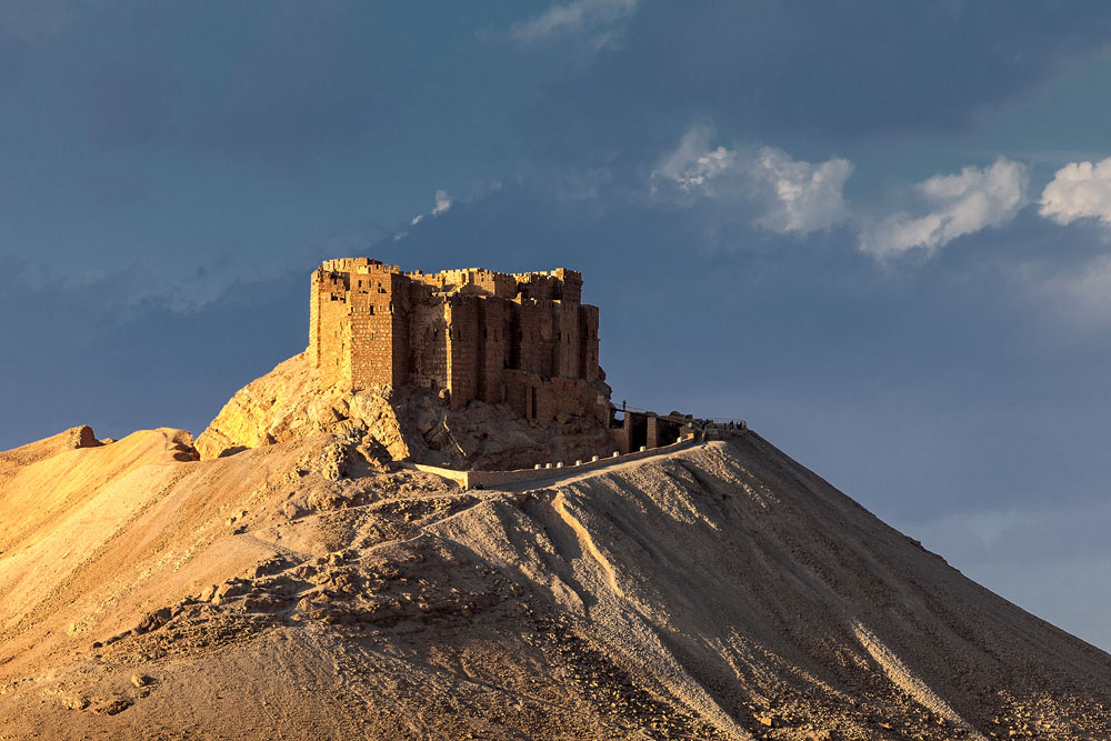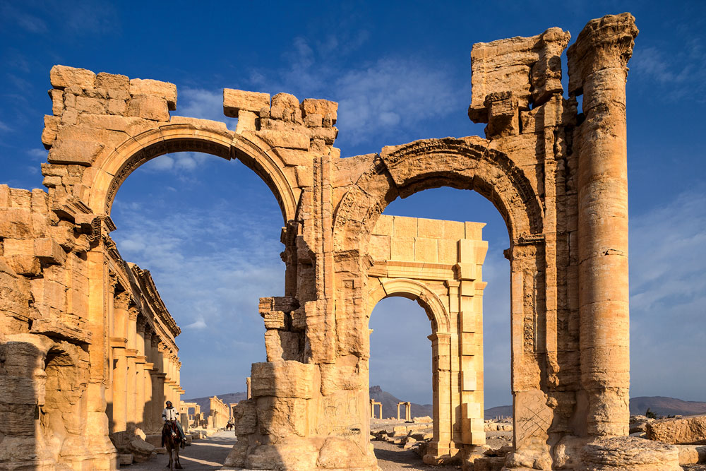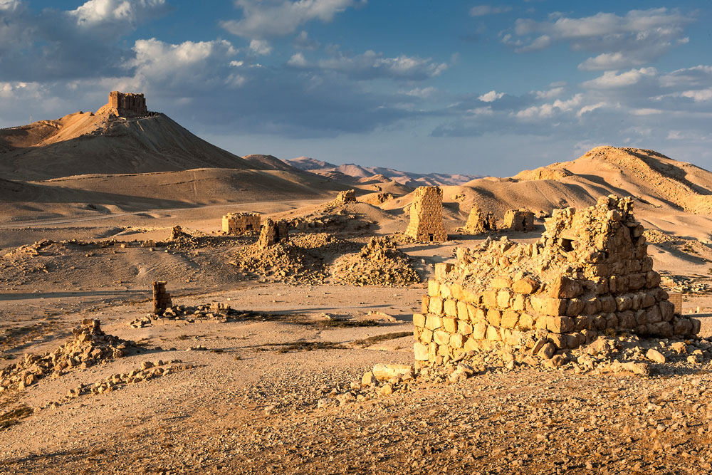 Spät Nachmittags stehen wir auf einer Felskante und genießen den Blick auf Grabtürme und Römerstadt die die sinkende Sonne in pures Gold zu tauchen scheint. Palmyra die Palmenreiche, große Oase in der syrischen Wüste: die Erinnerung an die goldene Zeit ist verblasst, die Zeugnisse von Macht und Ruhm hat der Wüstensand zugeweht. Wird sie je auferstehen?