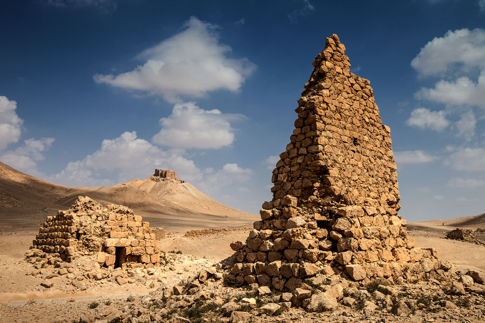 Am oberen Ende der Ruinenstadt erheben sich seltsame Türme. Die nobelsten Familien Palmyras erbauten diese, als Grabstätten für ihre Verblichenen mit Grabfächern auf mehreren Etagen, wundervoll verzierten Sakophargen, und das Ganze gleich auf Vorrat für mehrere Generationen.