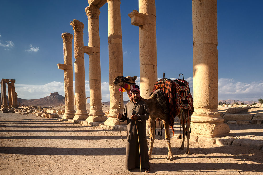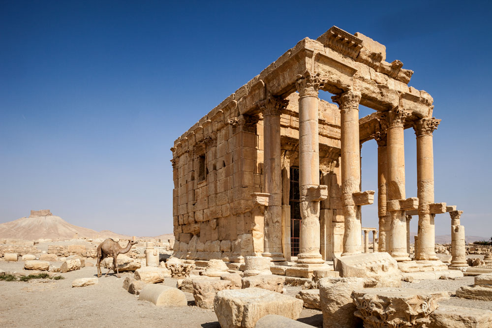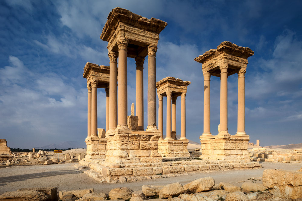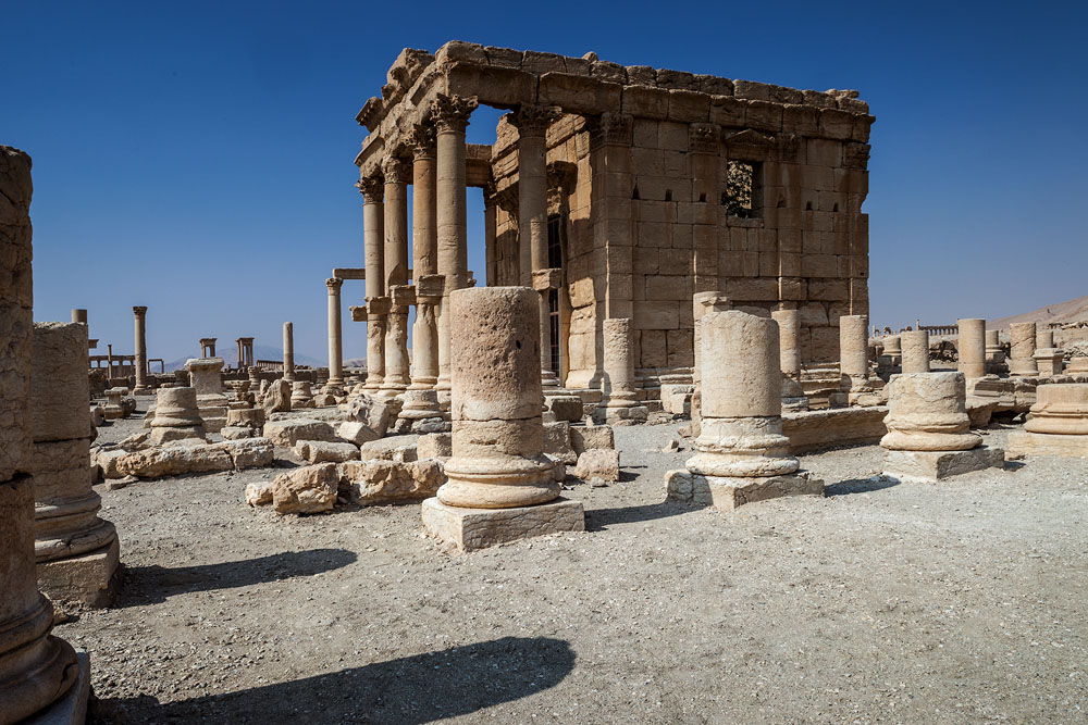 Gleich am Ortsrand erhebt sich der große Baal Tempel. Im ersten Jahrhundert nach Christus wurde dieser zu Ehren der höchsten mesopotamischen Gottheit errichtet. Rom soll den Bau bezahlt haben, um Palmyra für den Beitritt zum Römischen Reich zu belohnen. Beim Stichwort bezahlen; – der Eintritt für Syrer beträgt 15 Piaster und für Ausländer 150 Piaster. Weil man aber nur Eintrittskarten zu 15 Piaster gedruckt hat, bekommt der fremde Besucher gleich 10 Stück. Für den überwältigenden Eindruck der sich dem Besucher beim Eintritt bietet ist das ein günstiges Vergnügen. Als Fotograf kann ich mich hier gar nicht satt sehen und komme während der Tage in Palmyra gleich mehrfach zu verschiedenen Tageszeiten hierher.