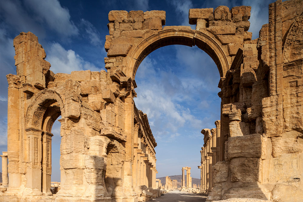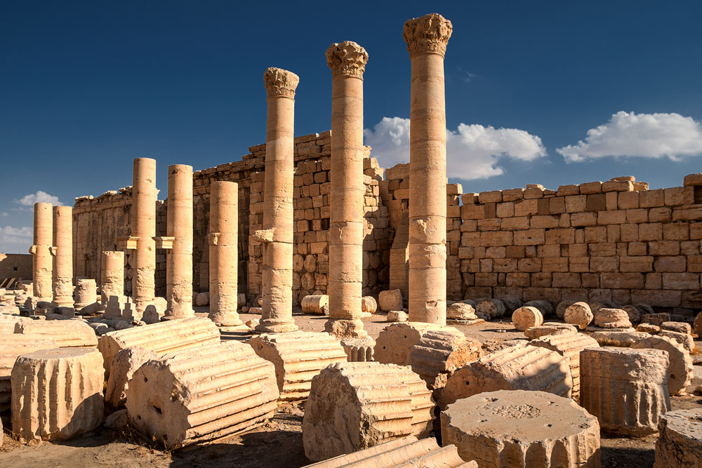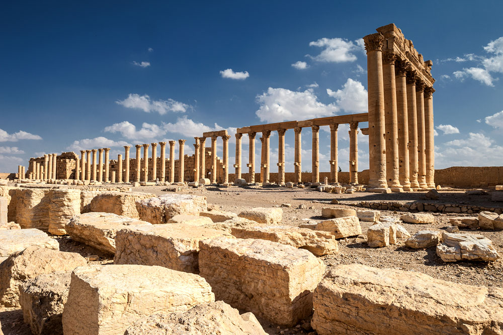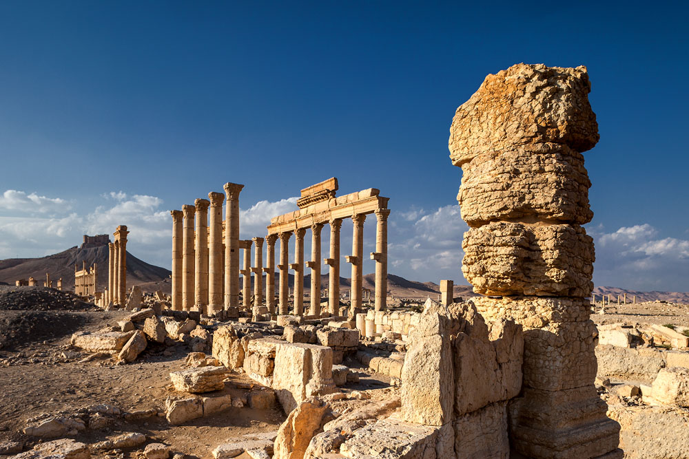 Gegen Mittag zeigt das Thermometer über 35° im Schatten als vor uns schemenhaft in der vor Hitze flirrenden Luft die ersten Säulen auftauchen. Palmyra die „Palmenreiche“, große Oase in der syrischen Wüste. Auf halbem Weg zwischen Euphrat und Mittelmeer. Wir sind in der römischen Welt angekommen.