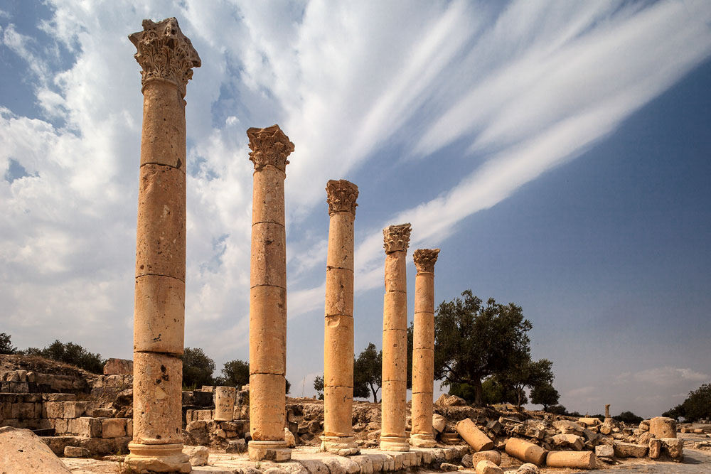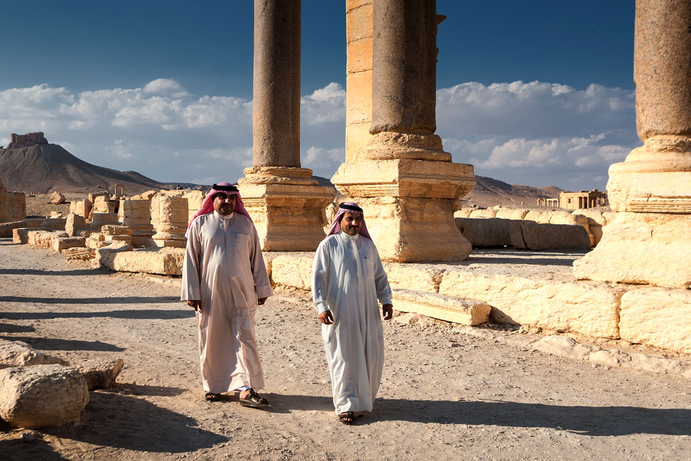 Beim Verlassen des Tempels erblickt man auf der anderen Straßenseite ein riesiges Ruinenfeld einer antiken Stadt. Hier gab es alles was das Herz eines „civis Romanum“ erfreute, Kolonnaden, Thermen, Tempel, ein Amphitheater und in der Säulenhalle der Agora sollen einmal mehr als 200 Statuen gestanden haben. Wir betreten die Stadt wie einstmals die römischen Kaiser durch das Hadrians-Tor und laufen in Richtung des Tetrapylon der die Kulisse beherrscht, als uns drei würdige Herren in der traditionellen Tracht der Araber, – weiße Galabija, rot-weiß gemusterte Hatteh gehalten vom Iqal dem schwarzen doppelten Kordelring, – entgegenkommen. Ein einmaliges Bild das ich unbedingt fotografieren muss. Nachdem ich die Herren ungeniert angesprochen habe – frei nach Tucholsky „Als deutscher Tourist im Ausland muss man sich fragen, ob man sich anständig benehmen muss, oder ob schon andere deutsche Touristen dagewesen sind – entspinnt sich ein nettes Gespräch.