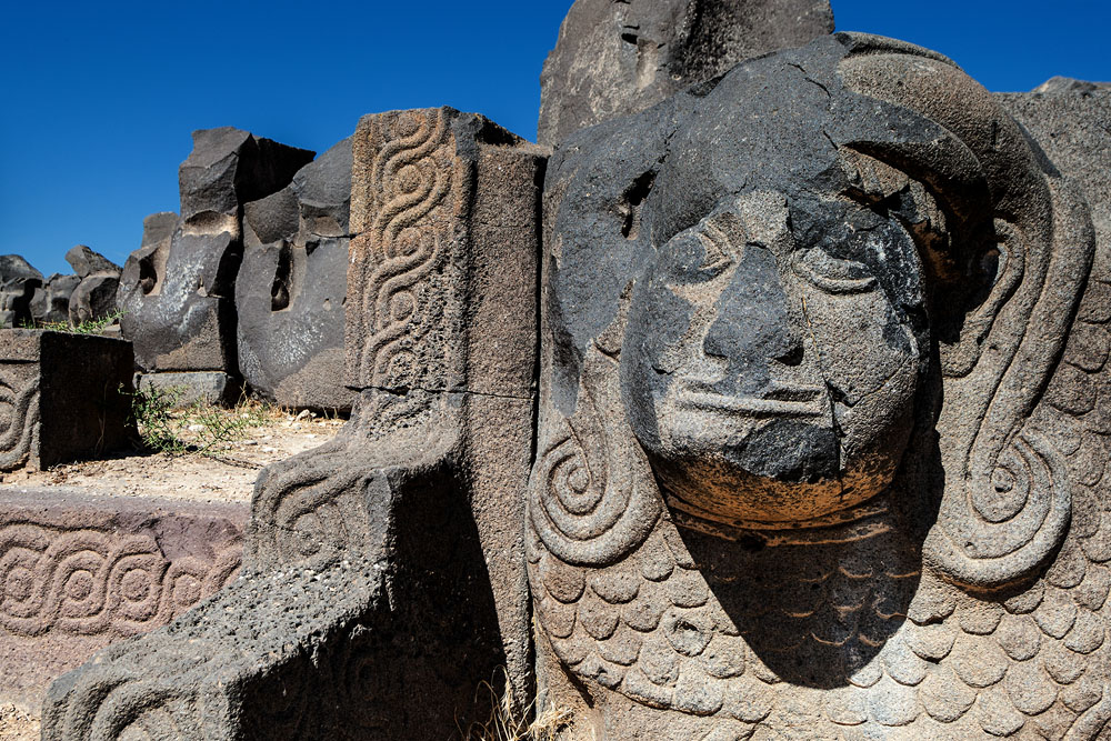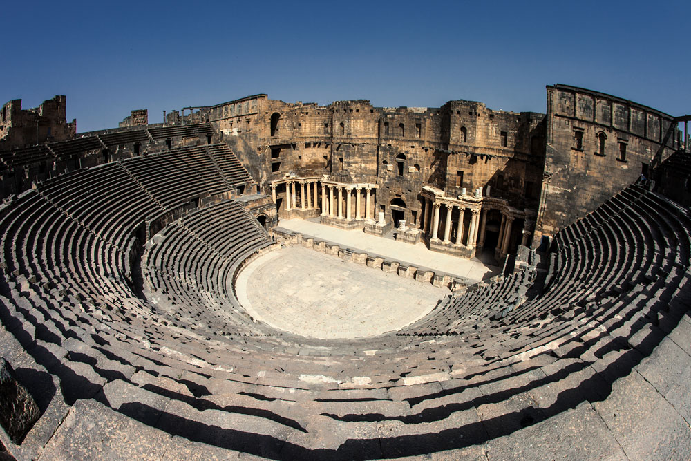 Bosra liegt im Süden Syriens auf der kargen Ebene des Hauran, fast an der jordanischen Grenze. Im Gegensatz zu der leichten Architektur Palmyras wirkt Bosra, durch den schwarzen Basalt der zum Bau verwendet wurde, düster und bedrohlich. In unseren Tagen hat das moderne Bosra die alte römische Stadt längst umschlungen. Die römischen Ruinen haben als Steinbruch gedient und trotz alledem erkennt man die Einzigartigkeit der Anlage. Fast 80.000 Menschen hat Bosra in seiner Blütezeit beherbergt, davon alleine 25.000 Legionäre, die die Grenzen der römischen Provinz Arabia sicherten, deren Hauptstadt Bosra 106 n. Chr. wurde. Das Theater das von außen trutzig wie eine Festung wirkt und sicher zu allen Zeiten auch als solche gedient hat, bietet mehr als 15.000 Menschen Platz. Gerühmt wird die unvergleichliche Akustik, die bis heute für Konzerte genutzt wird. Auch auf der obersten Galerie der 37 Sitzreihen hört man aus dem 100 m messenden Rund noch die Dialoge auf der Bühne, die Hunderten von Akteuren Platz bietet. Der Bühnenvorraum konnte in einen See verwandelt werden. Man kann sich gut vorstellen, wie die johlenden Massen bei „Brot und Spielen“ jubelten.