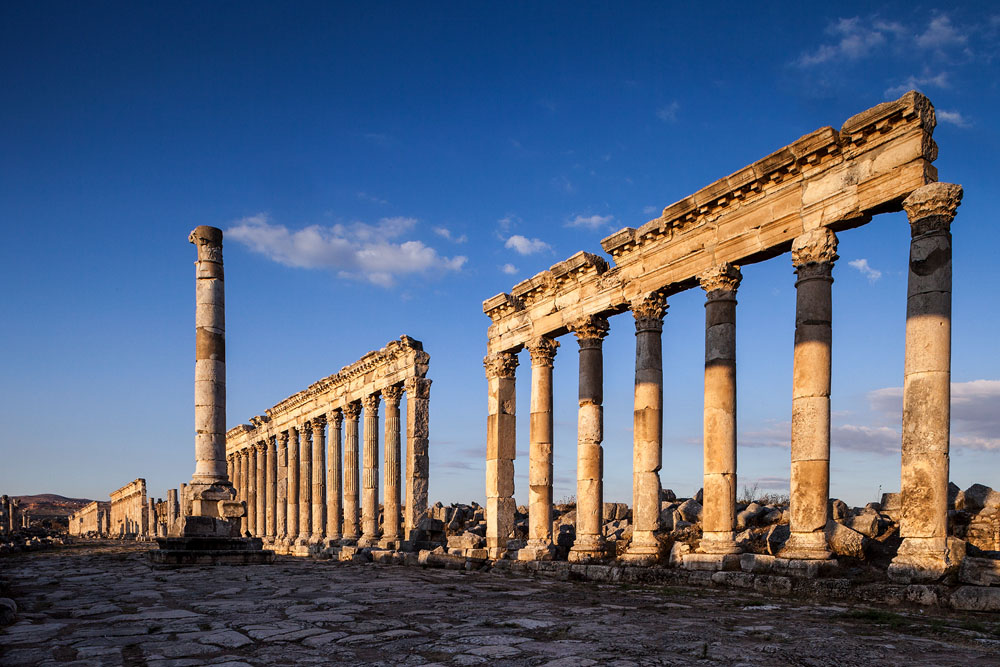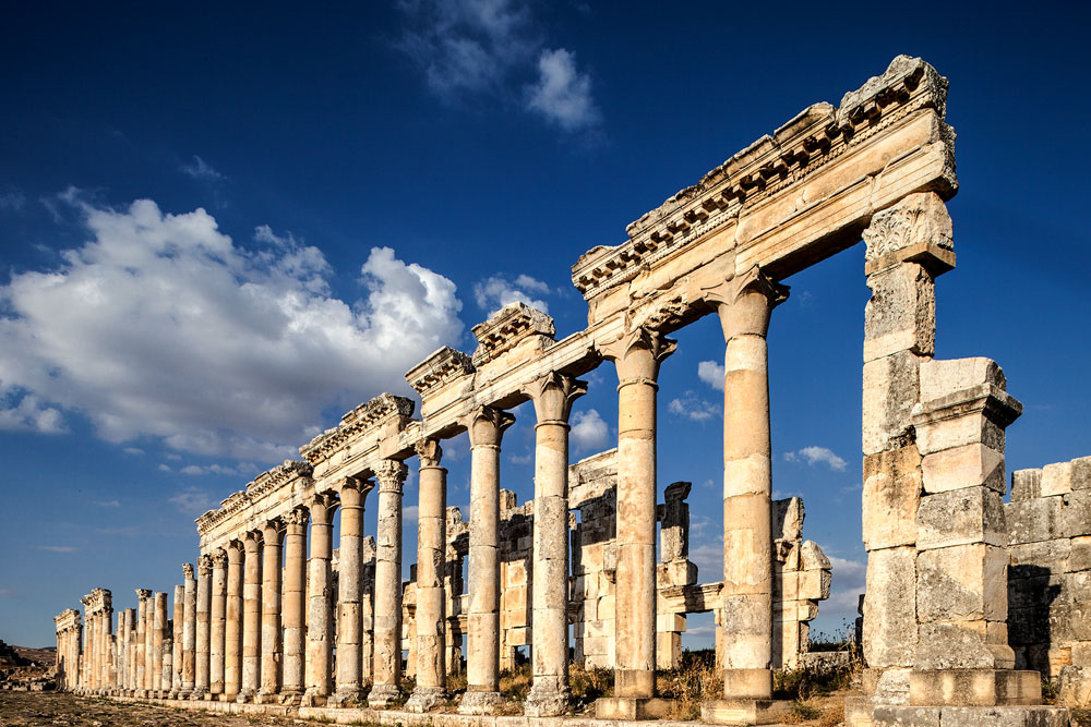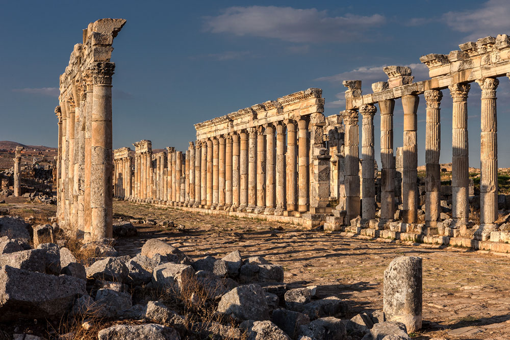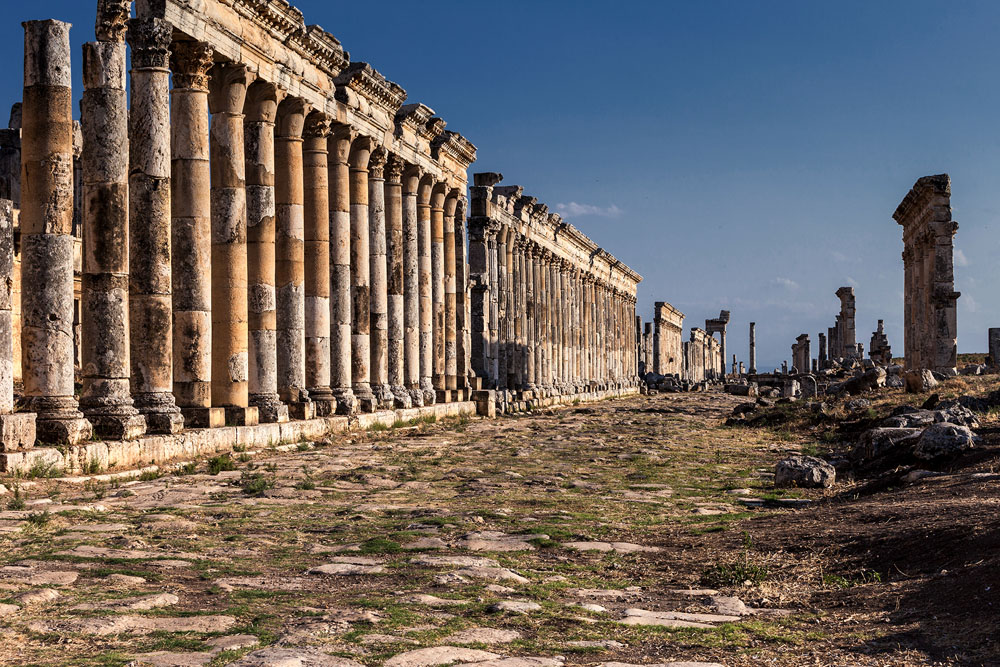 Ein Ort ganz anderer Art ist das zwischen Lattakia und Hama gelegene Apamea. Es war schon während der Altsteinzeit besiedelt wird aber erst von Bedeutung als Seleukos ein makedonischer Feldherr Alexanders des Großen und späterer König ihr den Namen seiner persischen Frau Apamea verleiht, und die Stadt zu neuer Blüte führt. Mit der hellenistischen Herrlichkeit ist es vorbei als 64 n. Chr. die Römer die Stadt besetzen. Aus jener Zeit stammen die meisten Gebäude, die wir heute in Apamea sehen, unter anderem die 2 km lange und 40 m breite Säulenallee die einzigartig ist. Als wir am späten Nachmittag Apamea erreichen, werfen die dorischen, ionischen und korinthischen Säulen bereits lange Schatten auf das Pflaster das einst unter den Schritten von Legionen und dem Hufschlag schwerer Reiterei geächzt haben mag. Es ist himmlisch ruhig. Keine lärmenden Touristen stören den Frieden der über Apamea liegt. Wir sind die einzigen Besucher. Der Wächter in seinem Ticketoffice verkauft uns für 150 Piaster die Eintrittskarten; sichtlich irritiert, dass man ihn noch so kurz vor Feierabend aus den Träumen weckt.