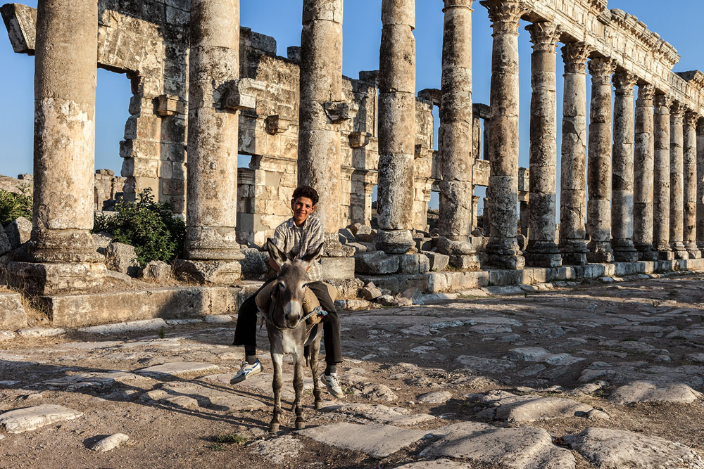 Begleitet werden wir bei unserem Weg durch die Stadt von einigen windigen Gestalten, die Antikes anpreisen: „Look Sir, I found this coin of Seleukos between the ruins, very early this morning. Look, Sir very cheap – I have five children…….“ Aber auch die Händler haben wir bald hinter uns gelassen; und dann ist da nur noch ein Junge auf einem Esel, der am Rande der Ruinenstadt Ziegen hütet. Ja; denke ich bei mir, so wird es wohl auch zu Zeiten der schönen Apamea gewesen sein.