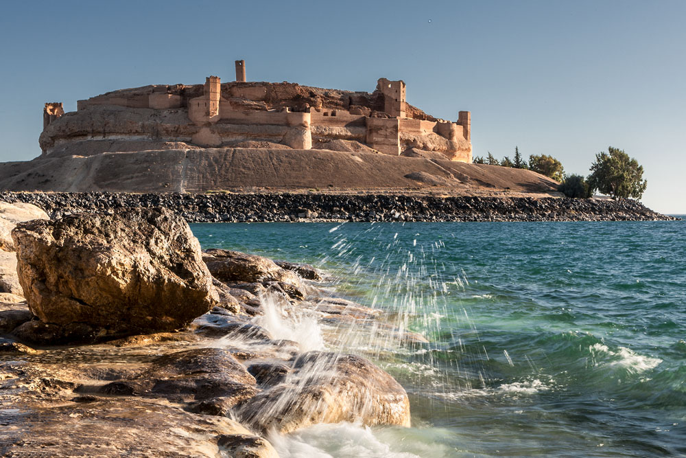 Nicht weit von der Kontrollstelle entfernt halten wir an einem kleinen Park. Ich schnappe mir Stativ und die schwere Kameraausrüstung. Ahmed schmunzelt. Wahrscheinlich denkt er; ohne das er mich das spüren lässt, warum schleppt dieser Idiot sich so ab. Auf den Parkbänken am Seeufer genießen Syrer die letzten Strahlen der wärmenden Oktobersonne. Ich bin enttäuscht. Die Burg liegt im Dunst und dann auch noch im Gegenlicht. Ahmed sieht die Enttäuschung in meinem Gesicht und wir packen schnell zusammen und verlassen den Ort meiner Niederlage. Immer weiter nach Westen am Euphrat entlang führt unser Weg, eine Wegkehre nach der anderen nehmen wir und plötzlich wie von Zauberhand liegt sie greifbar nah vor uns das Qal’at Djabr; im besten Abendlicht. Die Wogen des Sees klatschen gegen die Uferfelsen und erzeugen ein bisschen Gischt. Ahmed grinst mich an, als wolle er sagen – na, hab ich’s nicht gleich gesagt? Die Geschichte der Burg ist schnell erzählt. Die Festung an der strategisch bedeutsamen Stelle bestand schon bevor die Kreuzritter diese im 12. Jahrhundert ausbauten. Mehr als 100 Jahre schwappte das Kriegsglück über den alten Mauern hin und her. Nachdem die Kreuzritter den Stützpunkt aufgaben, hatten die Muslime nicht viel Spaß an ihrer Eroberung die im Mongolensturm des 13. Jahrhundert endgültig in Schutt und Asche fiel.