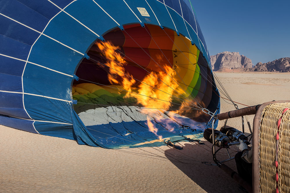Er entscheidet: „Wir fahren“ ! Schnell ist der Korb aufgestellt, die Hülle ausgebreitet und die Brenner angeworfen. 15 Minuten später heben wir ab. Up, up and away in a beautiful balloon ! Immer höher steigen wir. Unter uns gleitet die Wüste ruhig und still dahin – ich hänge meinen Gedanken nach, die wieder einmal die eines anderen sind: