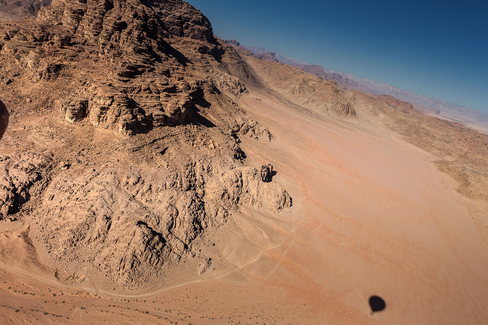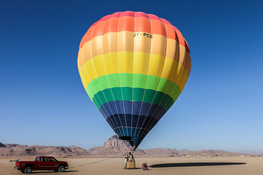 Um 5:45 Uhr stehen wir leicht fröstelnd vor dem Camp und warten. Es weht ein stetiger Wind nach Westen. Keine guten Voraussetzungen für die Ballonfahrt, denn dort liegt Israel und da will hier niemand hin – das kann zu diplomatischen Verwicklungen führen. Gegen 6:00 Uhr fährt ein Pick-up vor. Am Steuer sitzt Laszlo, ein verrückter Ungar, der während der Fahrt sein Frühstück bestehend aus einem Erdbeer-Shake und Paprika-Chips einnimmt. Isst man das heutzutage so ? Egal. Wir fahren mehr als 1 Stunde durch die Wüste, bis wir zu einem Platz kommen, an dem Captain Khaled mit dem Ballon auf uns wartet.